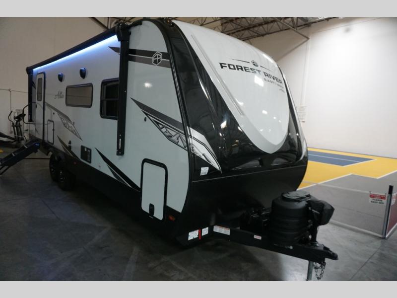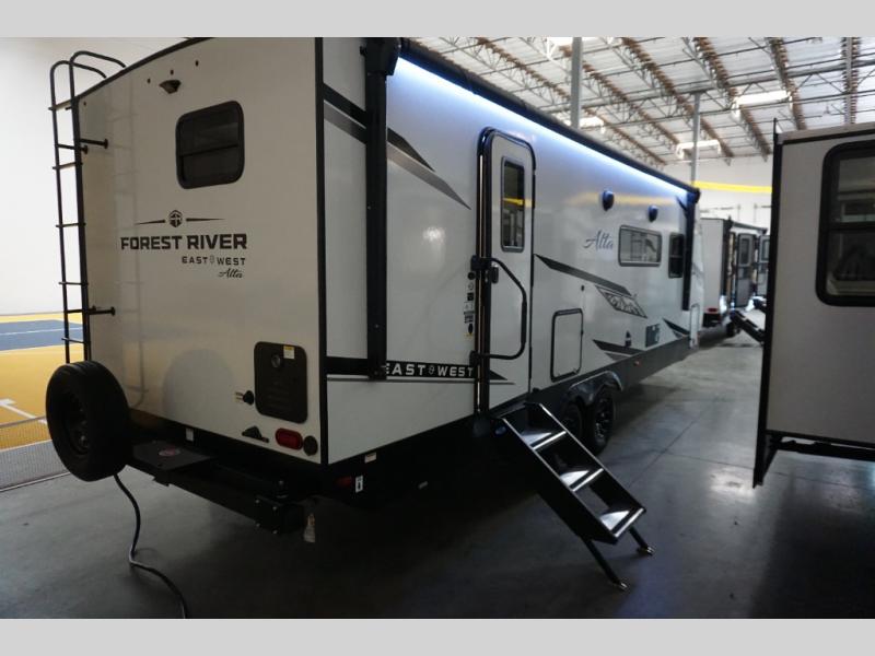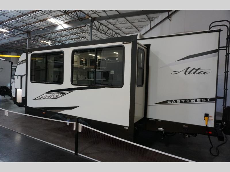 Each Alta travel trailer or toy hauler by EAST TO WEST is constructed with a 5" vacuum bonded roof, an enclosed and heated underbelly, and diamond plate front rock guard for added protection. Outside, you'll find marine-grade exterior speakers, a universal docking station, and back-up camera prep that can be added to make maneuvering in and out of campgrounds easier than ever. Inside, there are 4k interior LED lights, solid pressed membrane countertops, black roller shades, and many more interior comforts you are sure to love.
