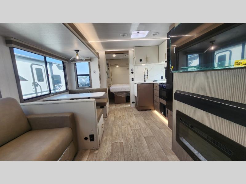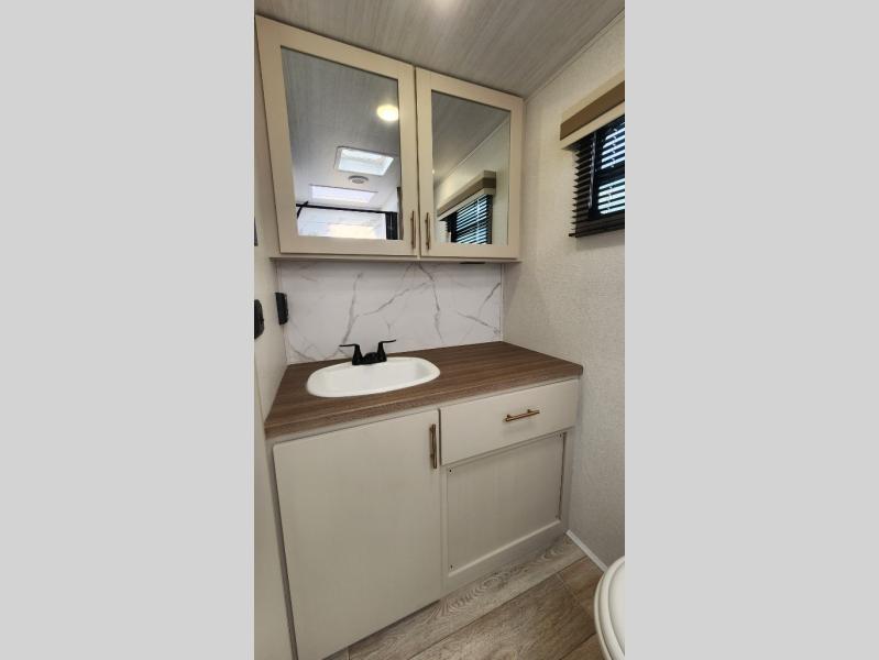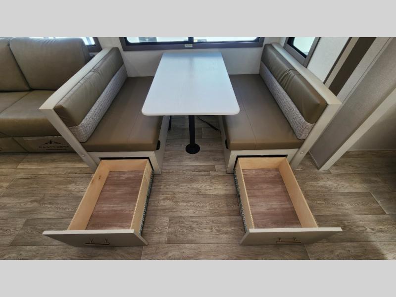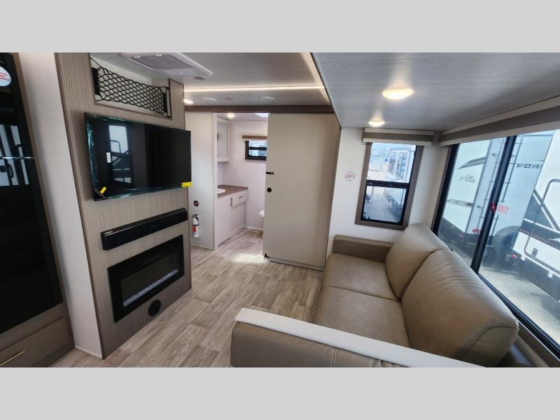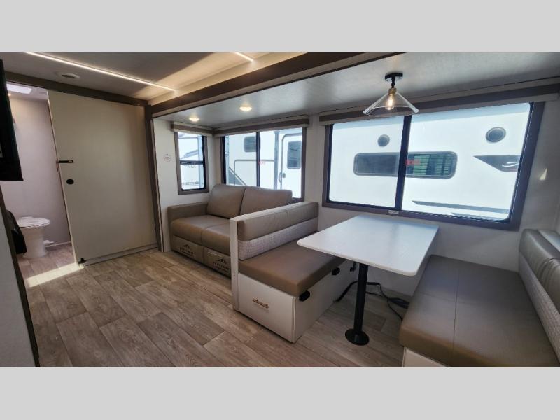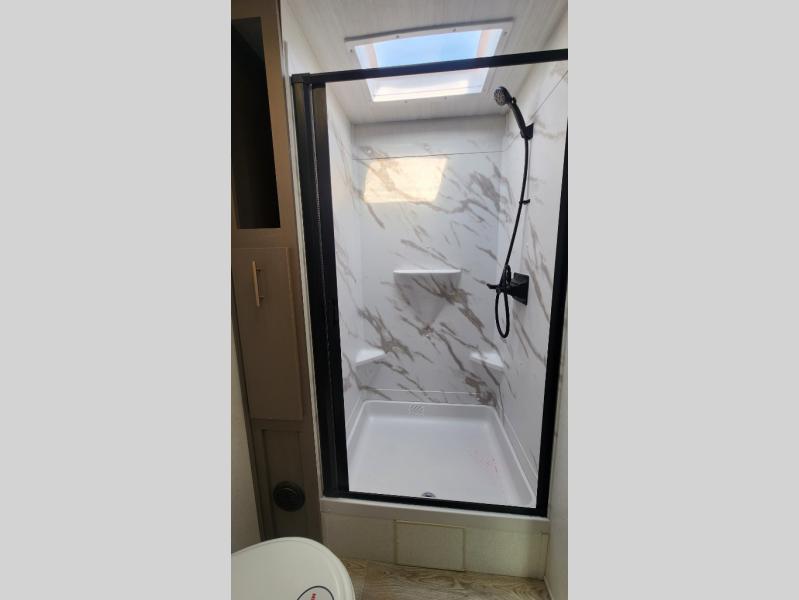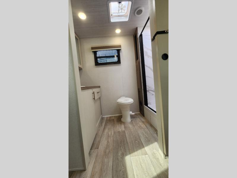 Wow! Check out the spacious full rear bath in this travel trailer for five! You'll appreciate a linen closet here and a shower skylight to let natural light in. Your crew can get comfortable on the tri-fold sofa that sits directly across from the fireplace for a more cozy feel. There is also a booth dinette here with storage space underneath for board games. Head to the kitchen to prepare dinner on the three burner cooktop, and use the countertop extension to cut fresh fruits and vegetables. A front private bedroom with a king bed and dual wardrobes will have you feeling right at home. Start camping today!