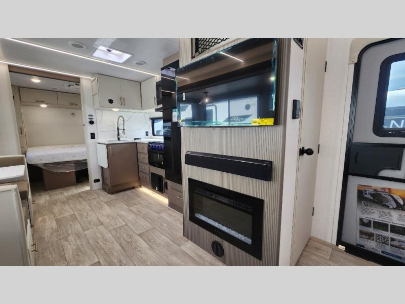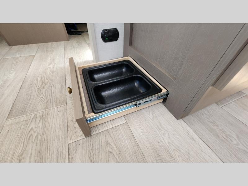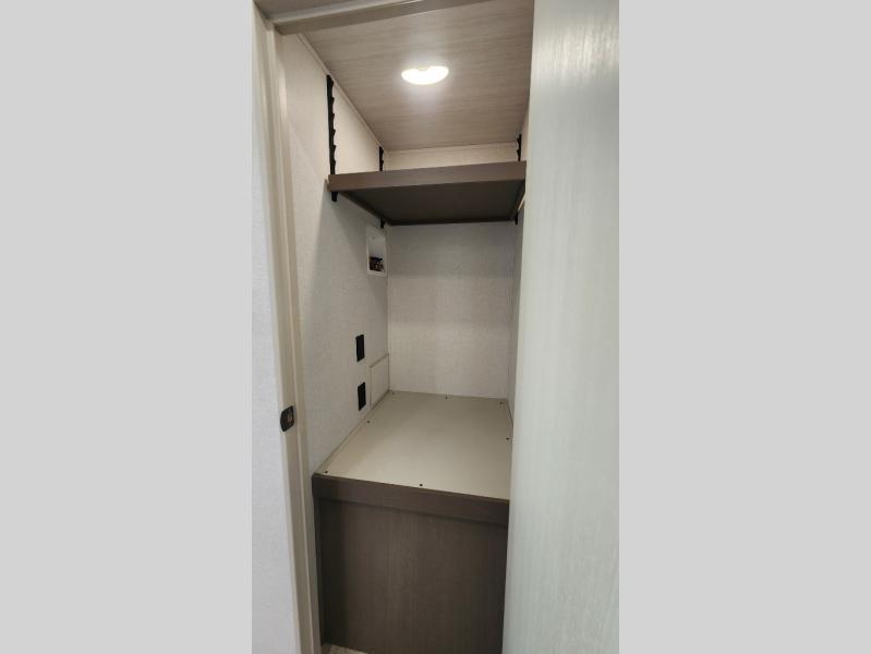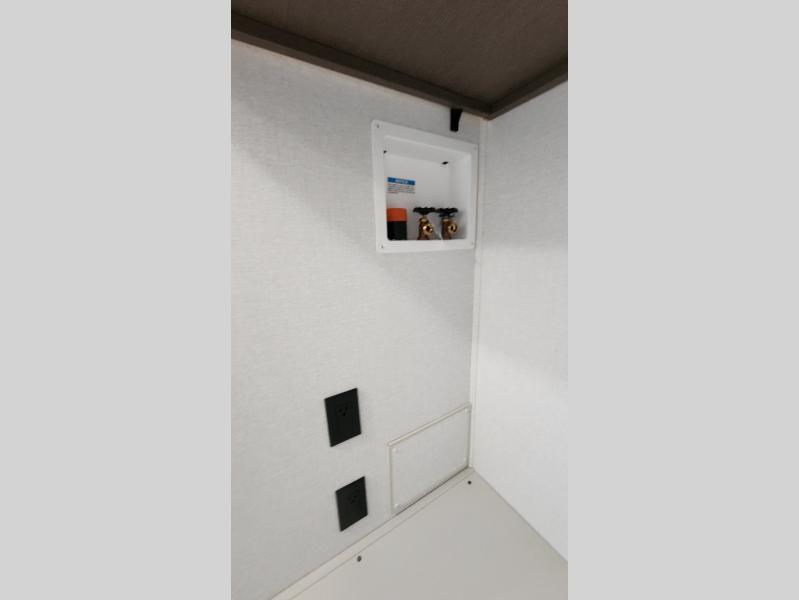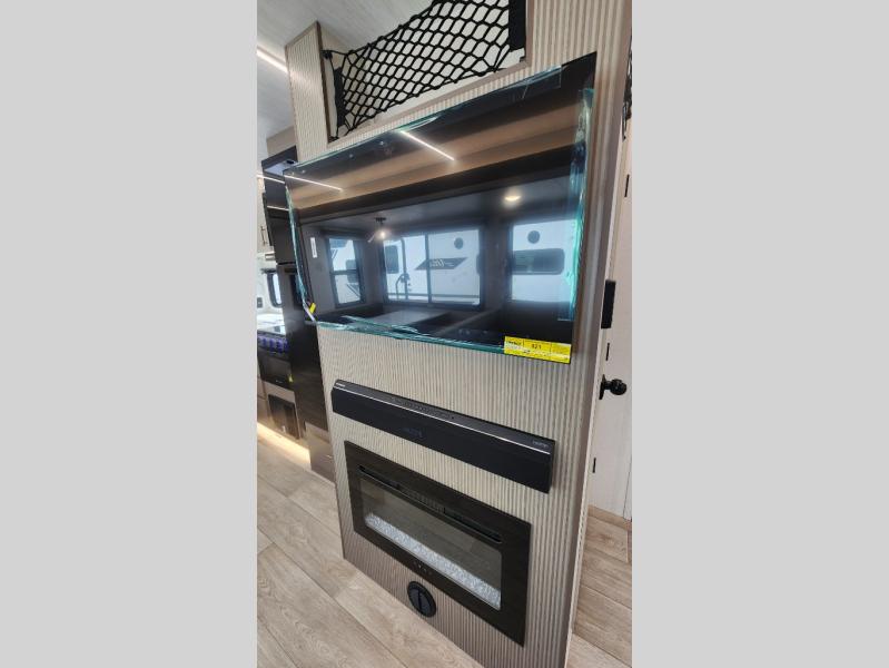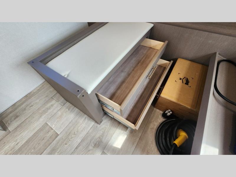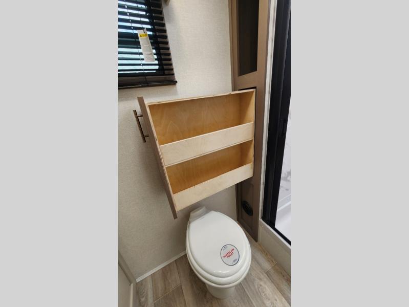 Wow! Check out the spacious full rear bath in this travel trailer for five! You'll appreciate a linen closet here and a shower skylight to let natural light in. Your crew can get comfortable on the tri-fold sofa that sits directly across from the fireplace for a more cozy feel. There is also a booth dinette here with storage space underneath for board games. Head to the kitchen to prepare dinner on the three burner cooktop, and use the countertop extension to cut fresh fruits and vegetables. A front private bedroom with a king bed and dual wardrobes will have you feeling right at home. Start camping today!
