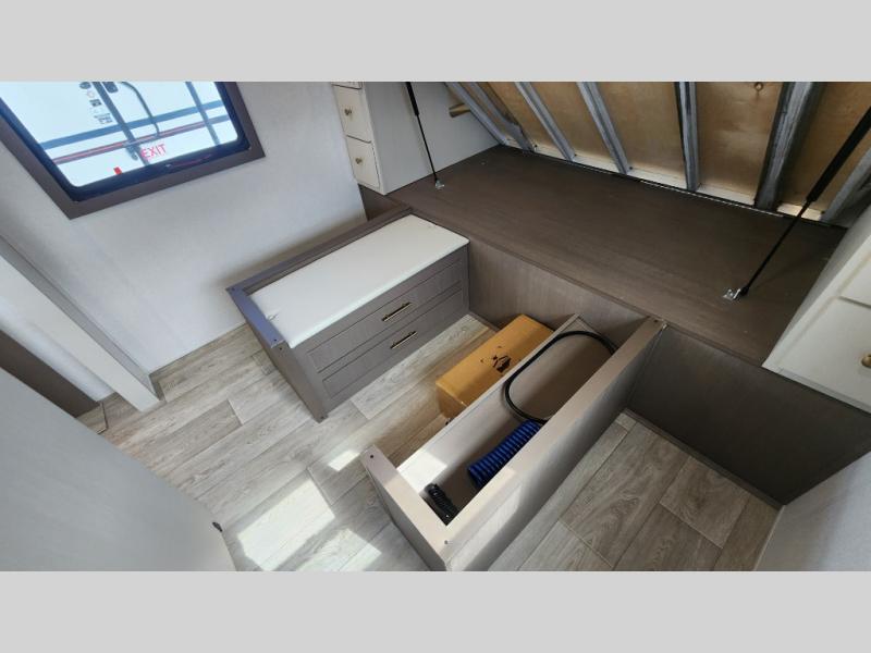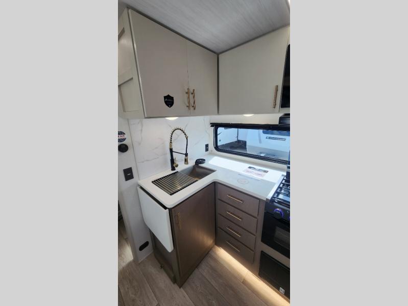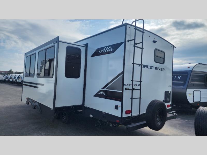 Each Alta travel trailer or toy hauler by EAST TO WEST is constructed with a 5" vacuum bonded roof, an enclosed and heated underbelly, and diamond plate front rock guard for added protection. Outside, you'll find marine-grade exterior speakers, a universal docking station, and back-up camera prep that can be added to make maneuvering in and out of campgrounds easier than ever. Inside, there are 4k interior LED lights, solid pressed membrane countertops, black roller shades, and many more interior comforts you are sure to love.