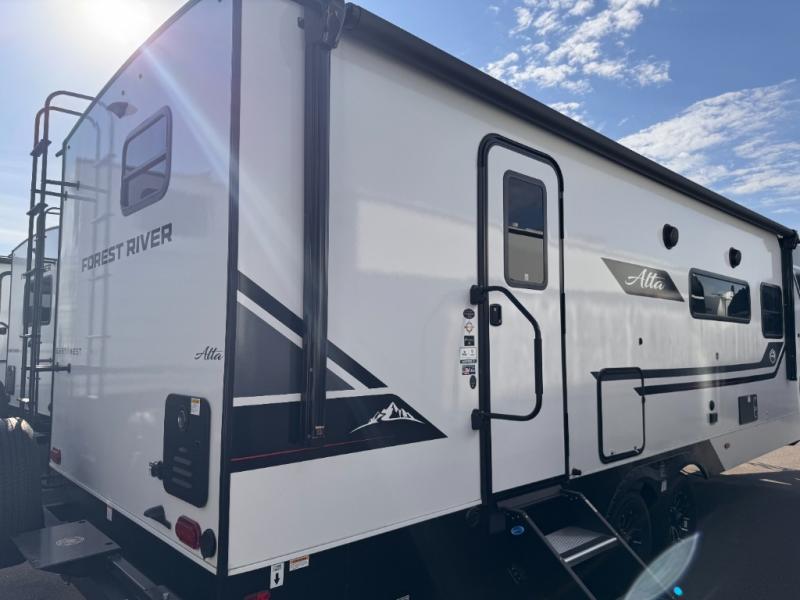 Each Alta travel trailer or toy hauler by EAST TO WEST is constructed with a 5" vacuum bonded roof, an enclosed and heated underbelly, and diamond plate front rock guard for added protection. Outside, you'll find marine-grade exterior speakers, a universal docking station, and back-up camera prep that can be added to make maneuvering in and out of campgrounds easier than ever. Inside, there are 4k interior LED lights, solid pressed membrane countertops, black roller shades, and many more interior comforts you are sure to love.