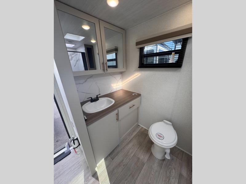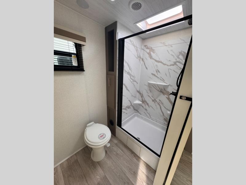 Wow! Check out the spacious full rear bath in this travel trailer for five! You'll appreciate a linen closet here and a shower skylight to let natural light in. Your crew can get comfortable on the tri-fold sofa that sits directly across from the fireplace for a more cozy feel. There is also a booth dinette here with storage space underneath for board games. Head to the kitchen to prepare dinner on the three burner cooktop, and use the countertop extension to cut fresh fruits and vegetables. A front private bedroom with a king bed and dual wardrobes will have you feeling right at home. Start camping today!