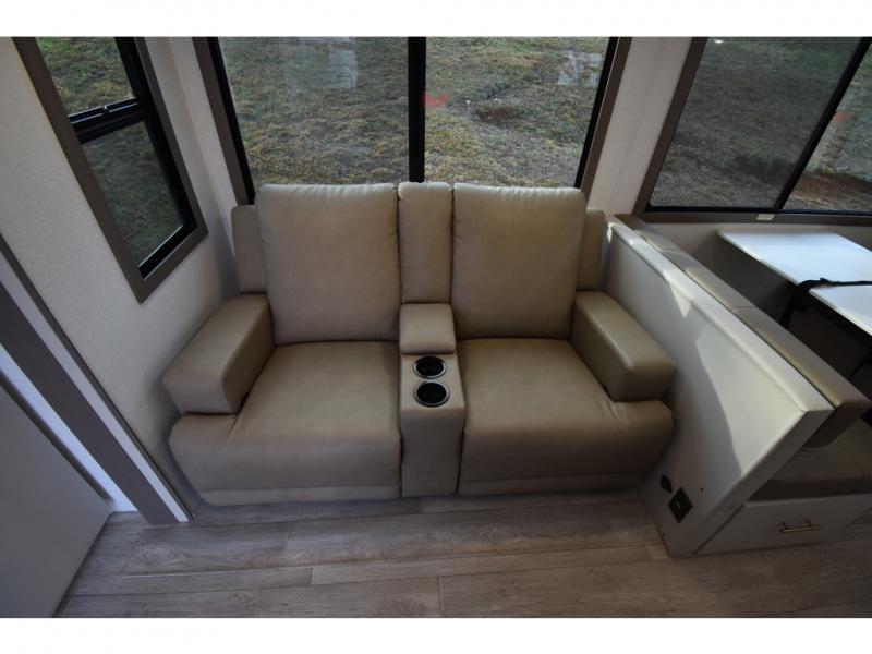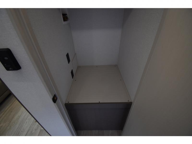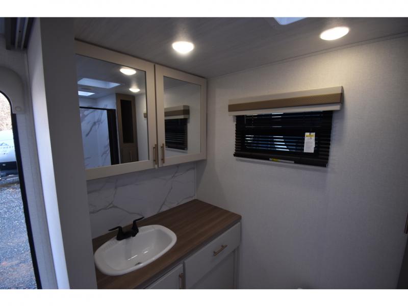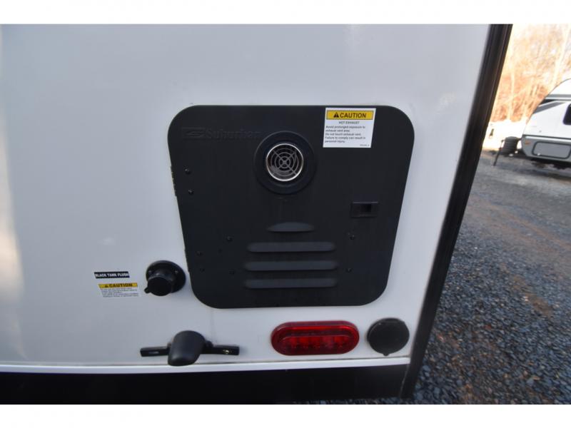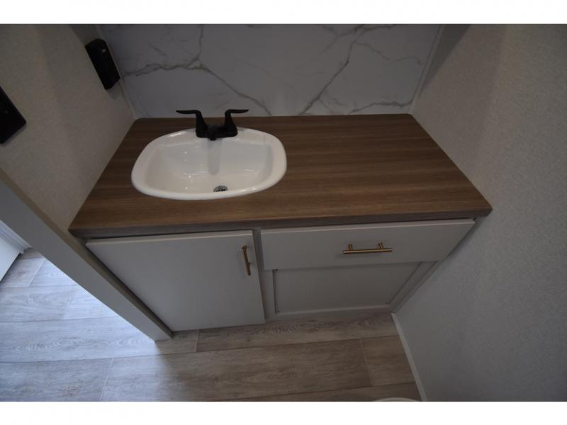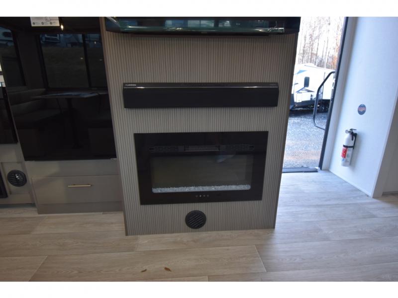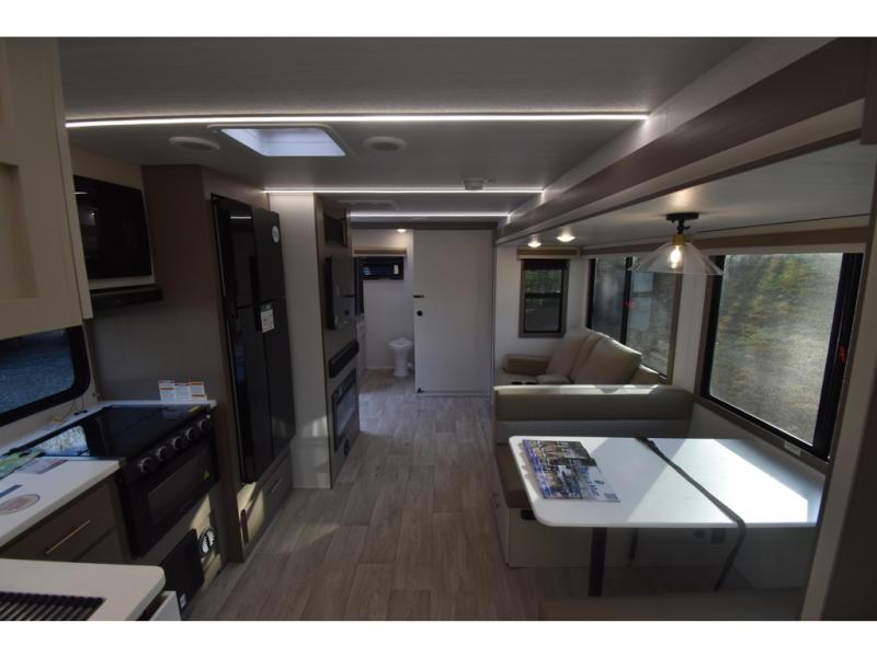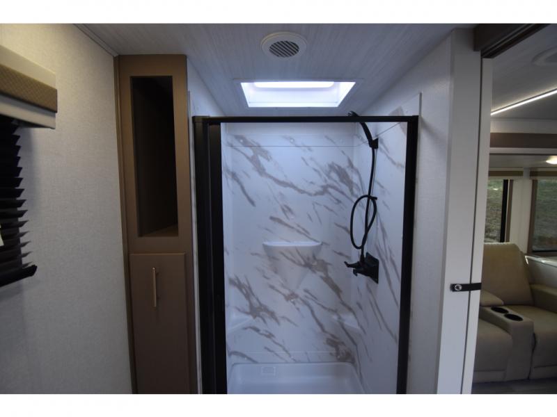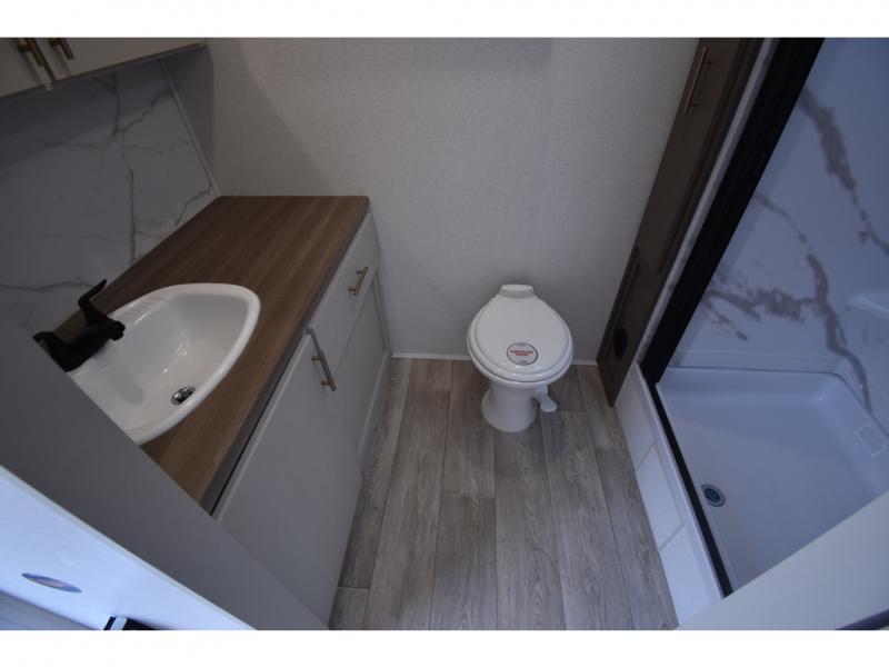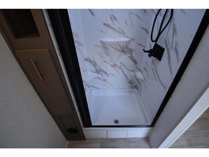 Wow! Check out the spacious full rear bath in this travel trailer for five! You'll appreciate a linen closet here and a shower skylight to let natural light in. Your crew can get comfortable on the tri-fold sofa that sits directly across from the fireplace for a more cozy feel. There is also a booth dinette here with storage space underneath for board games. Head to the kitchen to prepare dinner on the three burner cooktop, and use the countertop extension to cut fresh fruits and vegetables. A front private bedroom with a king bed and dual wardrobes will have you feeling right at home. Start camping today!