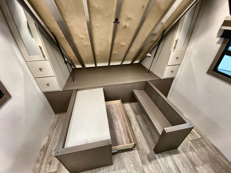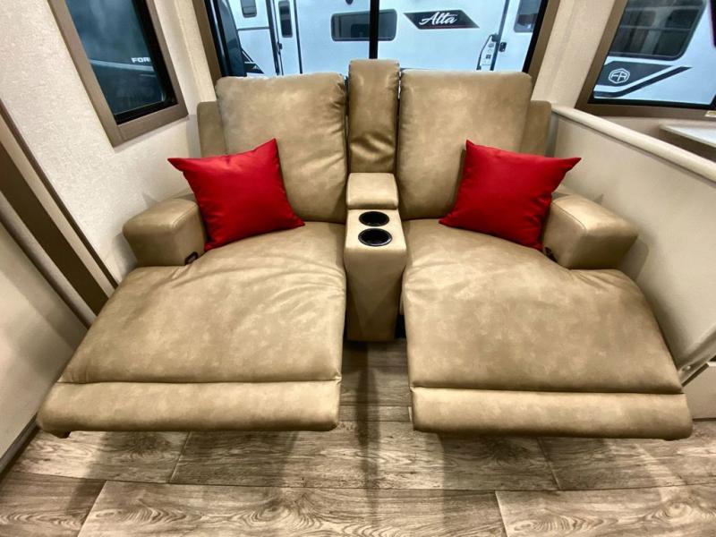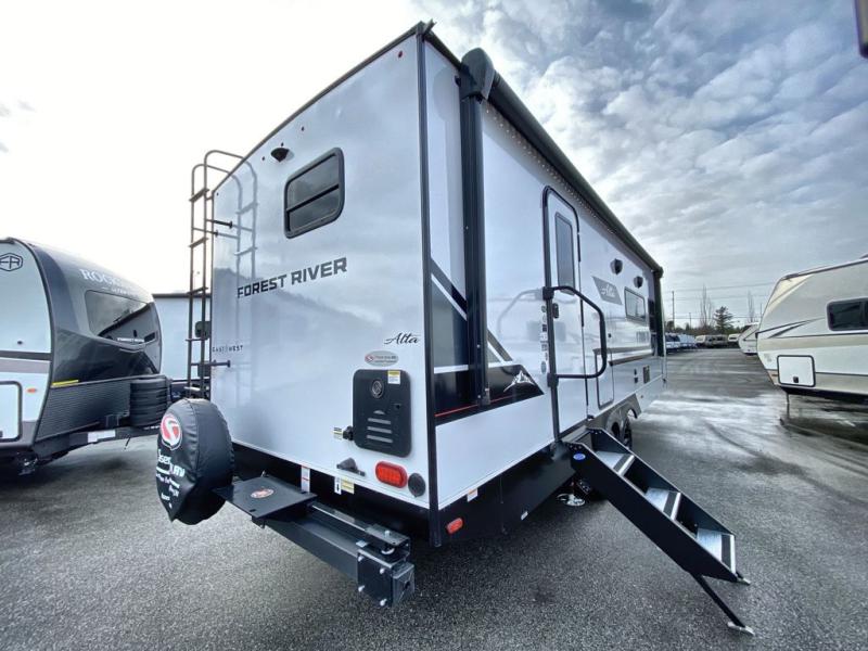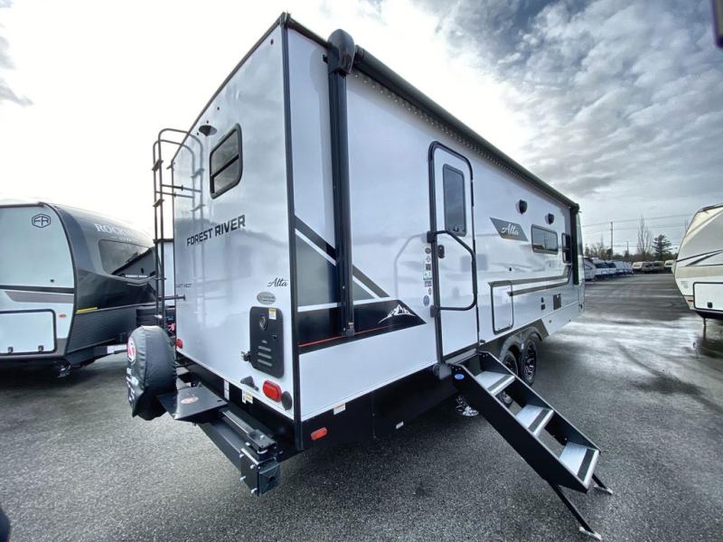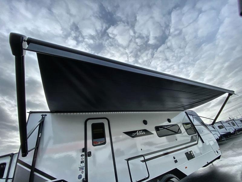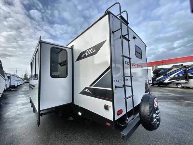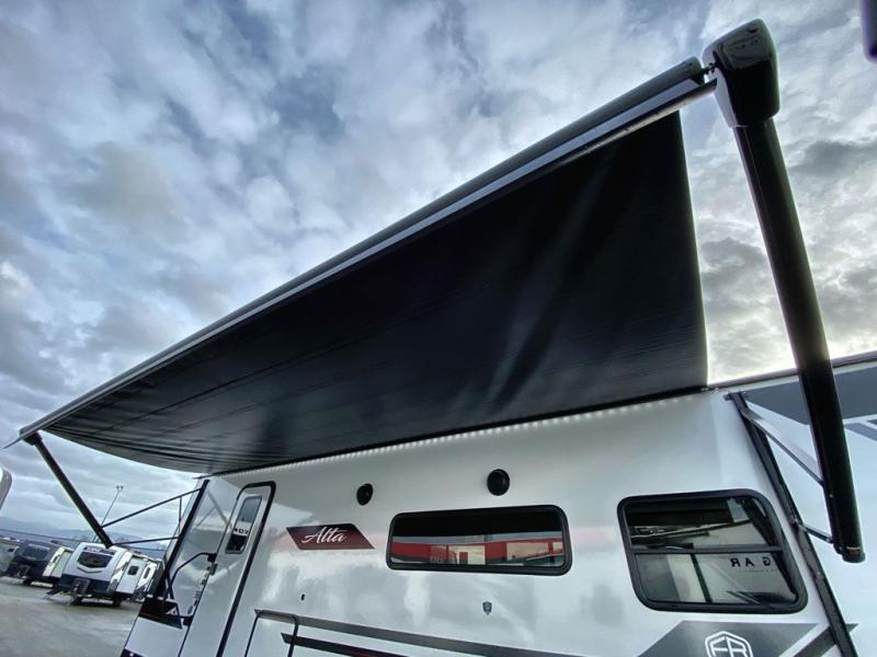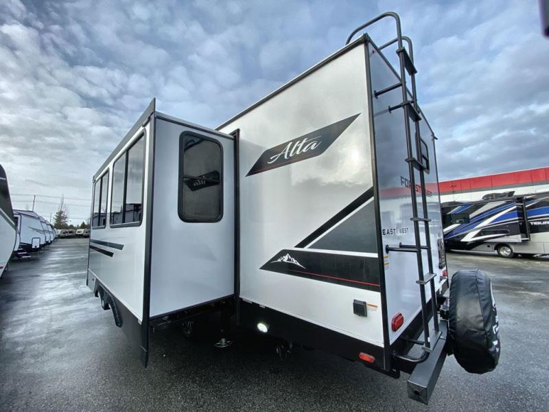 Each Alta travel trailer or toy hauler by EAST TO WEST is constructed with a 5" vacuum bonded roof, an enclosed and heated underbelly, and diamond plate front rock guard for added protection. Outside, you'll find marine-grade exterior speakers, a universal docking station, and back-up camera prep that can be added to make maneuvering in and out of campgrounds easier than ever. Inside, there are 4k interior LED lights, solid pressed membrane countertops, black roller shades, and many more interior comforts you are sure to love.