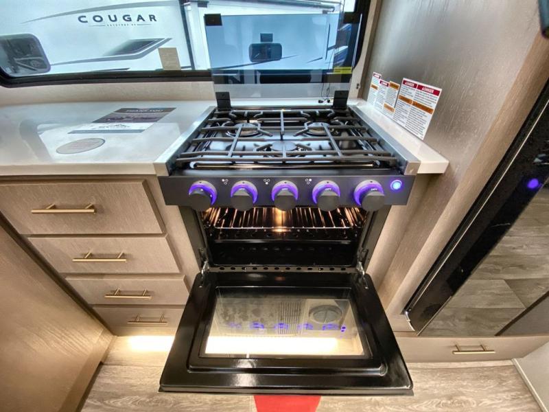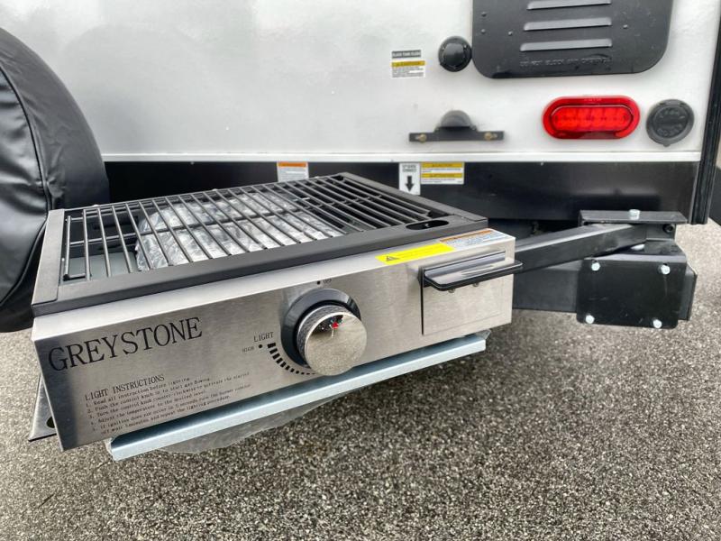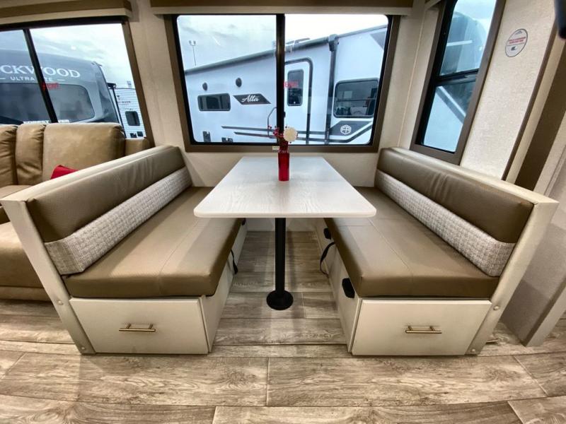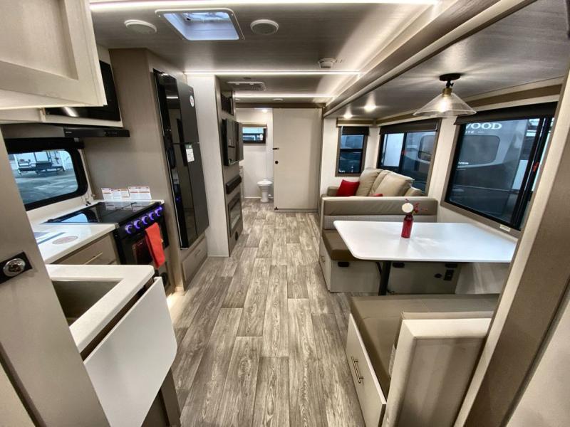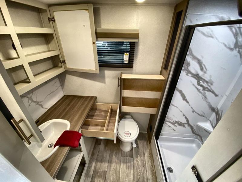 Wow! Check out the spacious full rear bath in this travel trailer for five! You'll appreciate a linen closet here and a shower skylight to let natural light in. Your crew can get comfortable on the tri-fold sofa that sits directly across from the fireplace for a more cozy feel. There is also a booth dinette here with storage space underneath for board games. Head to the kitchen to prepare dinner on the three burner cooktop, and use the countertop extension to cut fresh fruits and vegetables. A front private bedroom with a king bed and dual wardrobes will have you feeling right at home. Start camping today!