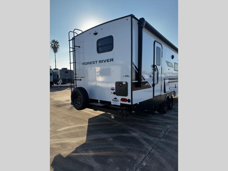 Each Alta travel trailer or toy hauler by EAST TO WEST is constructed with a 5" vacuum bonded roof, an enclosed and heated underbelly, and diamond plate front rock guard for added protection. Outside, you'll find marine-grade exterior speakers, a universal docking station, and back-up camera prep that can be added to make maneuvering in and out of campgrounds easier than ever. Inside, there are 4k interior LED lights, solid pressed membrane countertops, black roller shades, and many more interior comforts you are sure to love.