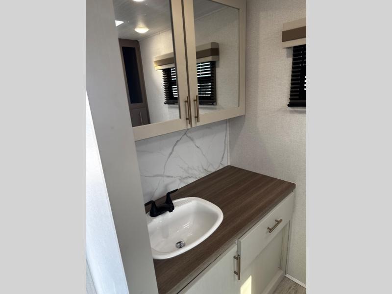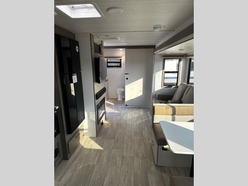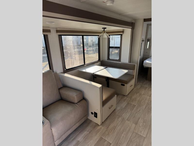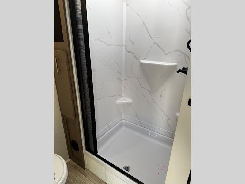 Wow! Check out the spacious full rear bath in this travel trailer for five! You'll appreciate a linen closet here and a shower skylight to let natural light in. Your crew can get comfortable on the tri-fold sofa that sits directly across from the fireplace for a more cozy feel. There is also a booth dinette here with storage space underneath for board games. Head to the kitchen to prepare dinner on the three burner cooktop, and use the countertop extension to cut fresh fruits and vegetables. A front private bedroom with a king bed and dual wardrobes will have you feeling right at home. Start camping today!