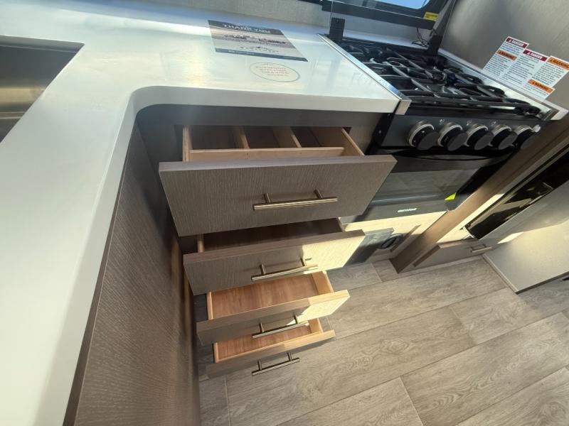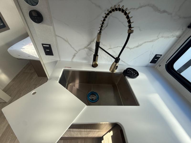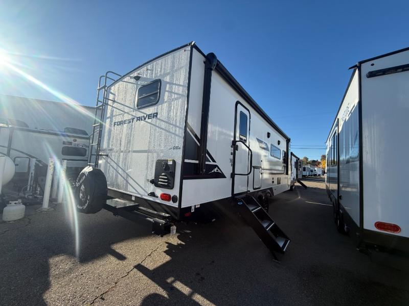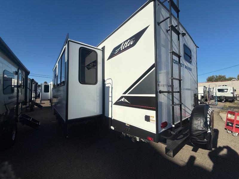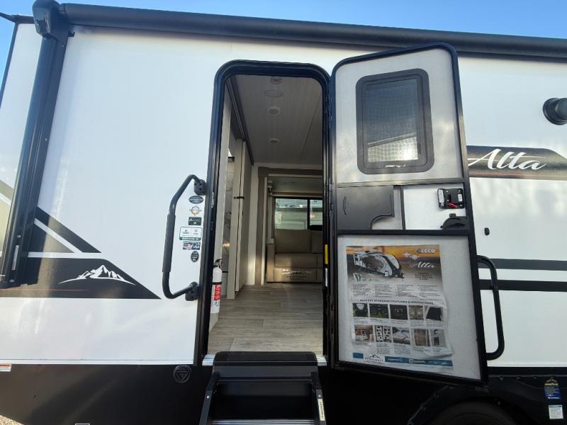Each Alta travel trailer or toy hauler by EAST TO WEST is constructed with a 5" vacuum bonded roof, an enclosed and heated underbelly, and diamond plate front rock guard for added protection. Outside, you'll find exterior LED lights, a universal docking station, and back-up camera prep that can be added to make maneuvering in and out of campgrounds easier than ever. Inside, there are upgraded residential-inspired linoleum flooring, solid pressed membrane countertops, black roller shades, and many more interior comforts you are sure to love.