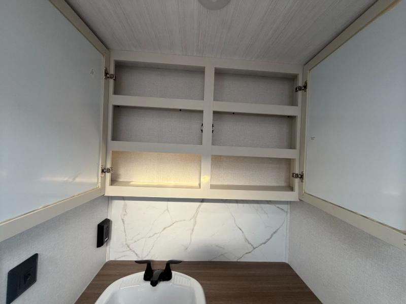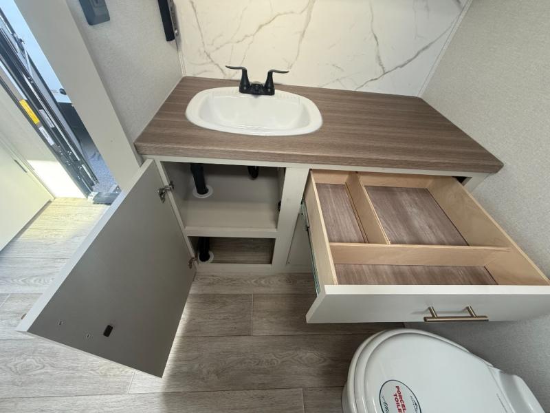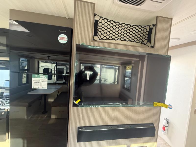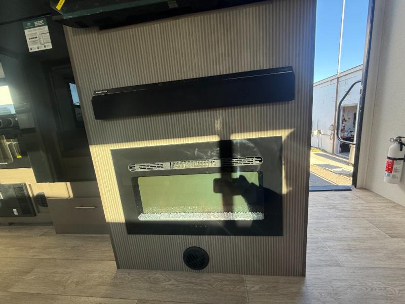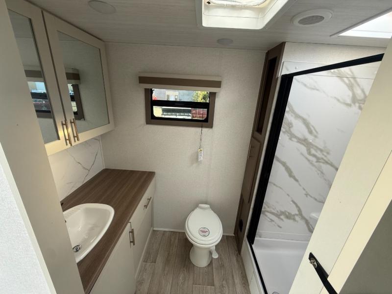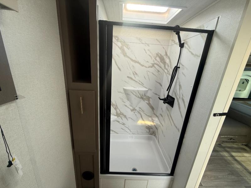 Wow! Check out the spacious full rear bath in this travel trailer for five! You'll appreciate a linen closet here and a shower skylight to let natural light in. Your crew can get comfortable on the tri-fold sofa that sits directly across from the fireplace for a more cozy feel. There is also a booth dinette here with storage space underneath for board games. Head to the kitchen to prepare dinner on the three burner cooktop and use the countertop extension to cut fresh fruits and vegetables. A front private bedroom with a king bed and dual wardrobes will have you feeling right at home. Start camping today!