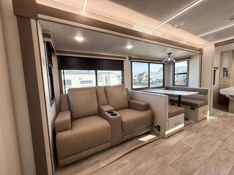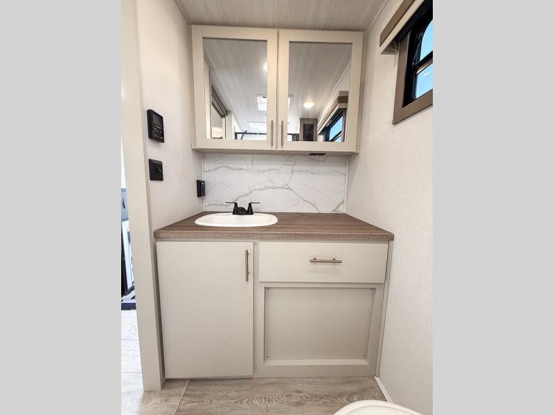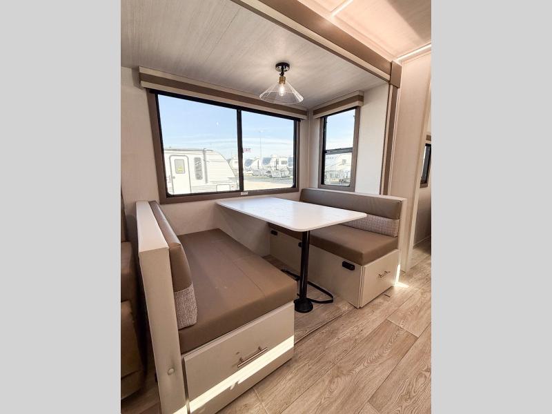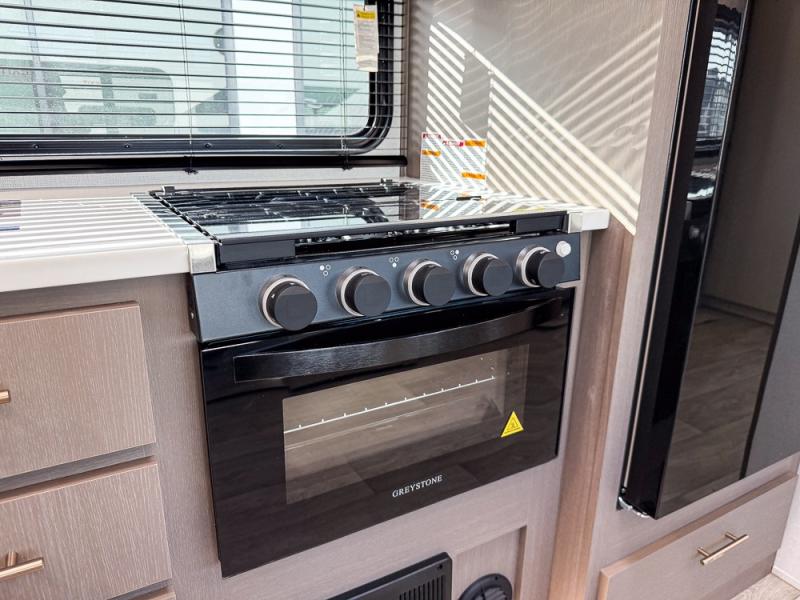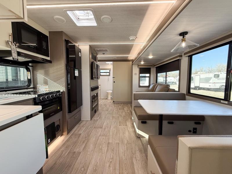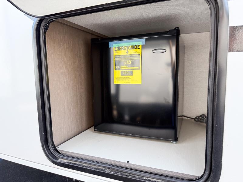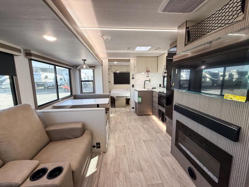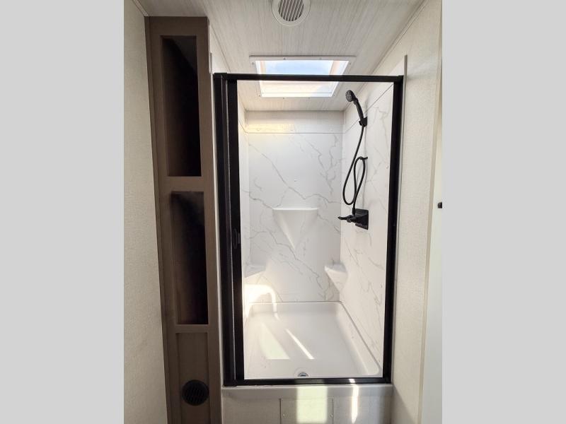 Wow! Check out the spacious full rear bath in this travel trailer for five! You'll appreciate a linen closet here and a shower skylight to let natural light in. Your crew can get comfortable on the tri-fold sofa that sits directly across from the fireplace for a more cozy feel. There is also a booth dinette here with storage space underneath for board games. Head to the kitchen to prepare dinner on the three burner cooktop and use the countertop extension to cut fresh fruits and vegetables. A front private bedroom with a king bed and dual wardrobes will have you feeling right at home. Start camping today!