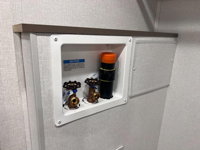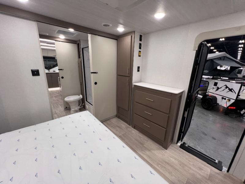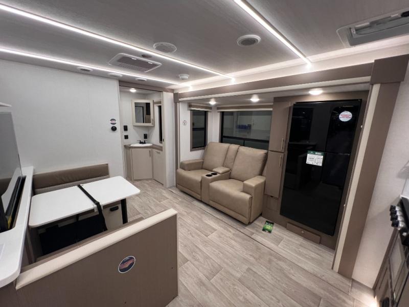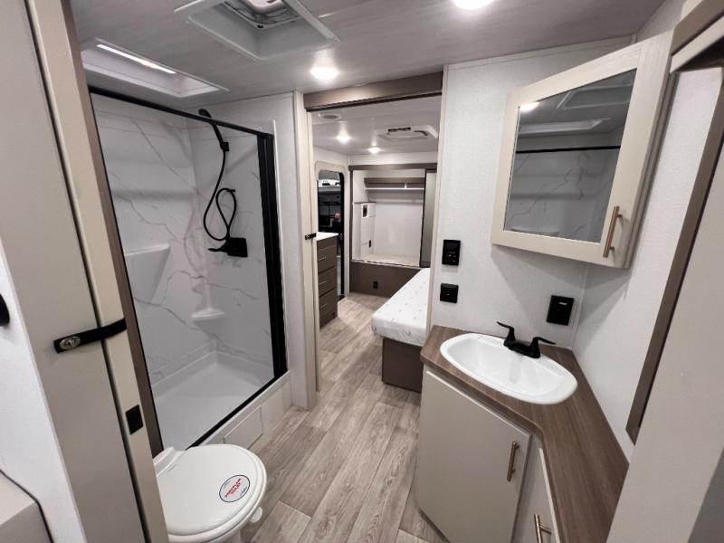 As you step into this travel trailer, you’re greeted by a fully equipped front kitchen featuring a three-burner range, generous counter space, and a sleek 10.7 cu. ft. black-glass refrigerator housed in the slide out giving you everything you need to prepare meals with ease. The slide out also includes a tri-fold sofa that provides a comfortable place to relax and can convert into extra sleeping space when needed. Between the sofa and refrigerator, a convenient pantry keeps all your dry goods organized. Across the way, the booth dinette offers the perfect spot to share meals, play games, or unwind while enjoying the telescoping 50" TV after a full day of adventure. Moving through the center of the trailer, the walk-through bathroom features a 30" x 36" shower with a skylight, a linen closet for towels and toiletries, and a porcelain foot-flush toilet so you can freshen up without relying on campsite facilities. At the rear, the private bedroom provides a spacious retreat with a king bed housed in its own slide out for added comfort, along with a dresser and a large rear wardrobe to keep clothing and gear neatly stored. For added convenience, the bedroom also includes its own second entry door.