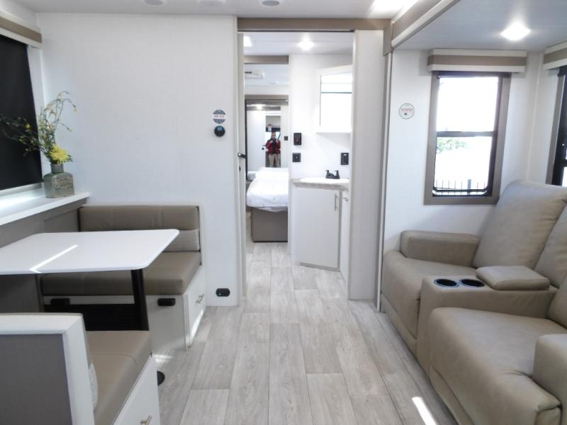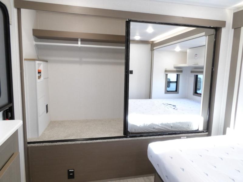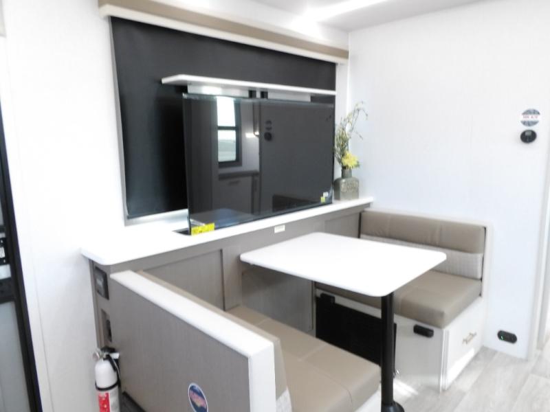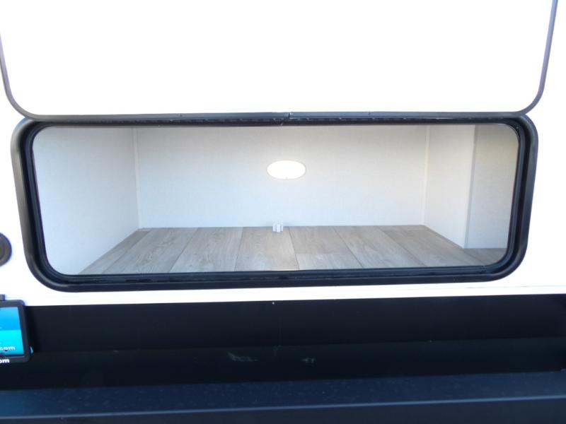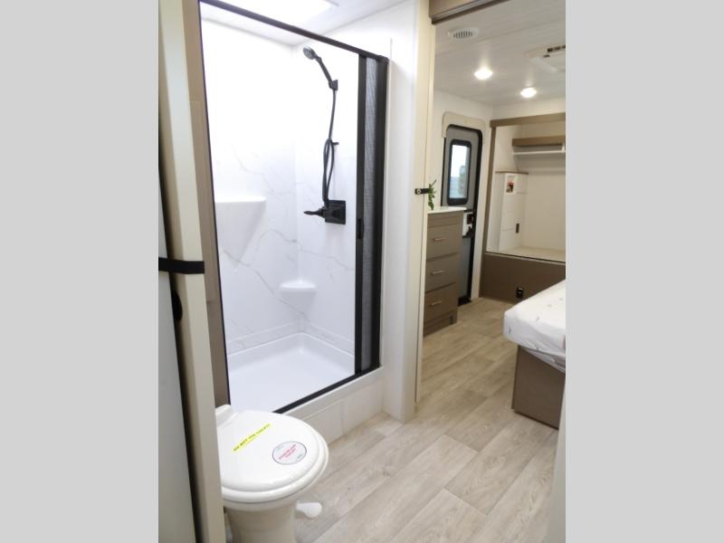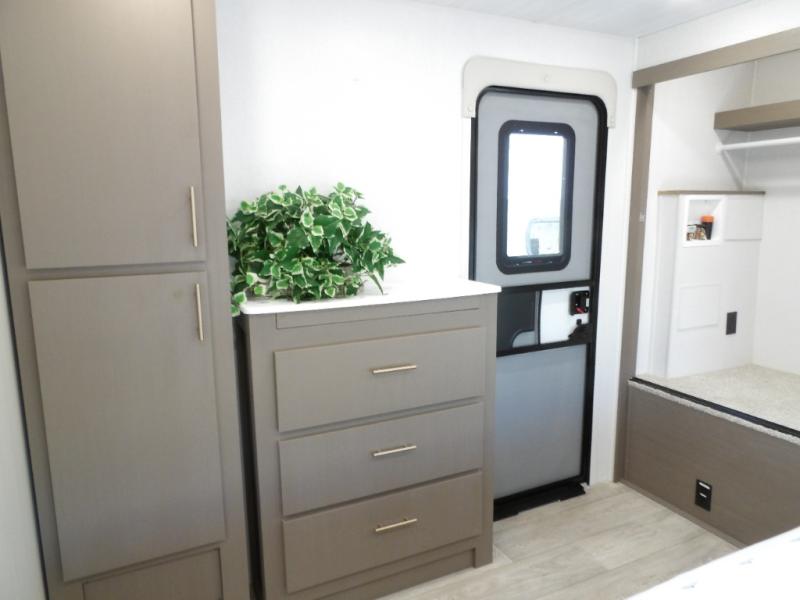 As you step into this travel trailer, you’re greeted by a fully equipped front kitchen featuring a three-burner range, generous counter space, and a sleek 10.7 cu. ft. black-glass refrigerator housed in the slide out giving you everything you need to prepare meals with ease. The slide out also includes a tri-fold sofa that provides a comfortable place to relax and can convert into extra sleeping space when needed. Between the sofa and refrigerator, a convenient pantry keeps all your dry goods organized. Across the way, the booth dinette offers the perfect spot to share meals, play games, or unwind while enjoying the telescoping 50" TV after a full day of adventure. Moving through the center of the trailer, the walk-through bathroom features a 30" x 36" shower with a skylight, a linen closet for towels and toiletries, and a porcelain foot-flush toilet so you can freshen up without relying on campsite facilities. At the rear, the private bedroom provides a spacious retreat with a king bed housed in its own slide out for added comfort, along with a dresser and a large rear wardrobe to keep clothing and gear neatly stored. For added convenience, the bedroom also includes its own second entry door.