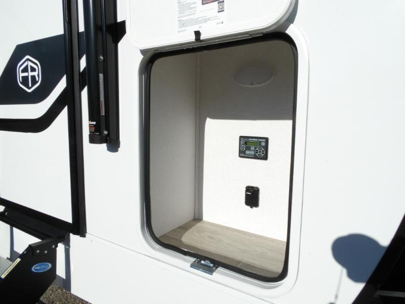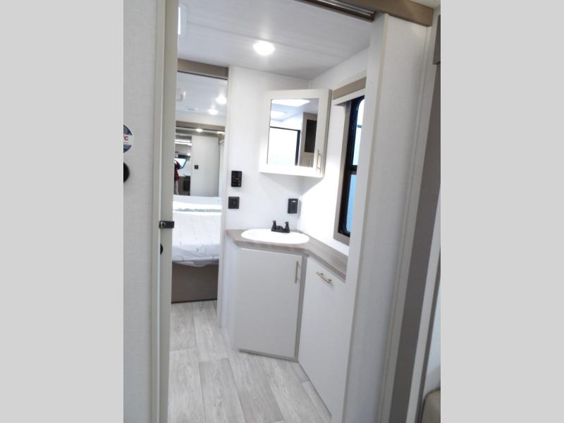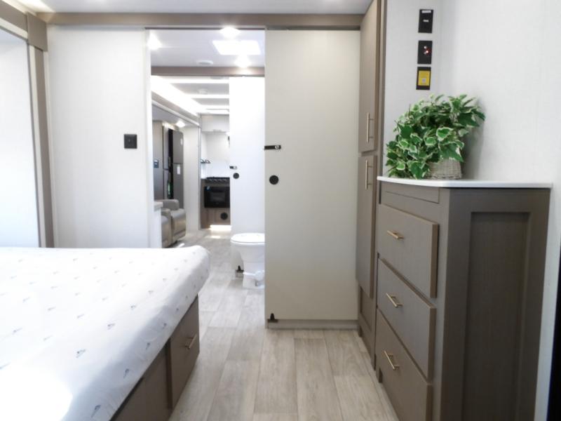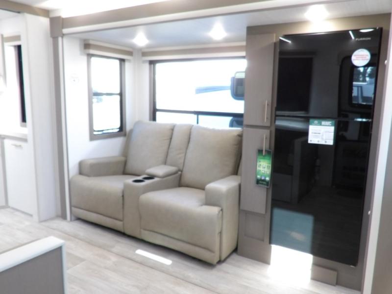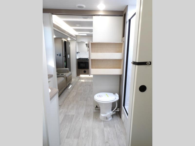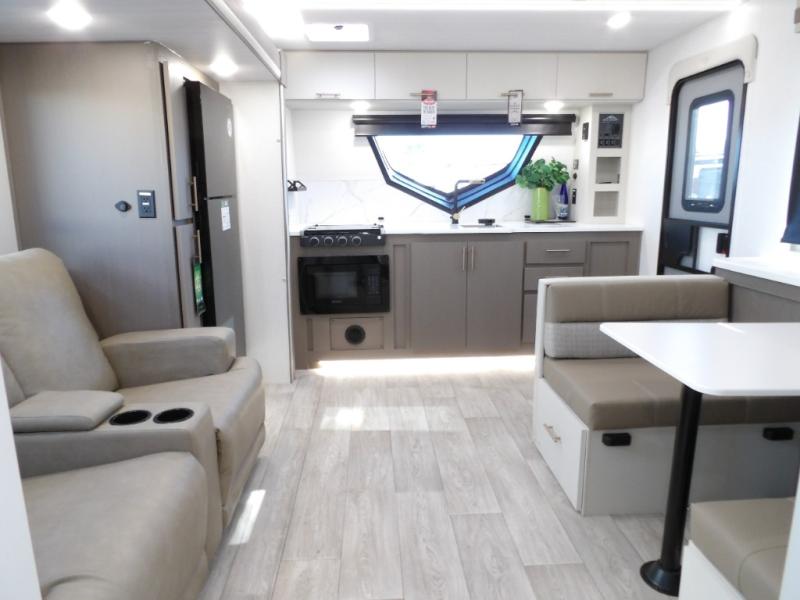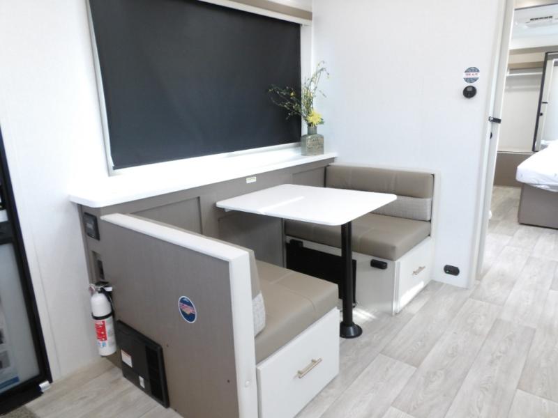 As you step into this travel trailer, you’re greeted by a fully equipped front kitchen featuring a three-burner range, generous counter space, and a sleek 10.7 cu. ft. black-glass refrigerator housed in the slide out giving you everything you need to prepare meals with ease. The slide out also includes a tri-fold sofa that provides a comfortable place to relax and can convert into extra sleeping space when needed. Between the sofa and refrigerator, a convenient pantry keeps all your dry goods organized. Across the way, the booth dinette offers the perfect spot to share meals, play games, or unwind while enjoying the telescoping 50" TV after a full day of adventure. Moving through the center of the trailer, the walk-through bathroom features a 30" x 36" shower with a skylight, a linen closet for towels and toiletries, and a porcelain foot-flush toilet so you can freshen up without relying on campsite facilities. At the rear, the private bedroom provides a spacious retreat with a king bed housed in its own slide out for added comfort, along with a dresser and a large rear wardrobe to keep clothing and gear neatly stored. For added convenience, the bedroom also includes its own second entry door.