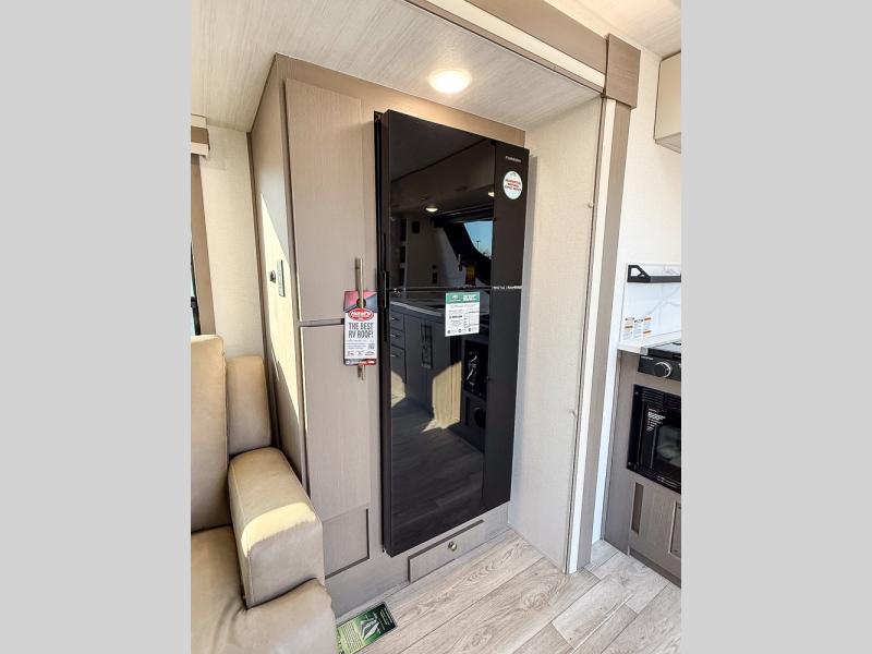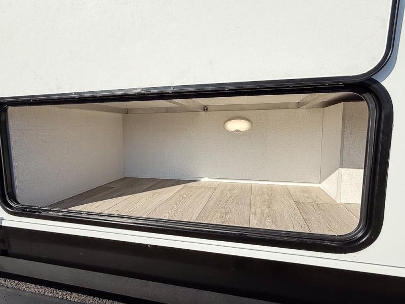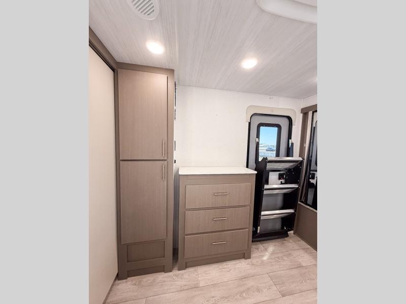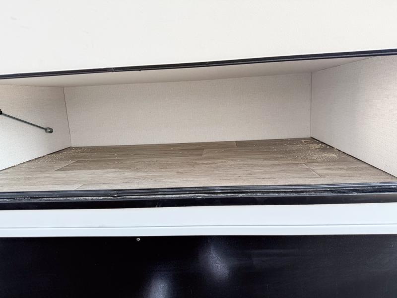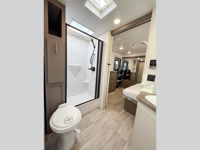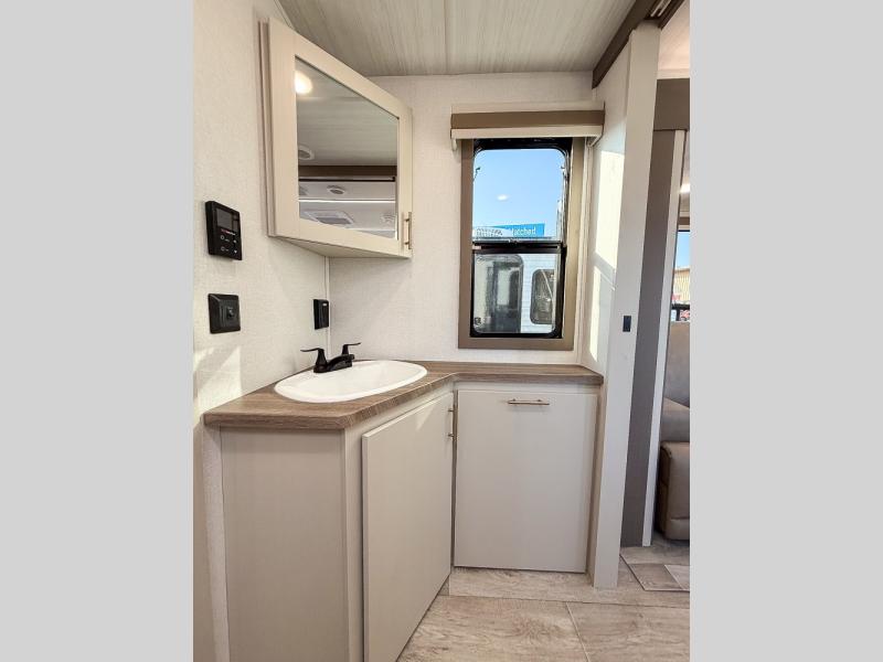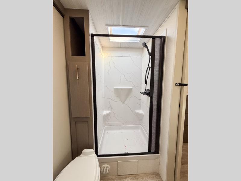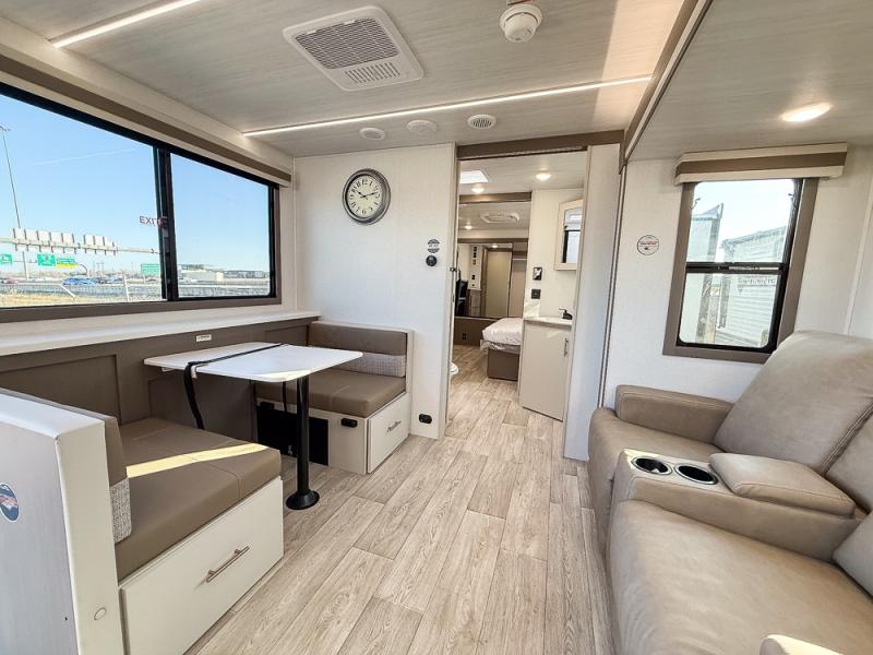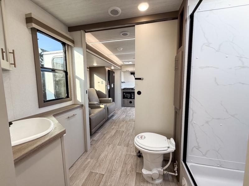 As you step into this travel trailer, you’re greeted by a fully equipped front kitchen featuring a three-burner range, generous counter space, and a sleek 10.7 cu. ft. black-glass refrigerator housed in the slide out giving you everything you need to prepare meals with ease. The slide out also includes a tri-fold sofa that provides a comfortable place to relax and can convert into extra sleeping space when needed. Between the sofa and refrigerator, a convenient pantry keeps all your dry goods organized. Across the way, the booth dinette offers the perfect spot to share meals, play games, or unwind while enjoying the telescoping 50" TV after a full day of adventure. Moving through the center of the trailer, the walk-through bathroom features a 30" x 36" shower with a skylight, a linen closet for towels and toiletries, and a porcelain foot-flush toilet so you can freshen up without relying on campsite facilities. At the rear, the private bedroom provides a spacious retreat with a king bed housed in its own slide out for added comfort, along with a dresser and a large rear wardrobe to keep clothing and gear neatly stored. For added convenience, the bedroom also includes its own second entry door.