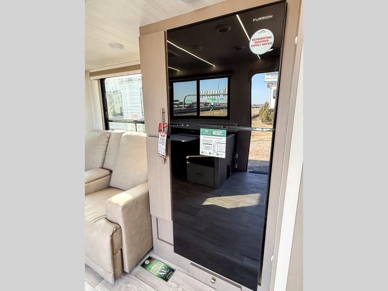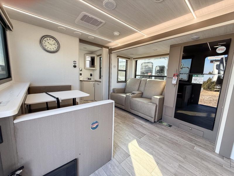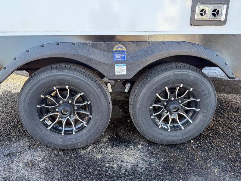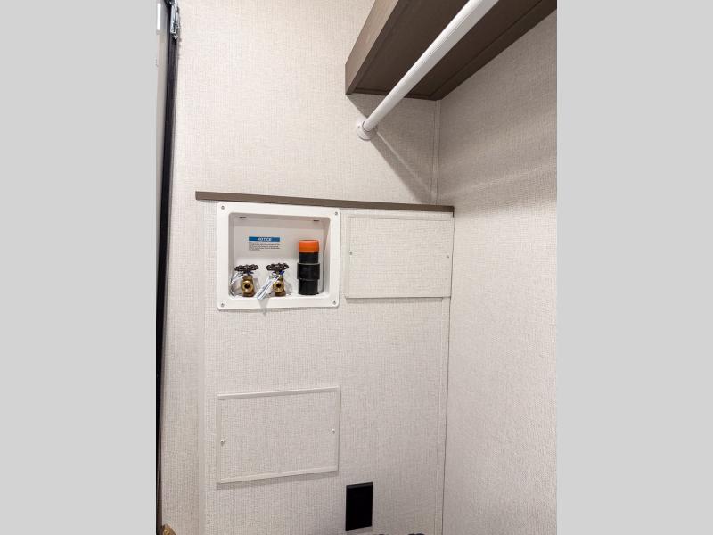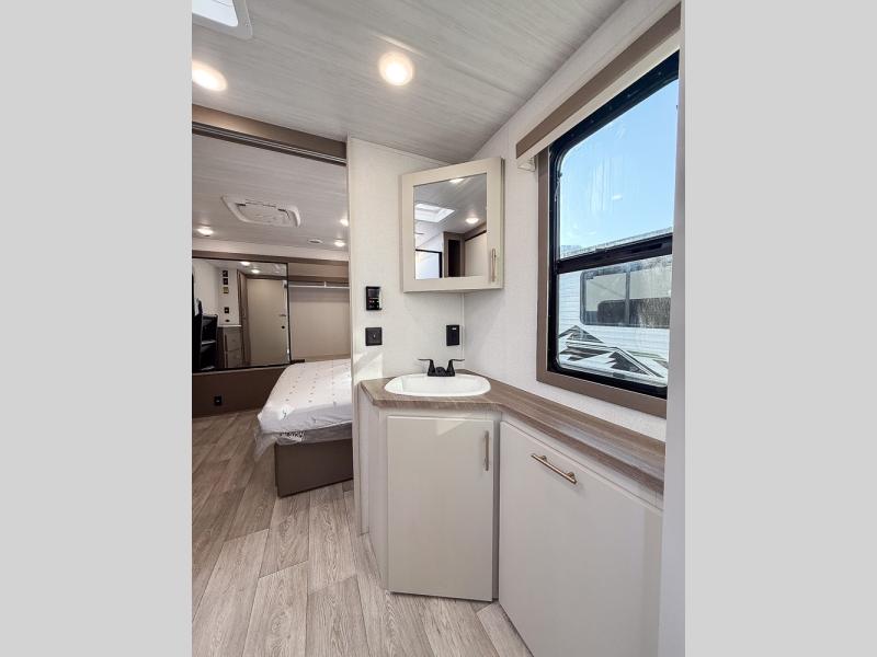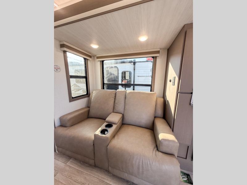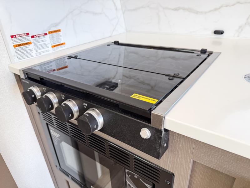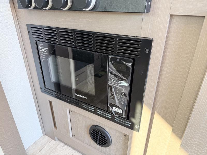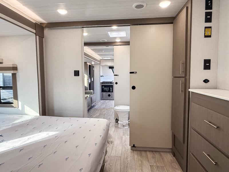 As you step into this travel trailer, you’re greeted by a fully equipped front kitchen featuring a three-burner range, generous counter space, and a sleek 10.7 cu. ft. black-glass refrigerator housed in the slide out giving you everything you need to prepare meals with ease. The slide out also includes a tri-fold sofa that provides a comfortable place to relax and can convert into extra sleeping space when needed. Between the sofa and refrigerator, a convenient pantry keeps all your dry goods organized. Across the way, the booth dinette offers the perfect spot to share meals, play games, or unwind while enjoying the telescoping 50" TV after a full day of adventure. Moving through the center of the trailer, the walk-through bathroom features a 30" x 36" shower with a skylight, a linen closet for towels and toiletries, and a porcelain foot-flush toilet so you can freshen up without relying on campsite facilities. At the rear, the private bedroom provides a spacious retreat with a king bed housed in its own slide out for added comfort, along with a dresser and a large rear wardrobe to keep clothing and gear neatly stored. For added convenience, the bedroom also includes its own second entry door.