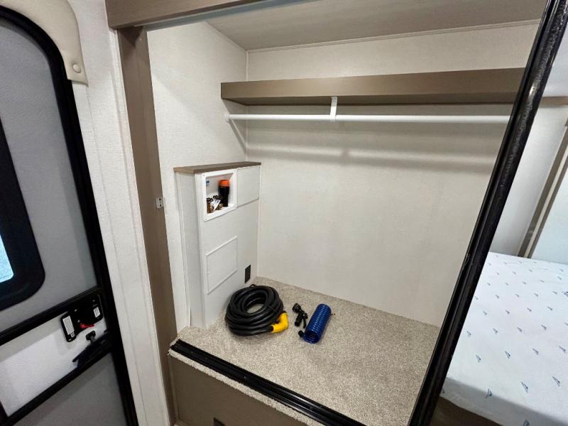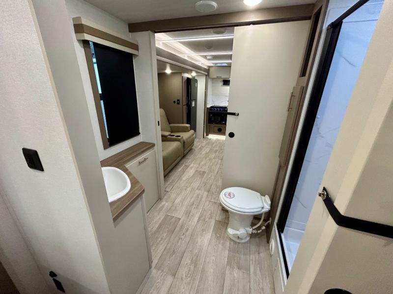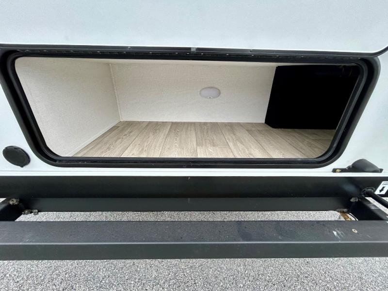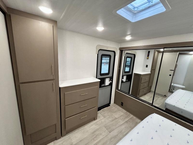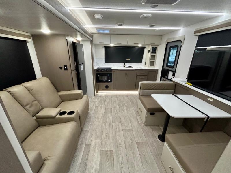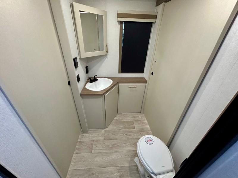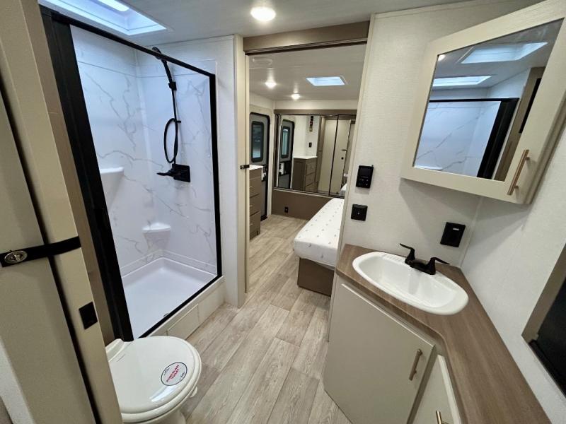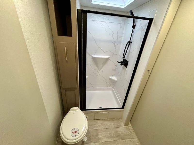 As you step into this travel trailer, you’re greeted by a fully equipped front kitchen featuring a three-burner range, generous counter space, and a sleek 10.7 cu. ft. black-glass refrigerator housed in the slide out giving you everything you need to prepare meals with ease. The slide out also includes a tri-fold sofa that provides a comfortable place to relax and can convert into extra sleeping space when needed. Between the sofa and refrigerator, a convenient pantry keeps all your dry goods organized. Across the way, the booth dinette offers the perfect spot to share meals, play games, or unwind while enjoying the telescoping 50" TV after a full day of adventure. Moving through the center of the trailer, the walk-through bathroom features a 30" x 36" shower with a skylight, a linen closet for towels and toiletries, and a porcelain foot-flush toilet so you can freshen up without relying on campsite facilities. At the rear, the private bedroom provides a spacious retreat with a king bed housed in its own slide out for added comfort, along with a dresser and a large rear wardrobe to keep clothing and gear neatly stored. For added convenience, the bedroom also includes its own second entry door.