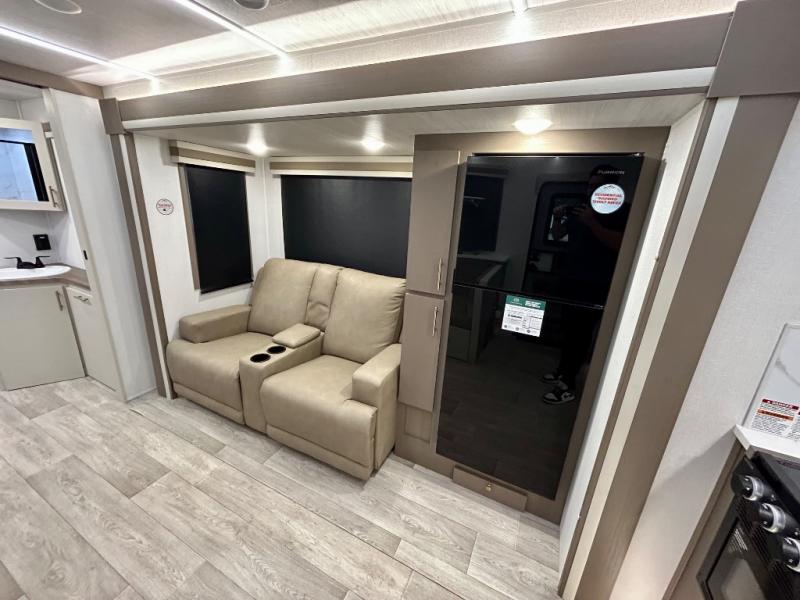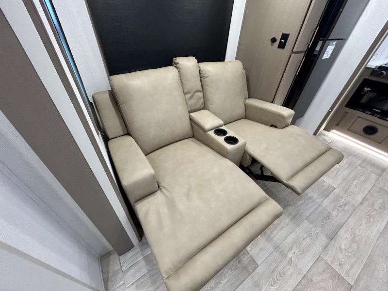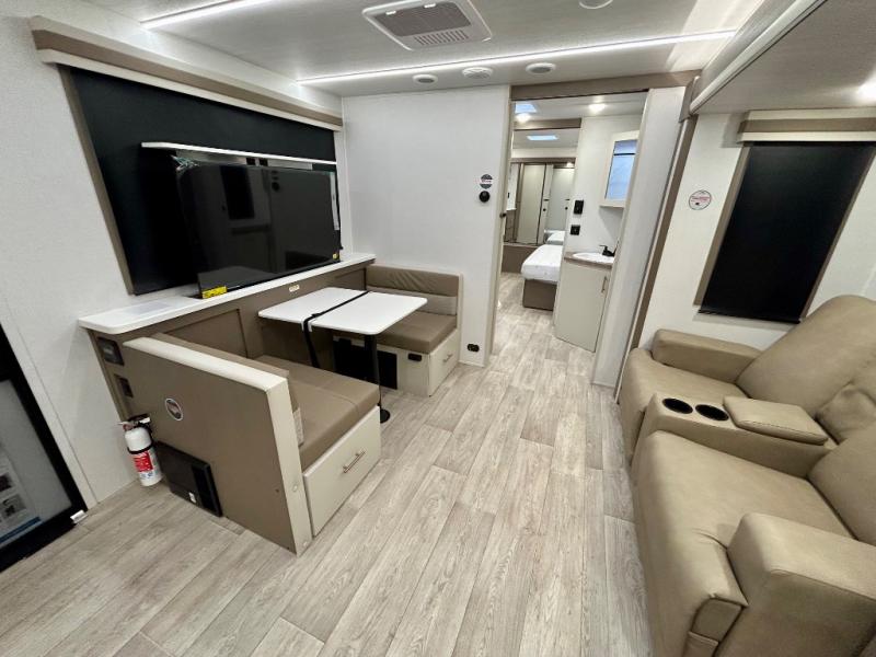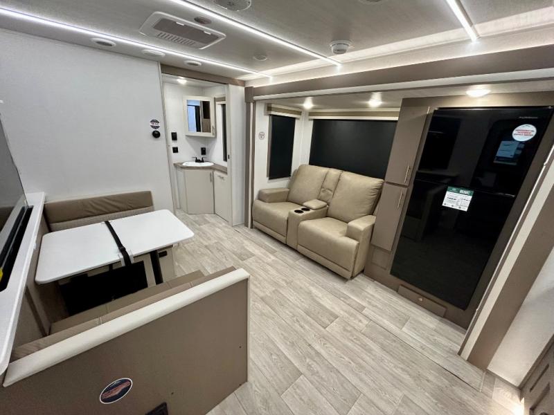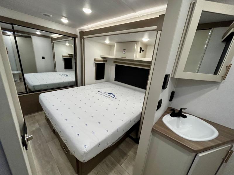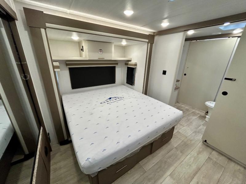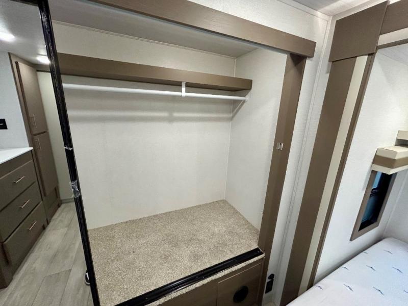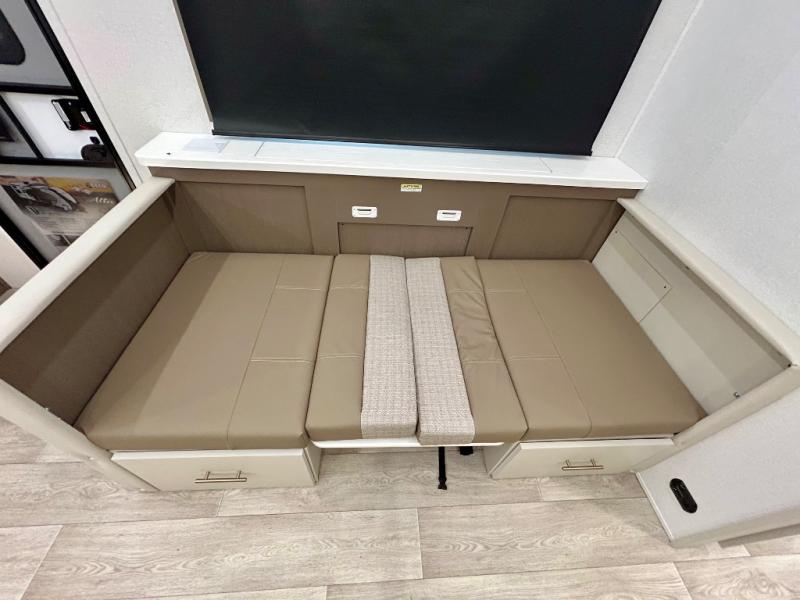 As you step into this travel trailer, you’re greeted by a fully equipped front kitchen featuring a three-burner range, generous counter space, and a sleek 10.7 cu. ft. black-glass refrigerator housed in the slide out giving you everything you need to prepare meals with ease. The slide out also includes a tri-fold sofa that provides a comfortable place to relax and can convert into extra sleeping space when needed. Between the sofa and refrigerator, a convenient pantry keeps all your dry goods organized. Across the way, the booth dinette offers the perfect spot to share meals, play games, or unwind while enjoying the telescoping 50" TV after a full day of adventure. Moving through the center of the trailer, the walk-through bathroom features a 30" x 36" shower with a skylight, a linen closet for towels and toiletries, and a porcelain foot-flush toilet so you can freshen up without relying on campsite facilities. At the rear, the private bedroom provides a spacious retreat with a king bed housed in its own slide out for added comfort, along with a dresser and a large rear wardrobe to keep clothing and gear neatly stored. For added convenience, the bedroom also includes its own second entry door.