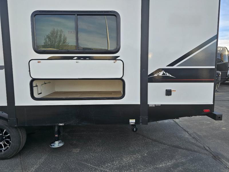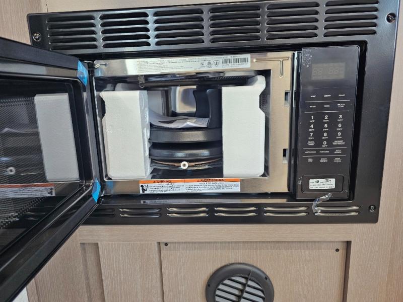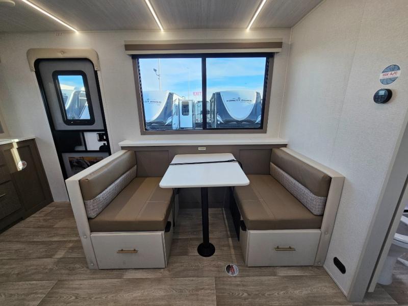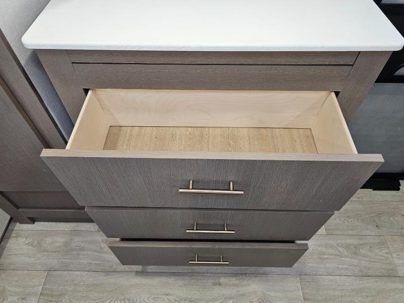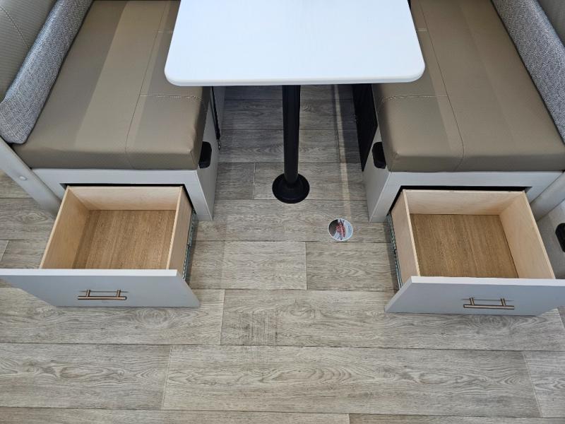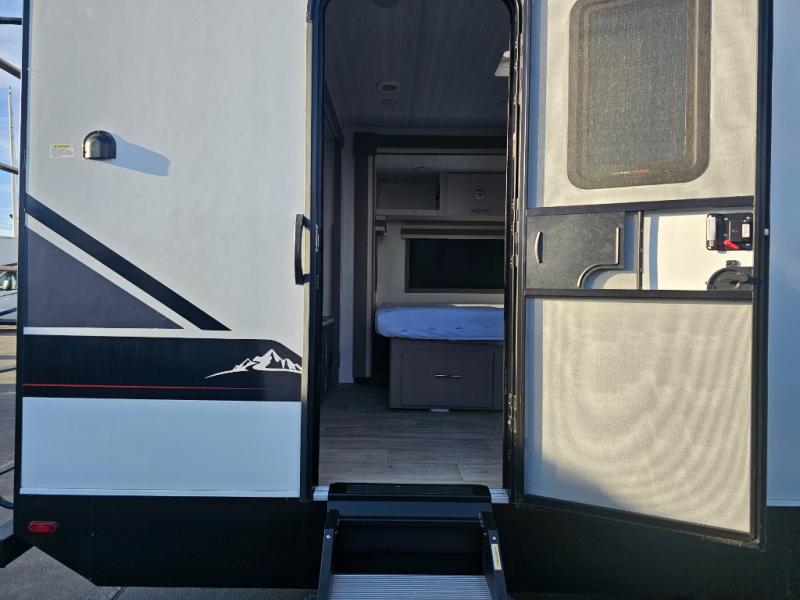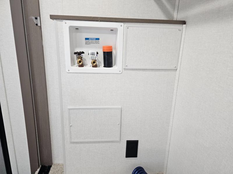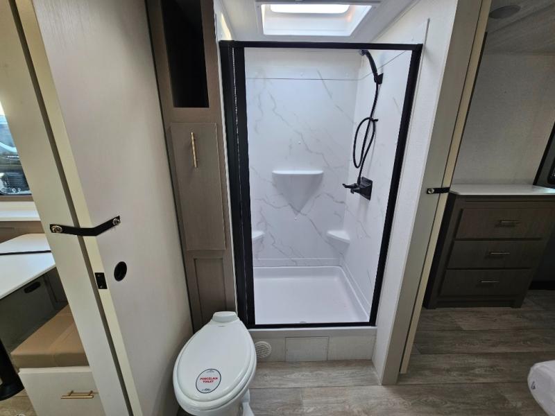 As you step into this travel trailer, you’re greeted by a fully equipped front kitchen featuring a three-burner range, generous counter space, and a sleek 10.7 cu. ft. black-glass refrigerator housed in the slide out giving you everything you need to prepare meals with ease. The slide out also includes a tri-fold sofa that provides a comfortable place to relax and can convert into extra sleeping space when needed. Between the sofa and refrigerator, a convenient pantry keeps all your dry goods organized. Across the way, the booth dinette offers the perfect spot to share meals, play games, or unwind while enjoying the telescoping 50" TV after a full day of adventure. Moving through the center of the trailer, the walk-through bathroom features a 30" x 36" shower with a skylight, a linen closet for towels and toiletries, and a porcelain foot-flush toilet so you can freshen up without relying on campsite facilities. At the rear, the private bedroom provides a spacious retreat with a king bed housed in its own slide out for added comfort, along with a dresser and a large rear wardrobe to keep clothing and gear neatly stored. For added convenience, the bedroom also includes its own second entry door.