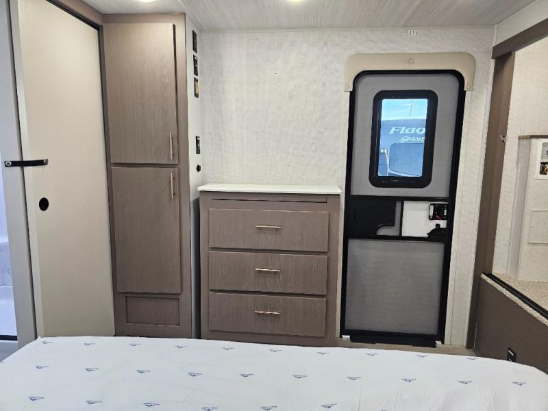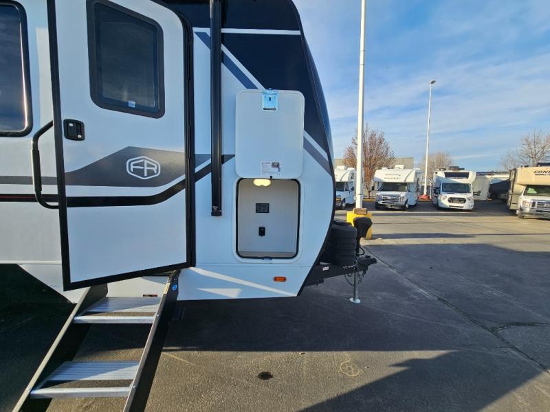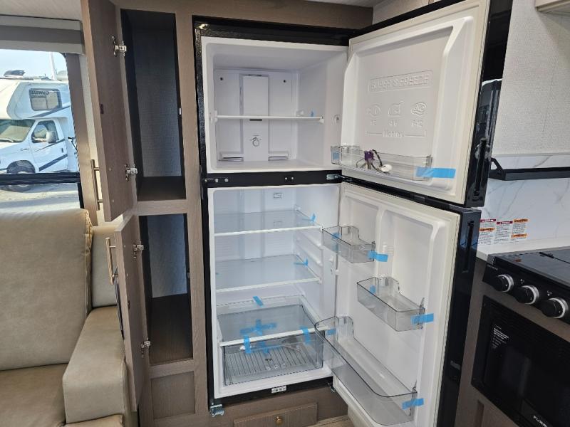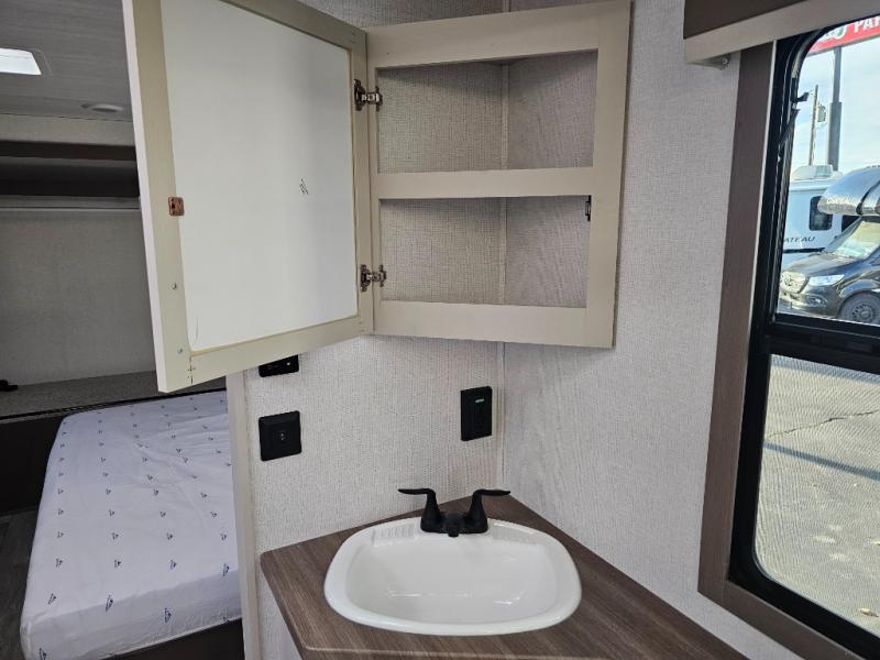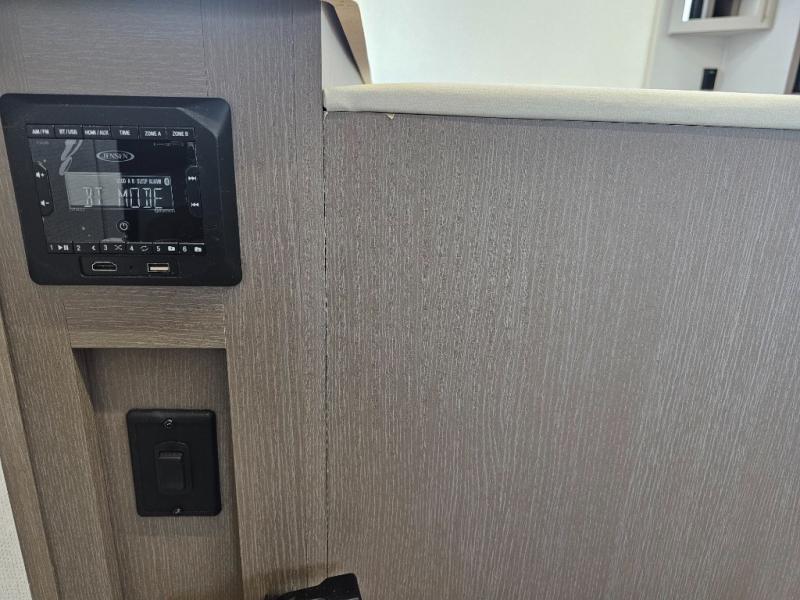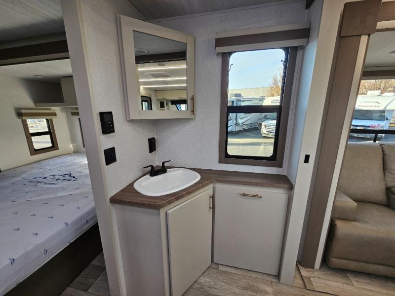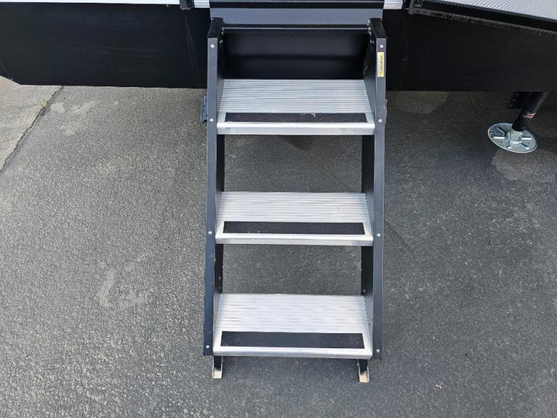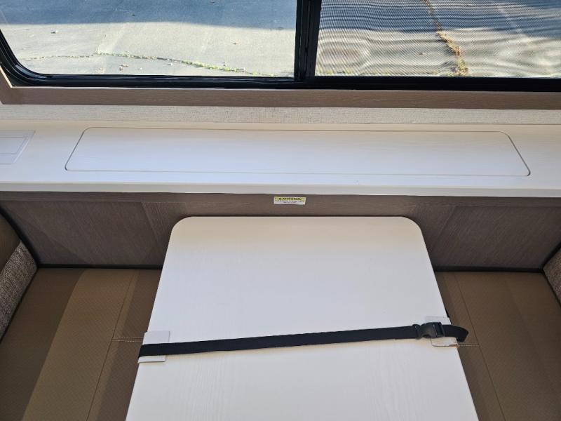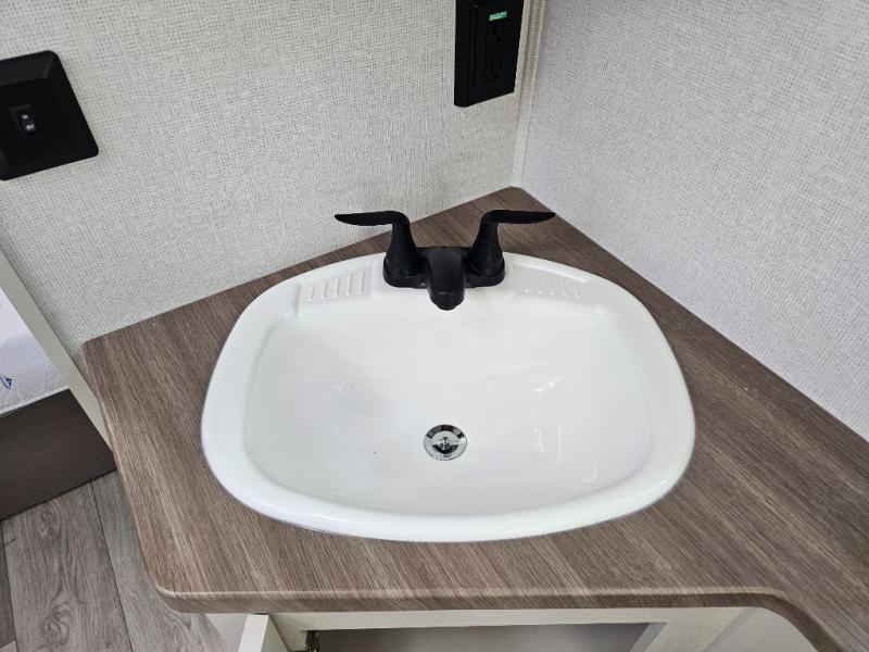 As you step into this travel trailer, you’re greeted by a fully equipped front kitchen featuring a three-burner range, generous counter space, and a sleek 10.7 cu. ft. black-glass refrigerator housed in the slide out giving you everything you need to prepare meals with ease. The slide out also includes a tri-fold sofa that provides a comfortable place to relax and can convert into extra sleeping space when needed. Between the sofa and refrigerator, a convenient pantry keeps all your dry goods organized. Across the way, the booth dinette offers the perfect spot to share meals, play games, or unwind while enjoying the telescoping 50" TV after a full day of adventure. Moving through the center of the trailer, the walk-through bathroom features a 30" x 36" shower with a skylight, a linen closet for towels and toiletries, and a porcelain foot-flush toilet so you can freshen up without relying on campsite facilities. At the rear, the private bedroom provides a spacious retreat with a king bed housed in its own slide out for added comfort, along with a dresser and a large rear wardrobe to keep clothing and gear neatly stored. For added convenience, the bedroom also includes its own second entry door.