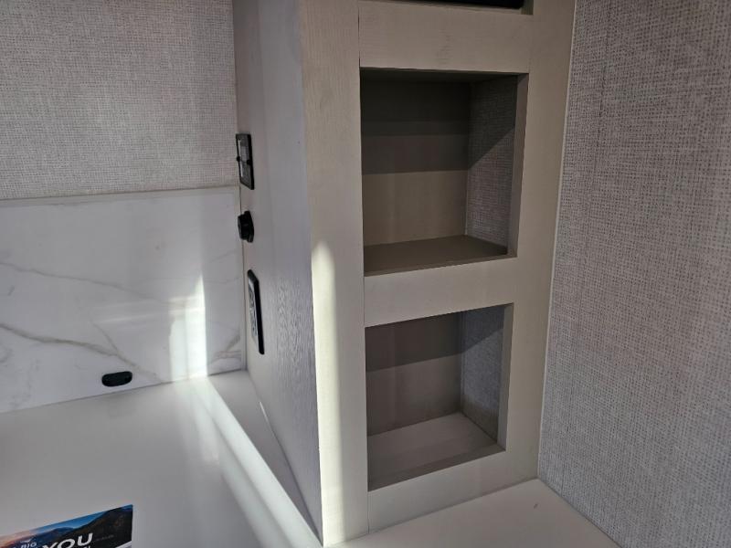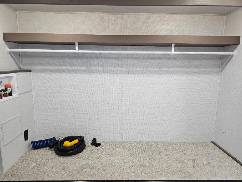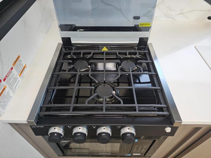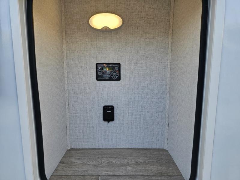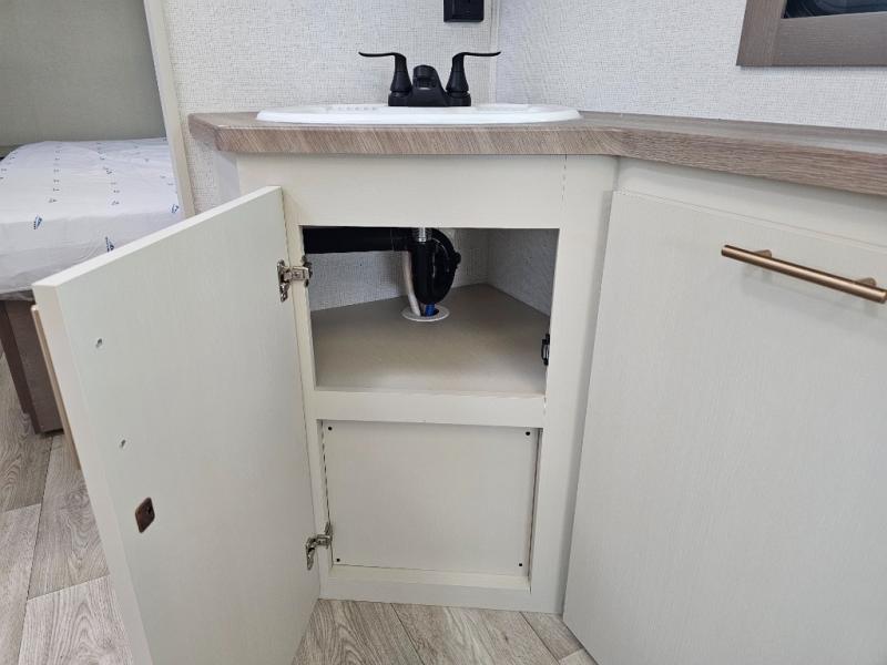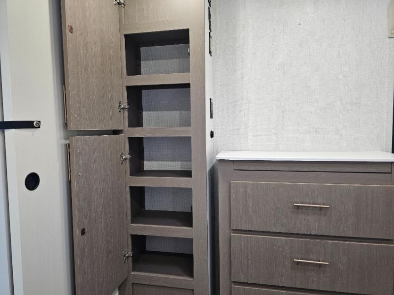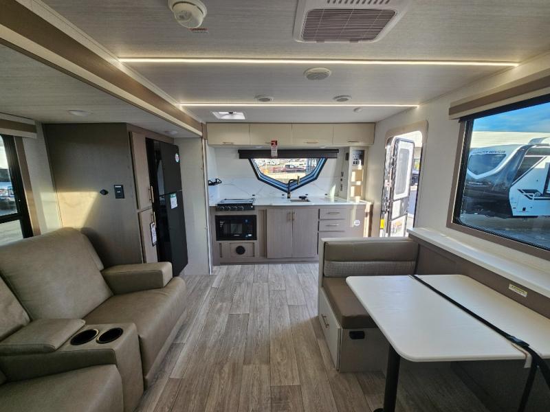 As you step into this travel trailer, you’re greeted by a fully equipped front kitchen featuring a three-burner range, generous counter space, and a sleek 10.7 cu. ft. black-glass refrigerator housed in the slide out giving you everything you need to prepare meals with ease. The slide out also includes a tri-fold sofa that provides a comfortable place to relax and can convert into extra sleeping space when needed. Between the sofa and refrigerator, a convenient pantry keeps all your dry goods organized. Across the way, the booth dinette offers the perfect spot to share meals, play games, or unwind while enjoying the telescoping 50" TV after a full day of adventure. Moving through the center of the trailer, the walk-through bathroom features a 30" x 36" shower with a skylight, a linen closet for towels and toiletries, and a porcelain foot-flush toilet so you can freshen up without relying on campsite facilities. At the rear, the private bedroom provides a spacious retreat with a king bed housed in its own slide out for added comfort, along with a dresser and a large rear wardrobe to keep clothing and gear neatly stored. For added convenience, the bedroom also includes its own second entry door.
