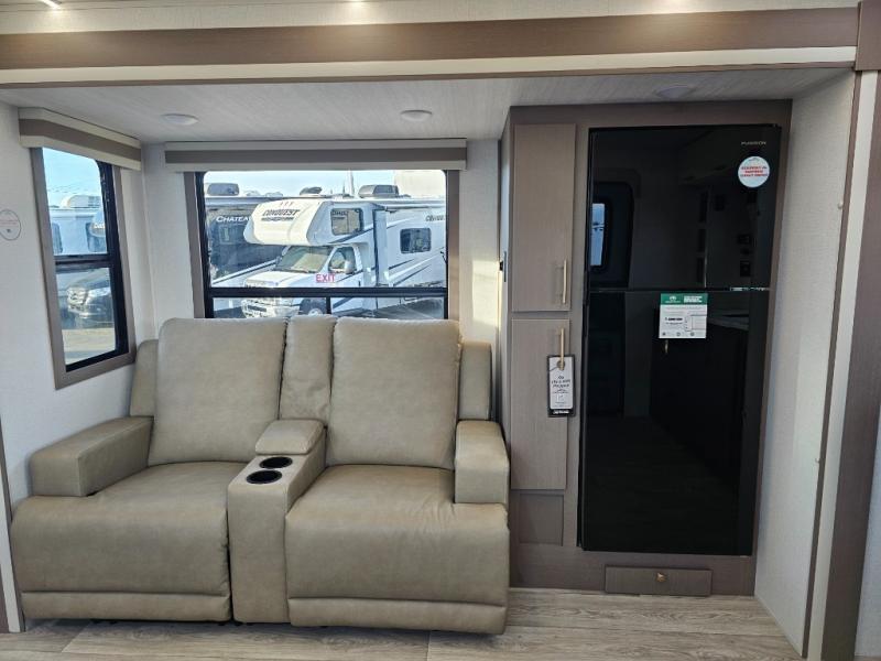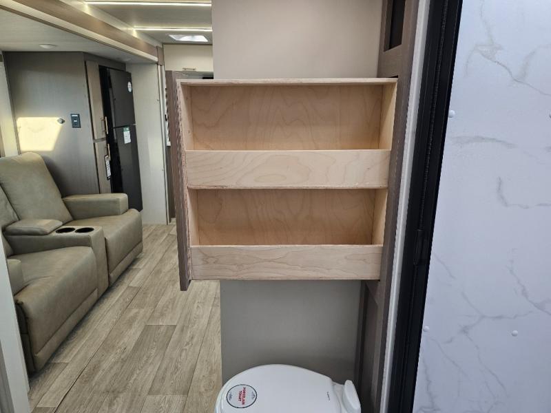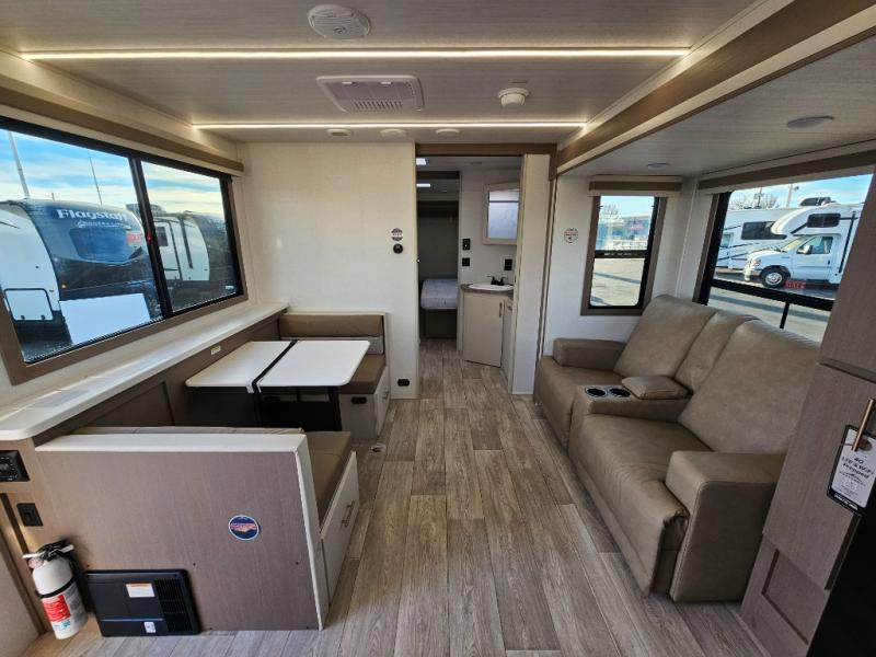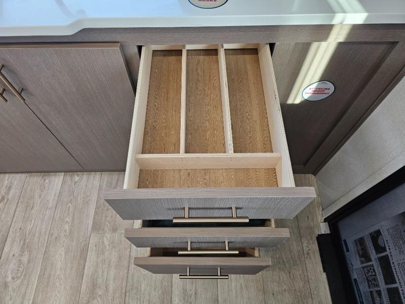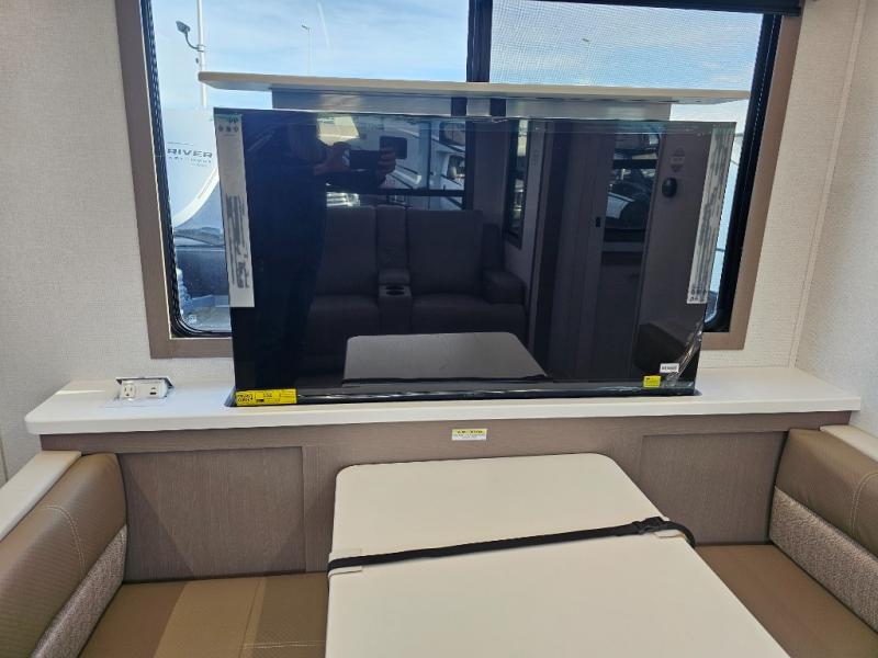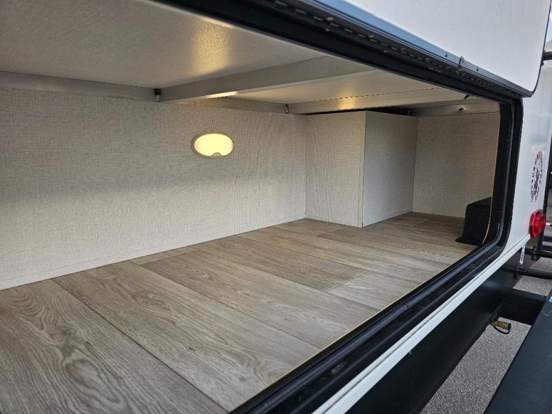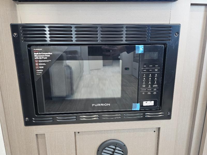 As you step into this travel trailer, you’re greeted by a fully equipped front kitchen featuring a three-burner range, generous counter space, and a sleek 10.7 cu. ft. black-glass refrigerator housed in the slide out giving you everything you need to prepare meals with ease. The slide out also includes a tri-fold sofa that provides a comfortable place to relax and can convert into extra sleeping space when needed. Between the sofa and refrigerator, a convenient pantry keeps all your dry goods organized. Across the way, the booth dinette offers the perfect spot to share meals, play games, or unwind while enjoying the telescoping 50" TV after a full day of adventure. Moving through the center of the trailer, the walk-through bathroom features a 30" x 36" shower with a skylight, a linen closet for towels and toiletries, and a porcelain foot-flush toilet so you can freshen up without relying on campsite facilities. At the rear, the private bedroom provides a spacious retreat with a king bed housed in its own slide out for added comfort, along with a dresser and a large rear wardrobe to keep clothing and gear neatly stored. For added convenience, the bedroom also includes its own second entry door.