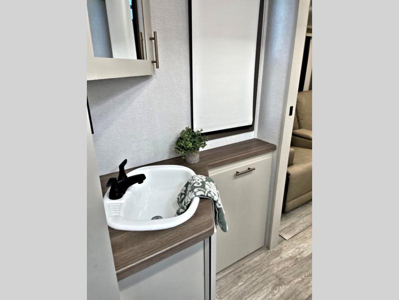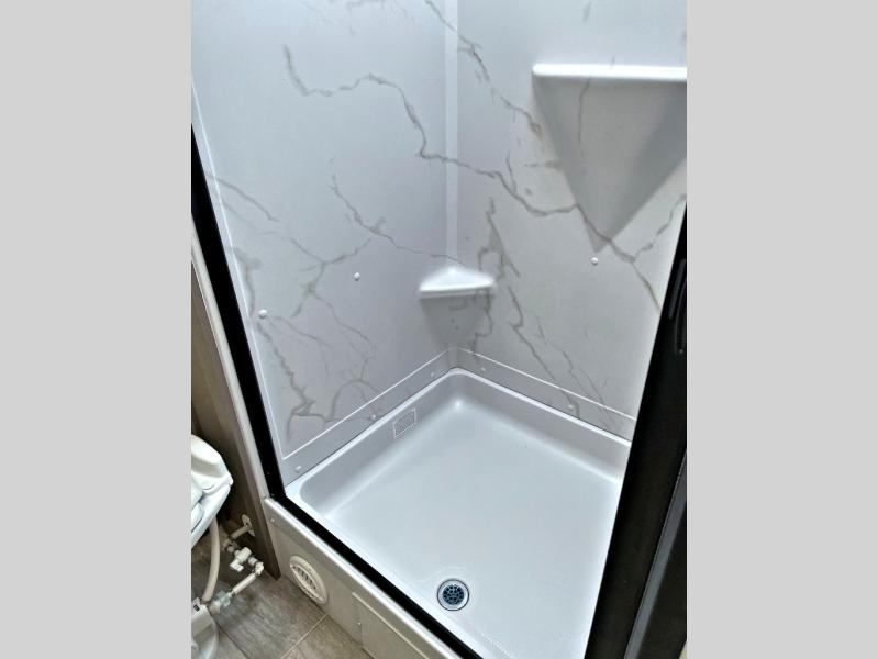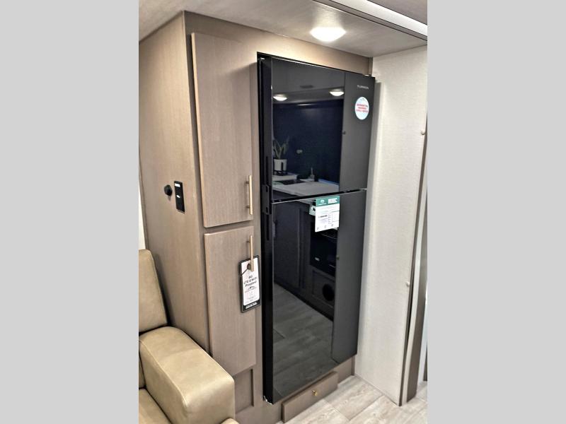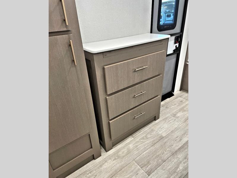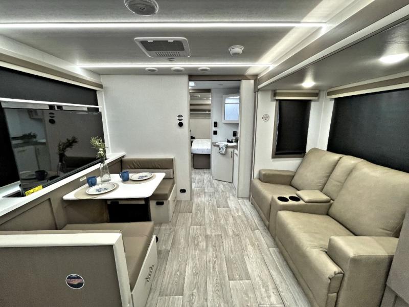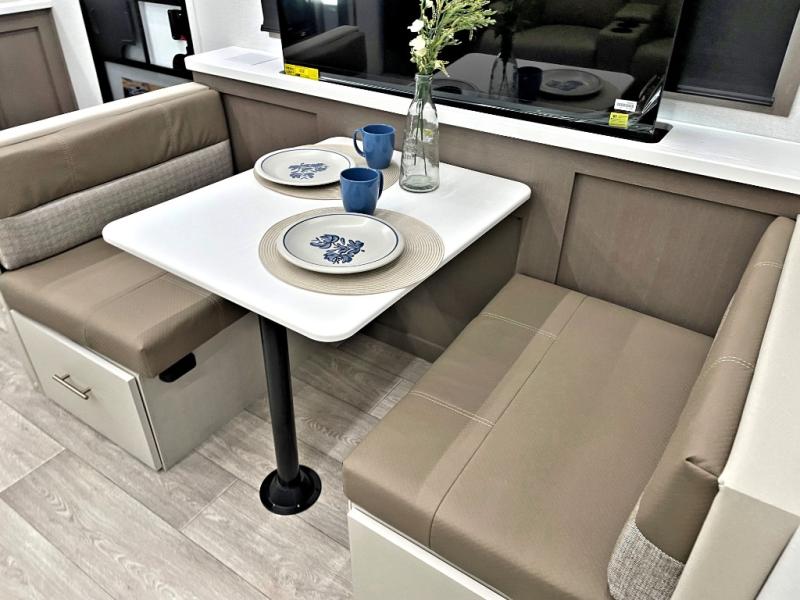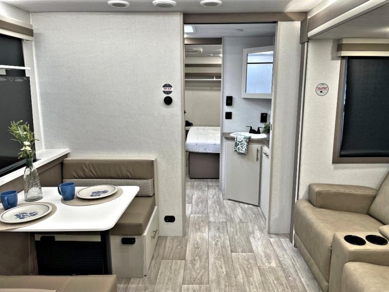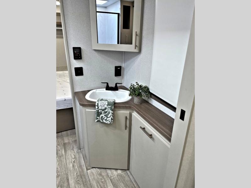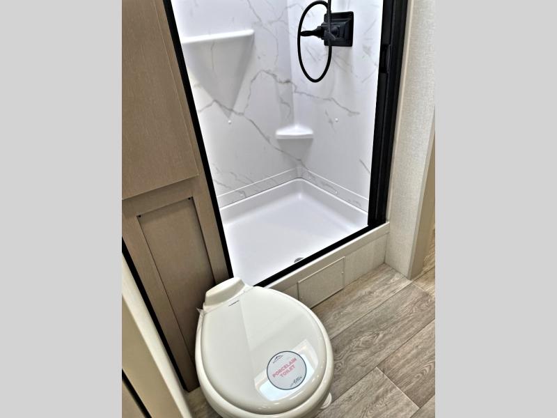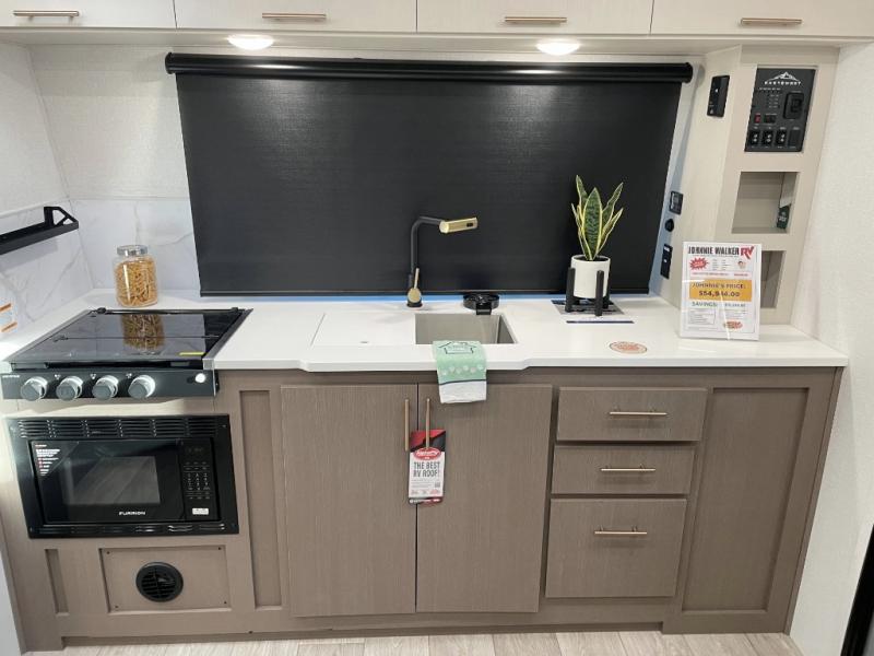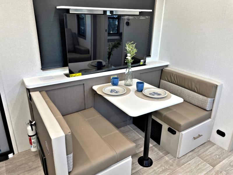 As you step into this travel trailer, you’re greeted by a fully equipped front kitchen featuring a three-burner range, generous counter space, and a sleek 10.7 cu. ft. black-glass refrigerator housed in the slide out giving you everything you need to prepare meals with ease. The slide out also includes a tri-fold sofa that provides a comfortable place to relax and can convert into extra sleeping space when needed. Between the sofa and refrigerator, a convenient pantry keeps all your dry goods organized. Across the way, the booth dinette offers the perfect spot to share meals, play games, or unwind while enjoying the telescoping 50" TV after a full day of adventure. Moving through the center of the trailer, the walk-through bathroom features a 30" x 36" shower with a skylight, a linen closet for towels and toiletries, and a porcelain foot-flush toilet so you can freshen up without relying on campsite facilities. At the rear, the private bedroom provides a spacious retreat with a king bed housed in its own slide out for added comfort, along with a dresser and a large rear wardrobe to keep clothing and gear neatly stored. For added convenience, the bedroom also includes its own second entry door.