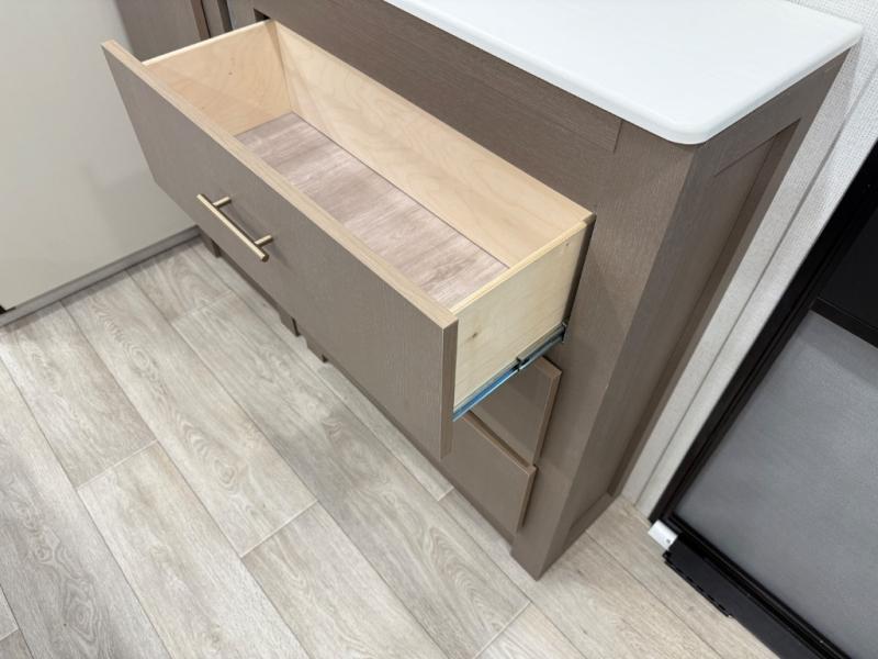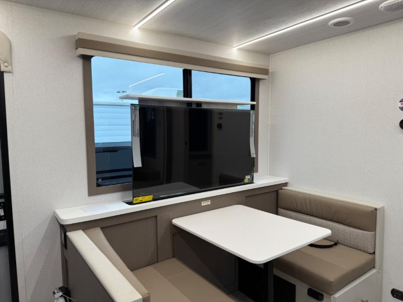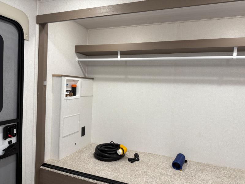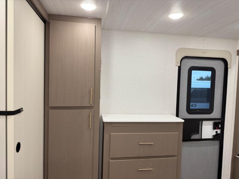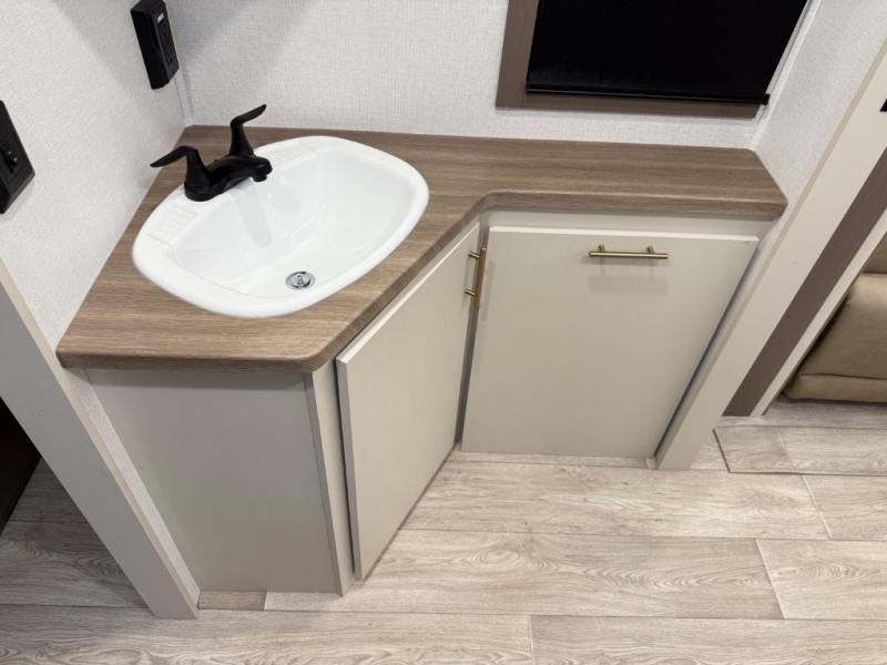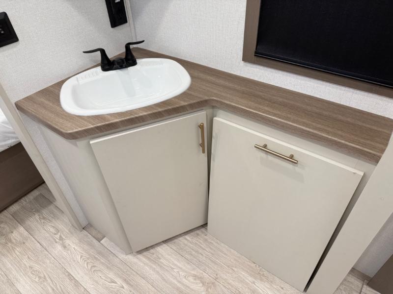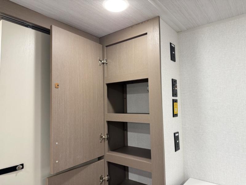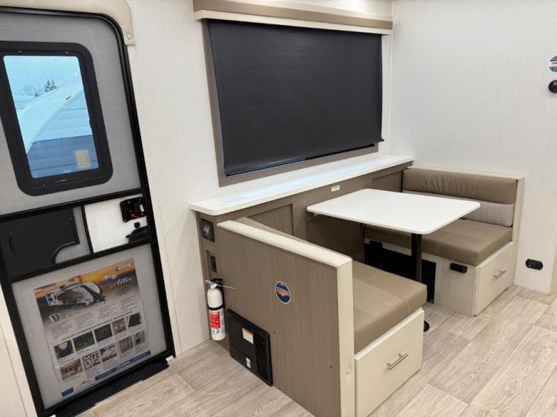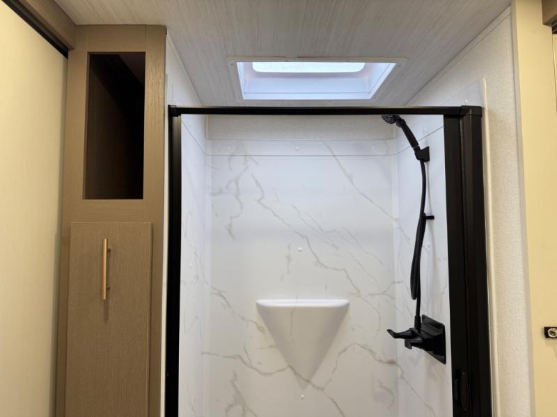 As you step into this travel trailer, you’re greeted by a fully equipped front kitchen featuring a three-burner range, generous counter space, and a sleek 10.7 cu. ft. black-glass refrigerator housed in the slide out giving you everything you need to prepare meals with ease. The slide out also includes a tri-fold sofa that provides a comfortable place to relax and can convert into extra sleeping space when needed. Between the sofa and refrigerator, a convenient pantry keeps all your dry goods organized. Across the way, the booth dinette offers the perfect spot to share meals, play games, or unwind while enjoying the telescoping 50" TV after a full day of adventure. Moving through the center of the trailer, the walk-through bathroom features a 30" x 36" shower with a skylight, a linen closet for towels and toiletries, and a porcelain foot-flush toilet so you can freshen up without relying on campsite facilities. At the rear, the private bedroom provides a spacious retreat with a king bed housed in its own slide out for added comfort, along with a dresser and a large rear wardrobe to keep clothing and gear neatly stored. For added convenience, the bedroom also includes its own second entry door.