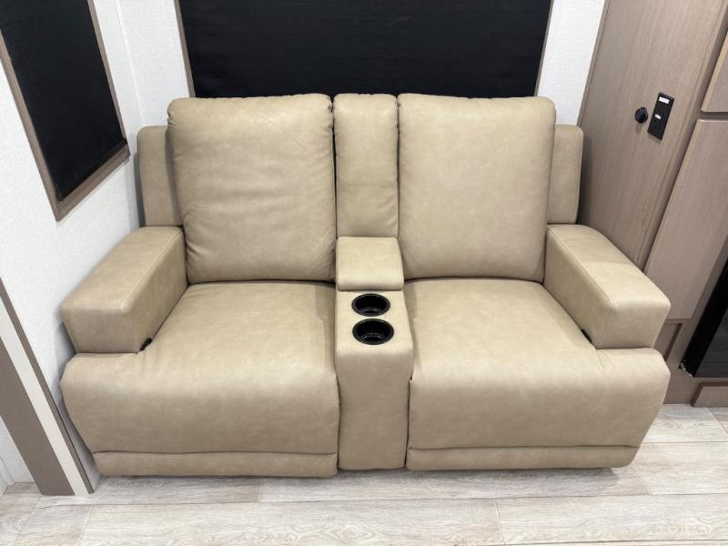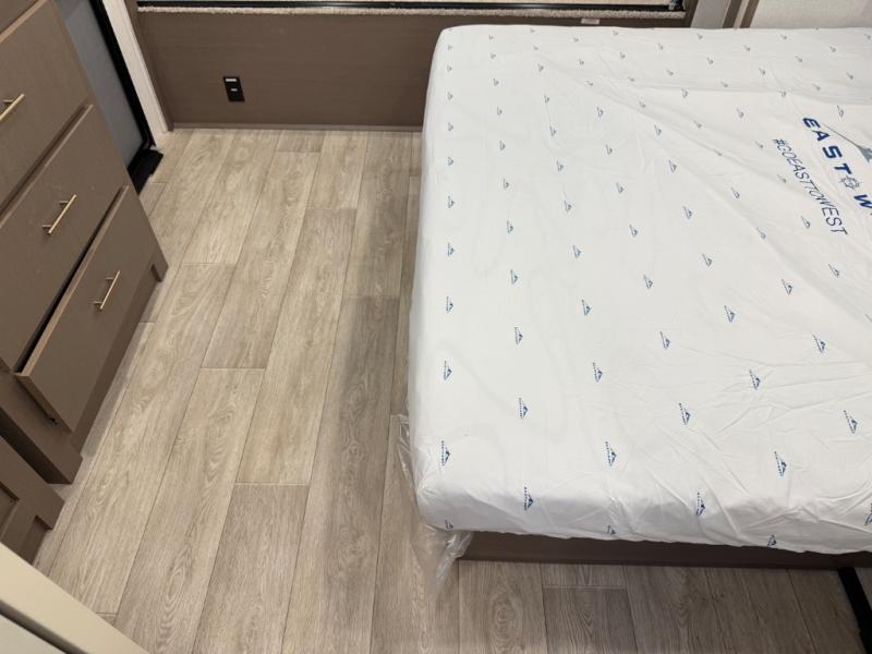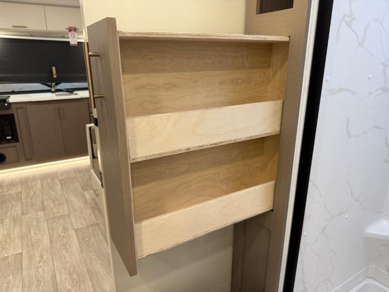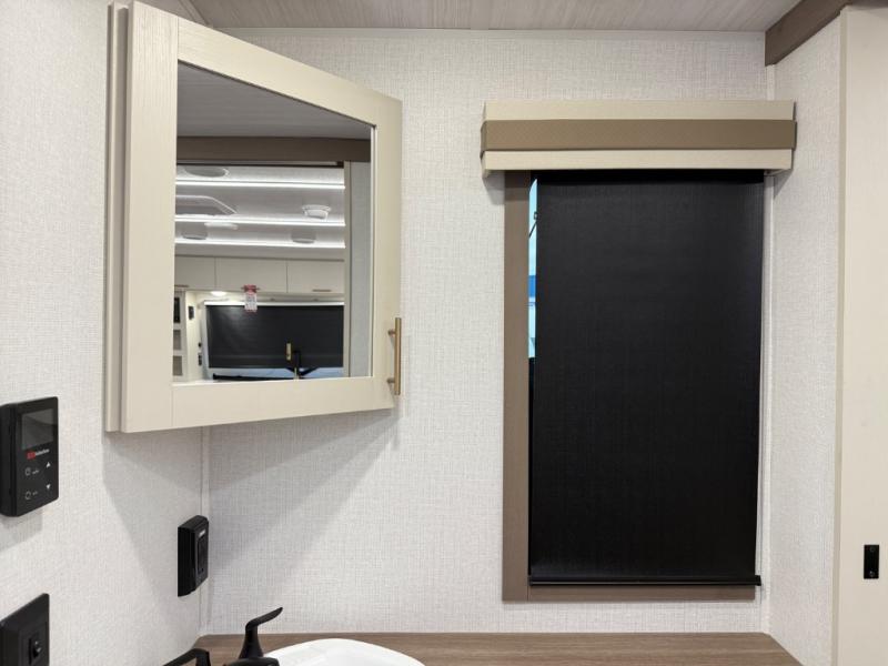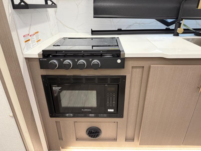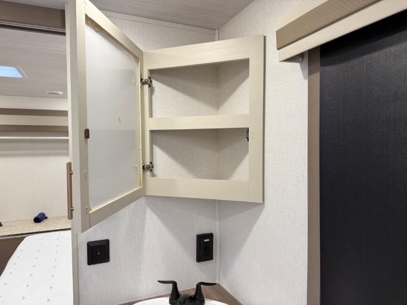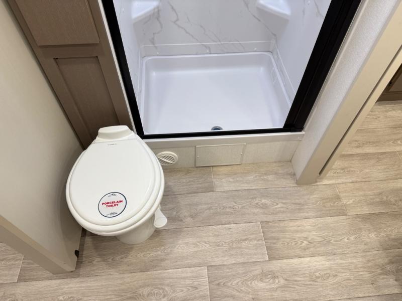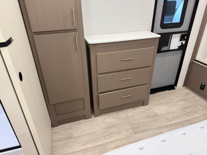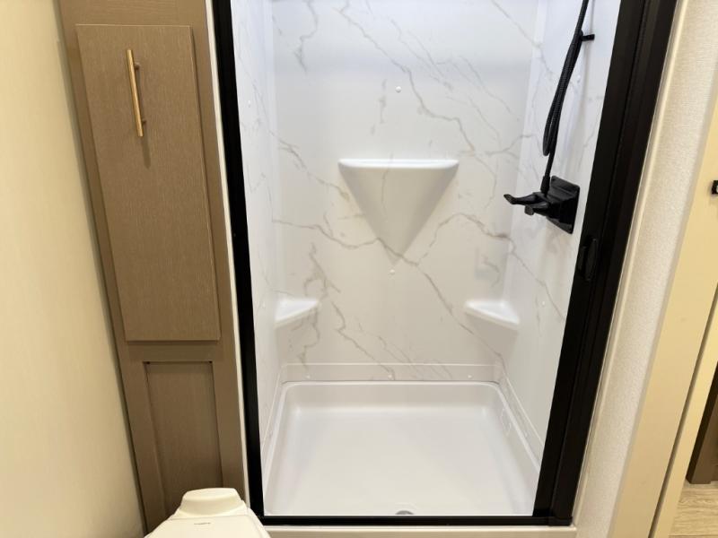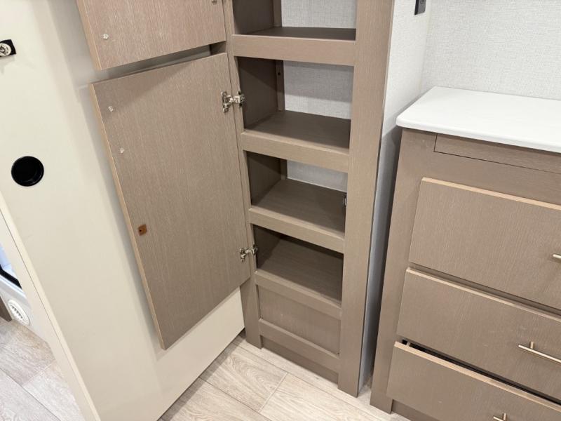 As you step into this travel trailer, you’re greeted by a fully equipped front kitchen featuring a three-burner range, generous counter space, and a sleek 10.7 cu. ft. black-glass refrigerator housed in the slide out giving you everything you need to prepare meals with ease. The slide out also includes a tri-fold sofa that provides a comfortable place to relax and can convert into extra sleeping space when needed. Between the sofa and refrigerator, a convenient pantry keeps all your dry goods organized. Across the way, the booth dinette offers the perfect spot to share meals, play games, or unwind while enjoying the telescoping 50" TV after a full day of adventure. Moving through the center of the trailer, the walk-through bathroom features a 30" x 36" shower with a skylight, a linen closet for towels and toiletries, and a porcelain foot-flush toilet so you can freshen up without relying on campsite facilities. At the rear, the private bedroom provides a spacious retreat with a king bed housed in its own slide out for added comfort, along with a dresser and a large rear wardrobe to keep clothing and gear neatly stored. For added convenience, the bedroom also includes its own second entry door.