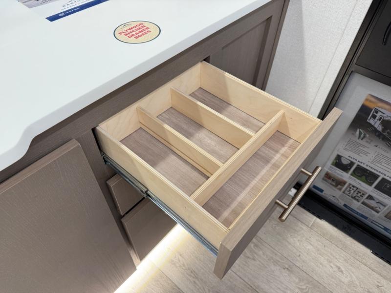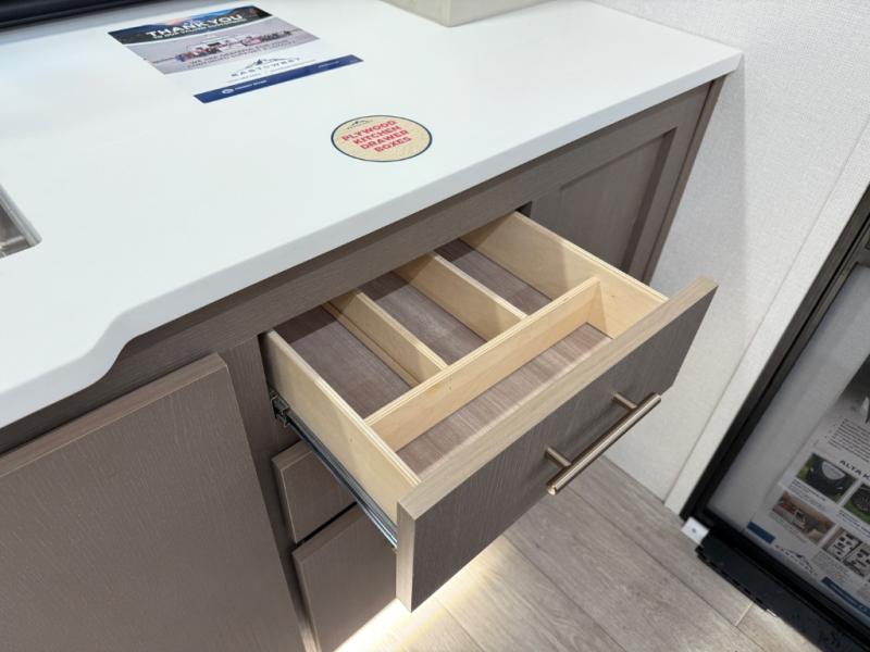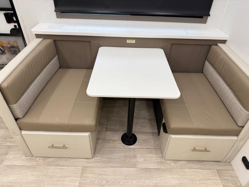 Each Alta travel trailer or toy hauler by EAST TO WEST is constructed with a 5" vacuum bonded roof, an enclosed and heated underbelly, and diamond plate front rock guard for added protection. Outside, you'll find exterior LED lights, a universal docking station, and back-up camera prep that can be added to make maneuvering in and out of campgrounds easier than ever. Inside, there are upgraded residential-inspired linoleum flooring, solid pressed membrane countertops, black roller shades, and many more interior comforts you are sure to love.
