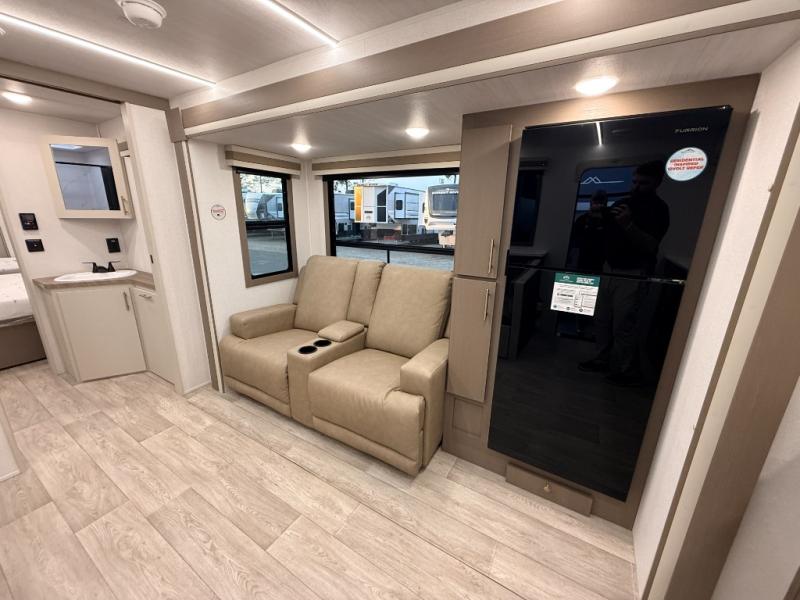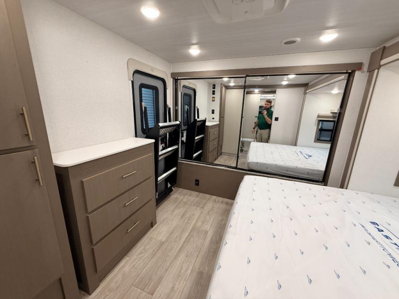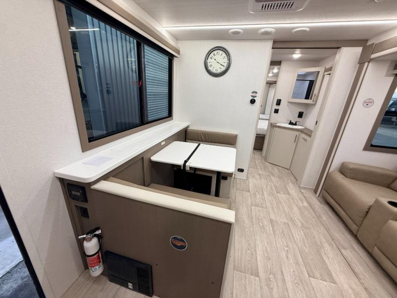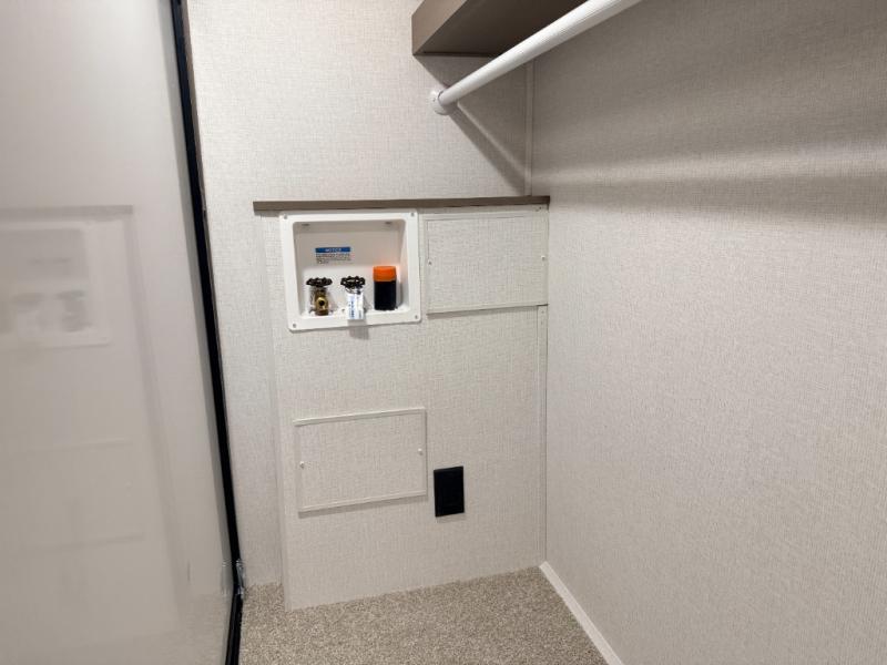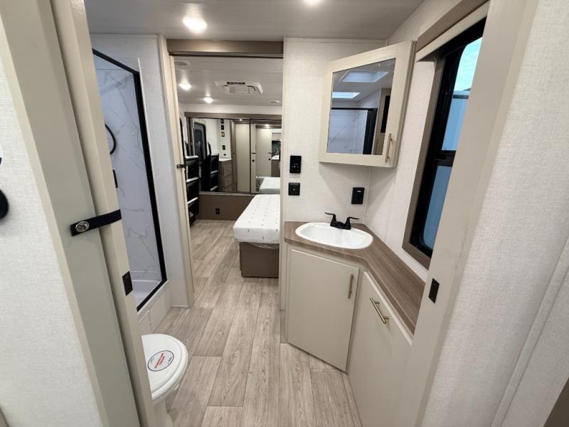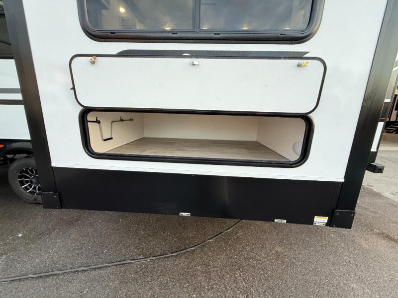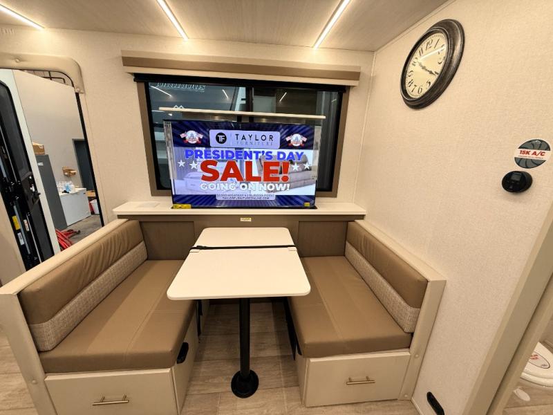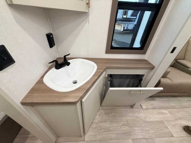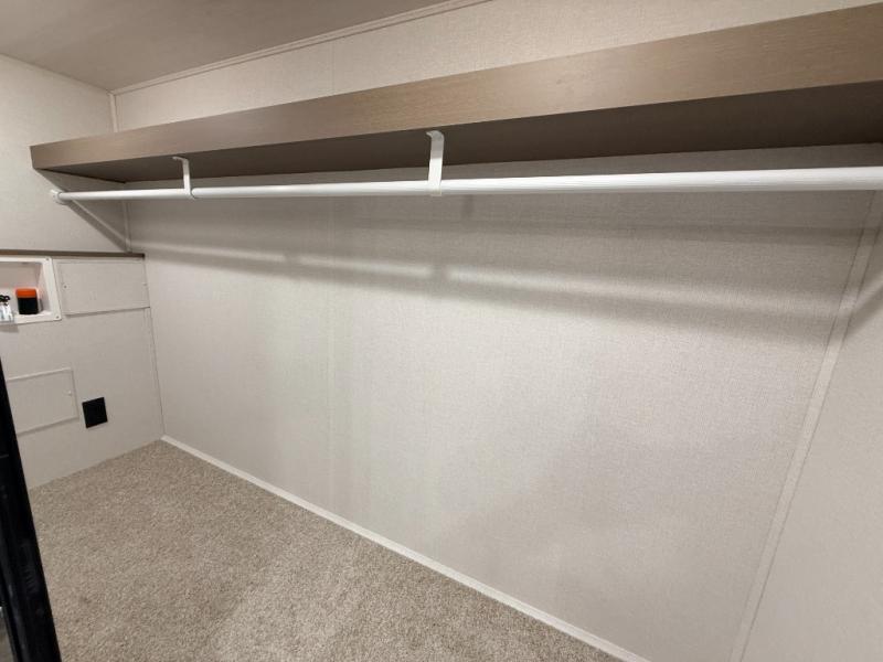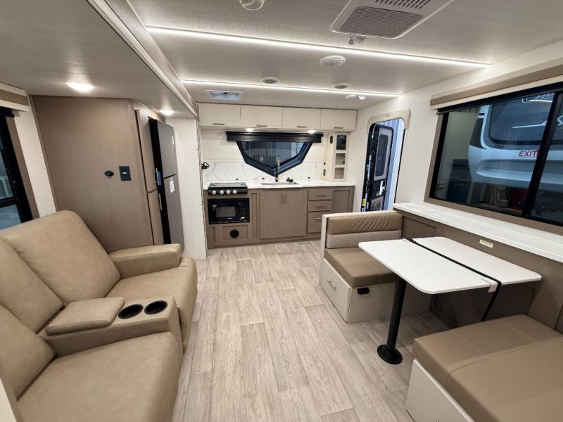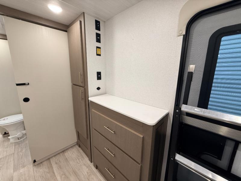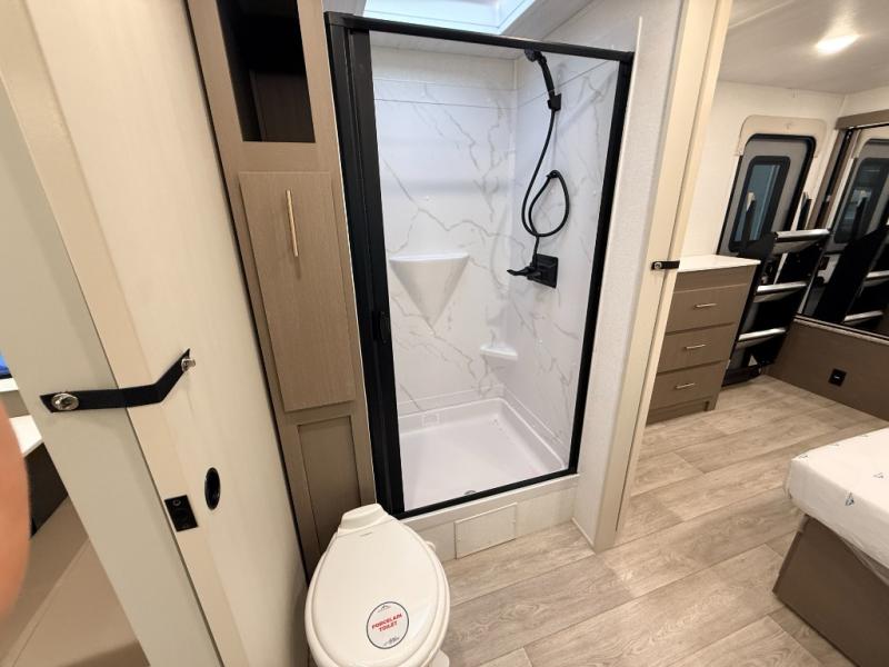 As you step into this travel trailer, you’re greeted by a fully equipped front kitchen featuring a three-burner range, generous counter space, and a sleek 10.7 cu. ft. black-glass refrigerator housed in the slide out giving you everything you need to prepare meals with ease. The slide out also includes a tri-fold sofa that provides a comfortable place to relax and can convert into extra sleeping space when needed. Between the sofa and refrigerator, a convenient pantry keeps all your dry goods organized. Across the way, the booth dinette offers the perfect spot to share meals, play games, or unwind while enjoying the telescoping 50" TV after a full day of adventure. Moving through the center of the trailer, the walk-through bathroom features a 30" x 36" shower with a skylight, a linen closet for towels and toiletries, and a porcelain foot-flush toilet so you can freshen up without relying on campsite facilities. At the rear, the private bedroom provides a spacious retreat with a king bed housed in its own slide out for added comfort, along with a dresser and a large rear wardrobe to keep clothing and gear neatly stored. For added convenience, the bedroom also includes its own second entry door.