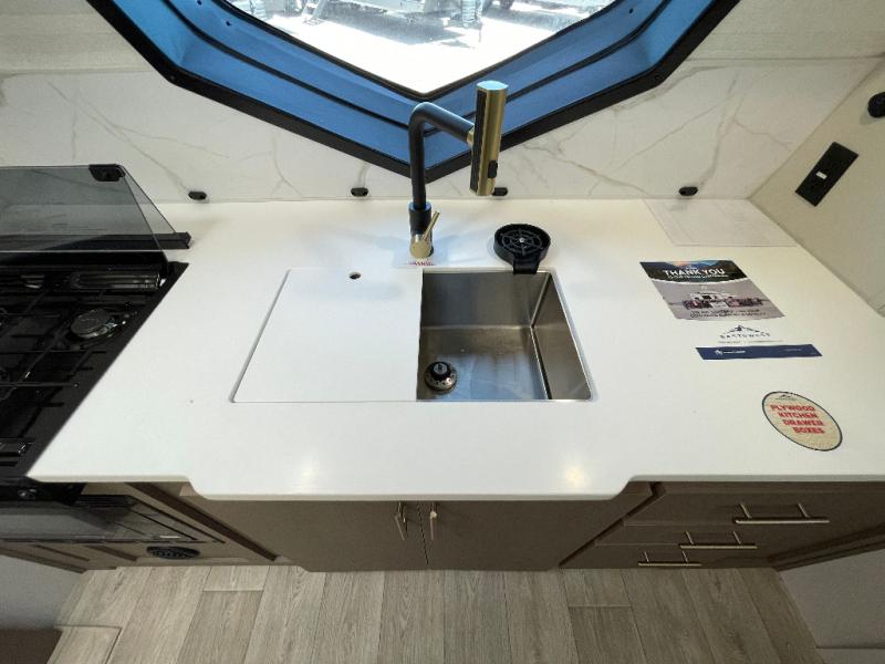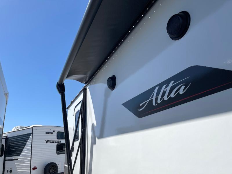 Each Alta travel trailer or toy hauler by EAST TO WEST is constructed with a 5" vacuum bonded roof, an enclosed and heated underbelly, and diamond plate front rock guard for added protection. Outside, you'll find exterior LED lights, a universal docking station, and back-up camera prep that can be added to make maneuvering in and out of campgrounds easier than ever. Inside, there are upgraded residential-inspired linoleum flooring, solid pressed membrane countertops, black roller shades, and many more interior comforts you are sure to love.