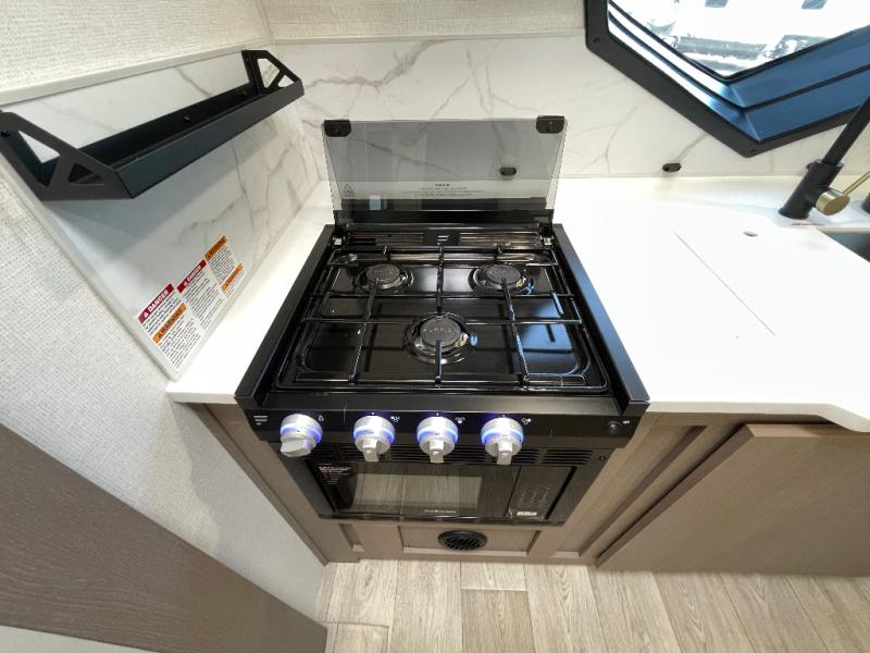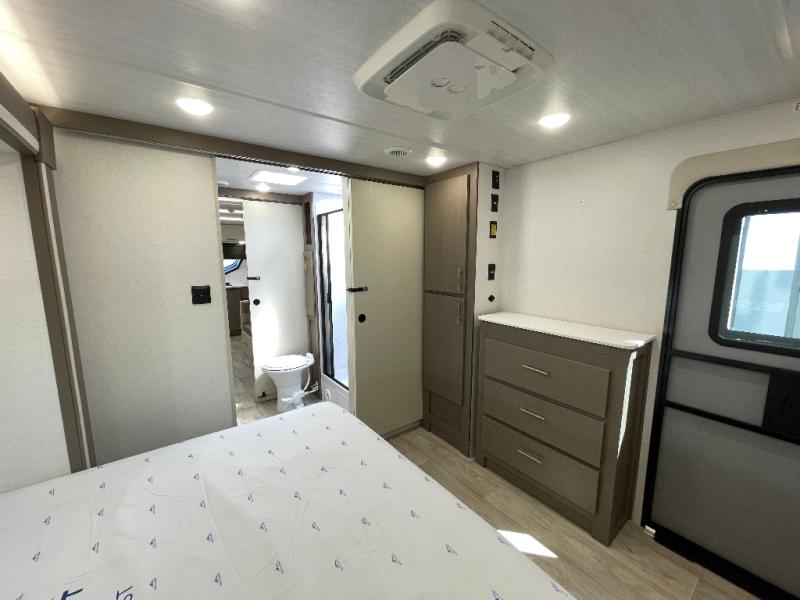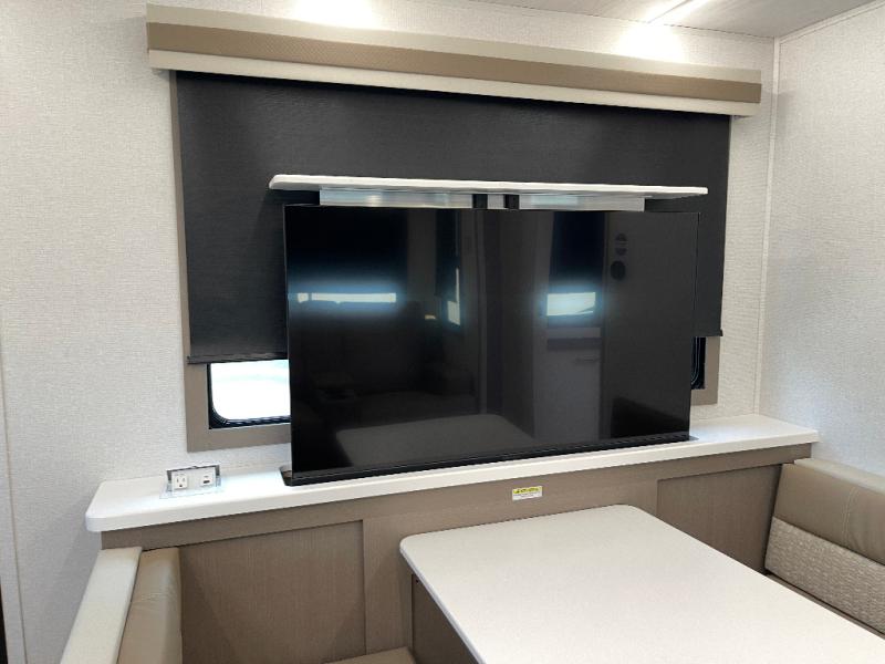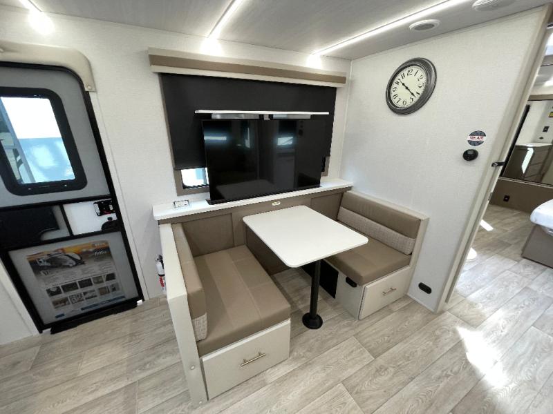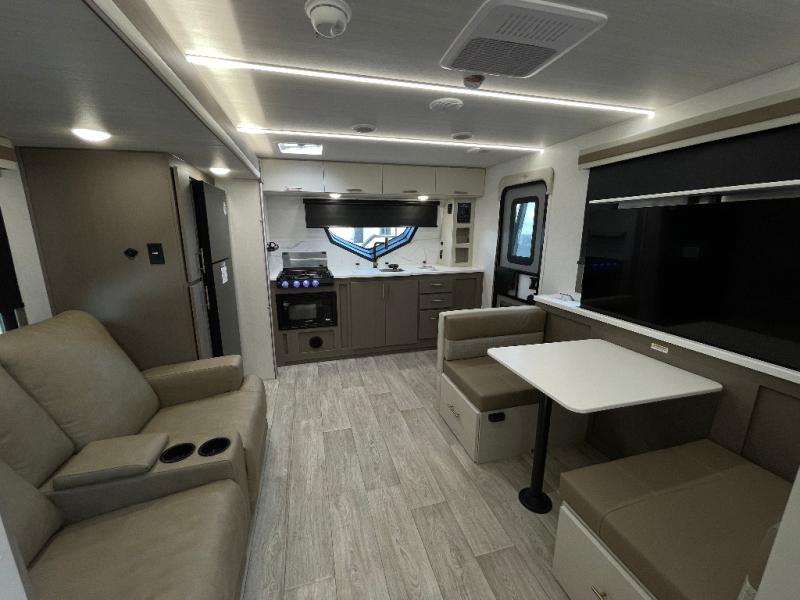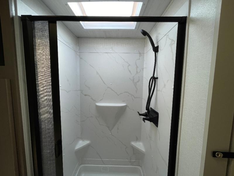 As you step into this travel trailer, you’re greeted by a fully equipped front kitchen featuring a three-burner range, generous counter space, and a sleek 10.7 cu. ft. black-glass refrigerator housed in the slide out giving you everything you need to prepare meals with ease. The slide out also includes a tri-fold sofa that provides a comfortable place to relax and can convert into extra sleeping space when needed. Between the sofa and refrigerator, a convenient pantry keeps all your dry goods organized. Across the way, the booth dinette offers the perfect spot to share meals, play games, or unwind while enjoying the telescoping 50" TV after a full day of adventure. Moving through the center of the trailer, the walk-through bathroom features a 30" x 36" shower with a skylight, a linen closet for towels and toiletries, and a porcelain foot-flush toilet so you can freshen up without relying on campsite facilities. At the rear, the private bedroom provides a spacious retreat with a king bed housed in its own slide out for added comfort, along with a dresser and a large rear wardrobe to keep clothing and gear neatly stored. For added convenience, the bedroom also includes its own second entry door.