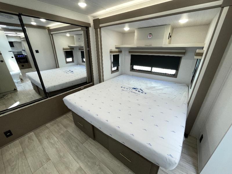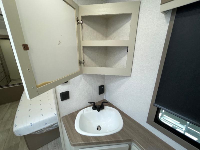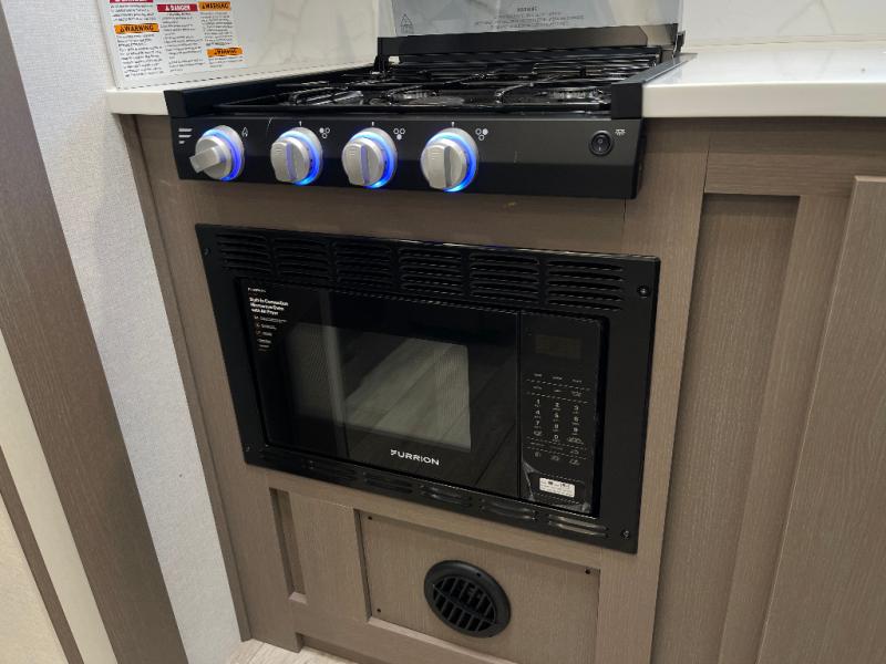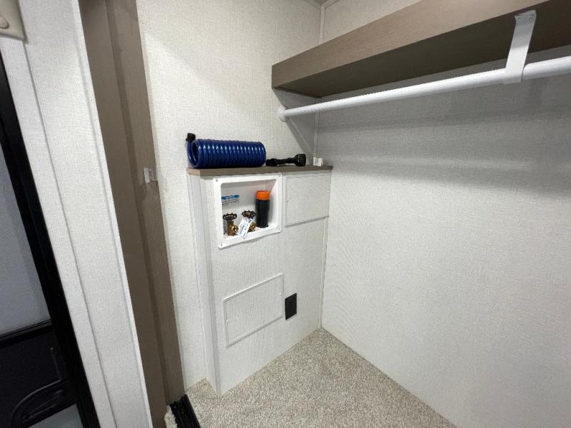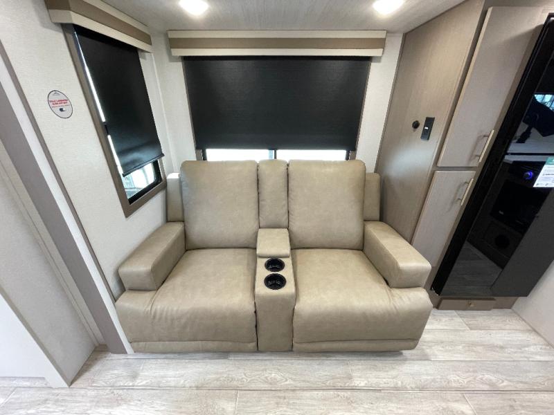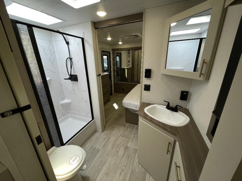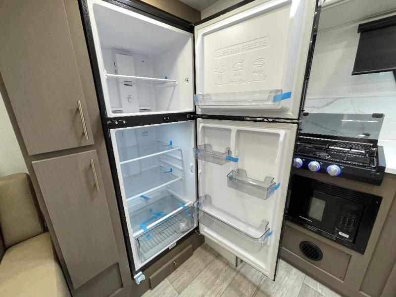 As you step into this travel trailer, you’re greeted by a fully equipped front kitchen featuring a three-burner range, generous counter space, and a sleek 10.7 cu. ft. black-glass refrigerator housed in the slide out giving you everything you need to prepare meals with ease. The slide out also includes a tri-fold sofa that provides a comfortable place to relax and can convert into extra sleeping space when needed. Between the sofa and refrigerator, a convenient pantry keeps all your dry goods organized. Across the way, the booth dinette offers the perfect spot to share meals, play games, or unwind while enjoying the telescoping 50" TV after a full day of adventure. Moving through the center of the trailer, the walk-through bathroom features a 30" x 36" shower with a skylight, a linen closet for towels and toiletries, and a porcelain foot-flush toilet so you can freshen up without relying on campsite facilities. At the rear, the private bedroom provides a spacious retreat with a king bed housed in its own slide out for added comfort, along with a dresser and a large rear wardrobe to keep clothing and gear neatly stored. For added convenience, the bedroom also includes its own second entry door.