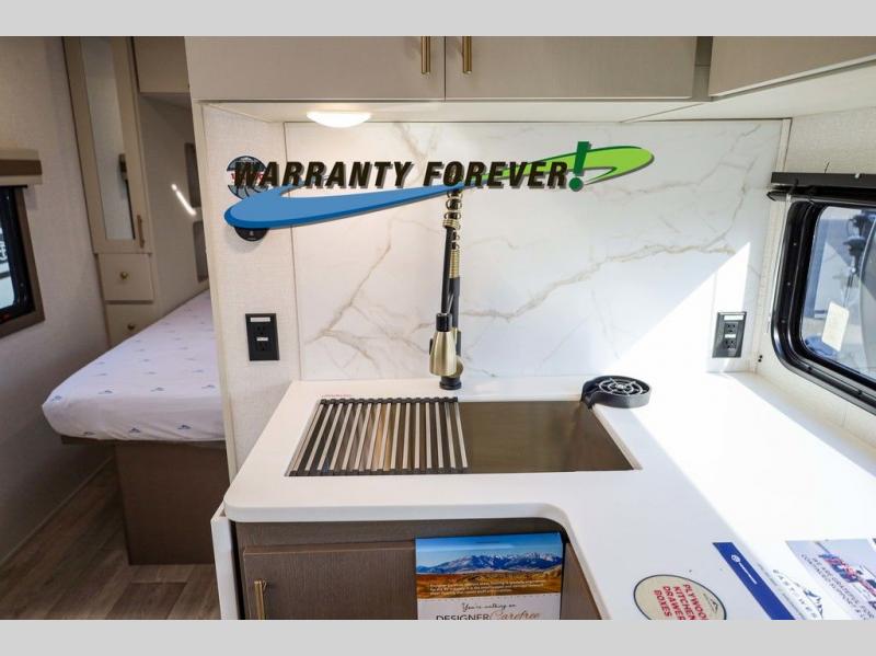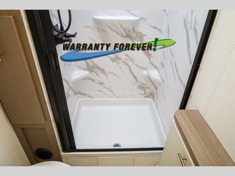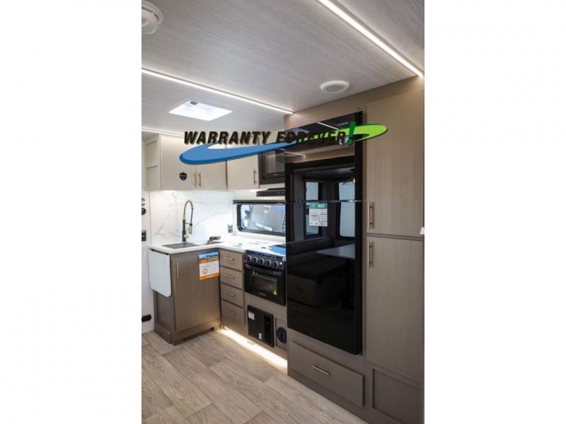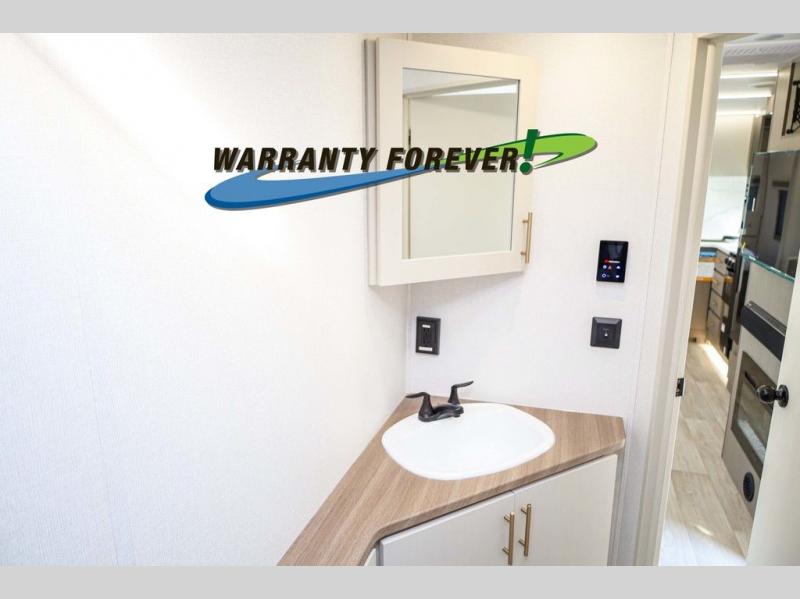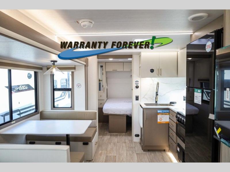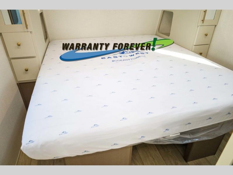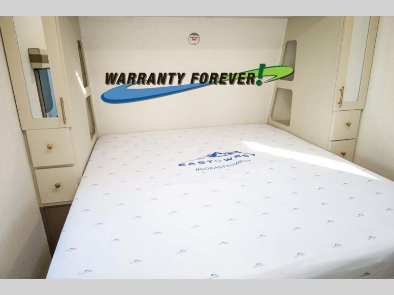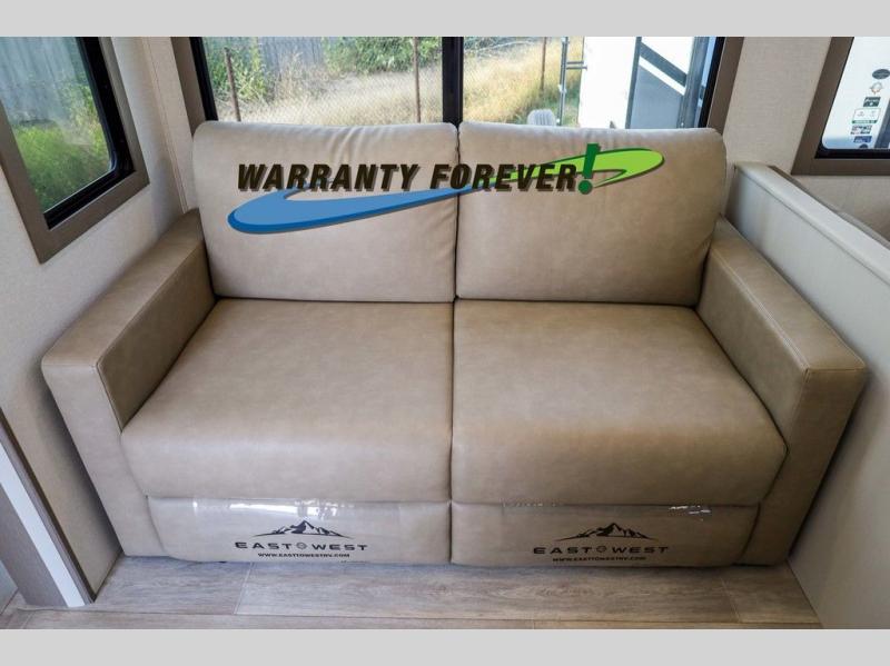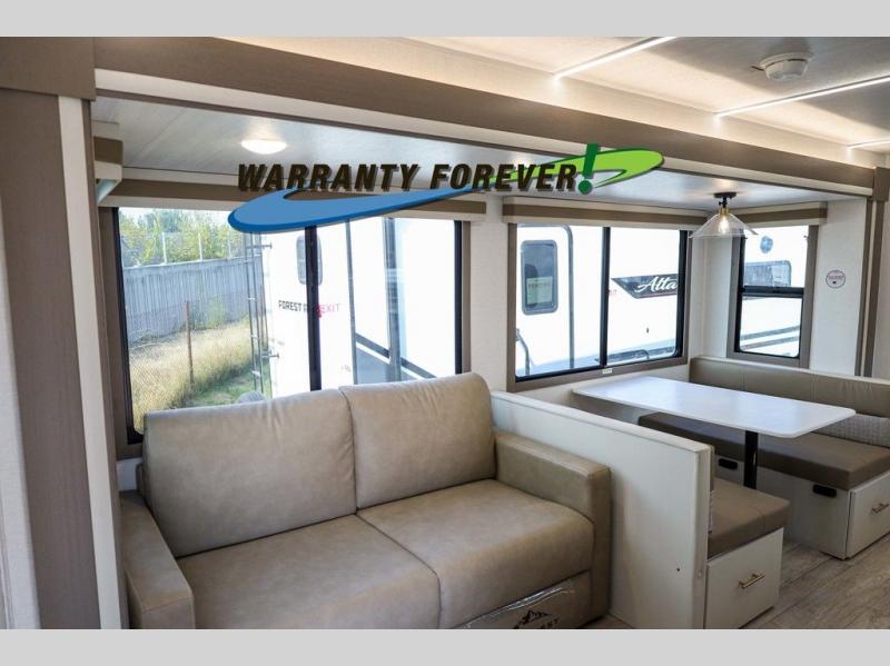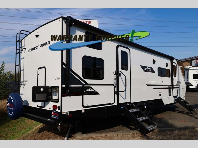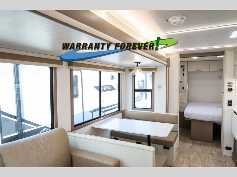 Each Alta travel trailer or toy hauler by EAST TO WEST is constructed with a 5" vacuum bonded roof, an enclosed and heated underbelly, and diamond plate front rock guard for added protection. Outside, you'll find marine-grade exterior speakers, a universal docking station, and back-up camera prep that can be added to make maneuvering in and out of campgrounds easier than ever. Inside, there are 4k interior LED lights, solid pressed membrane countertops, black roller shades, and many more interior comforts you are sure to love.