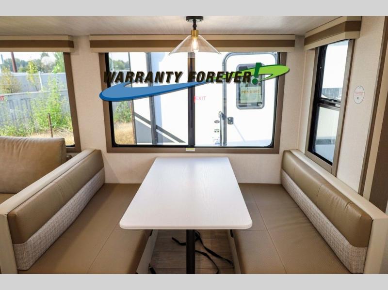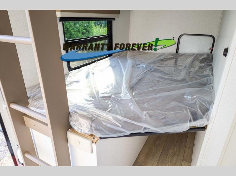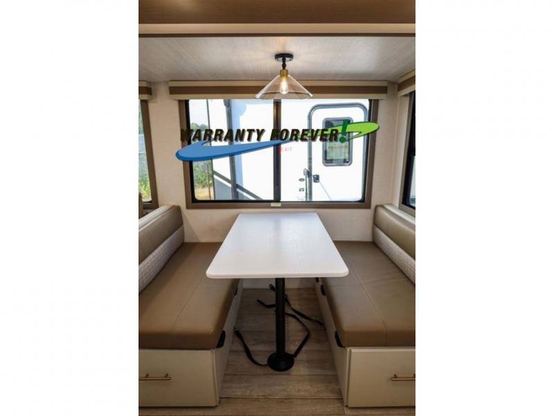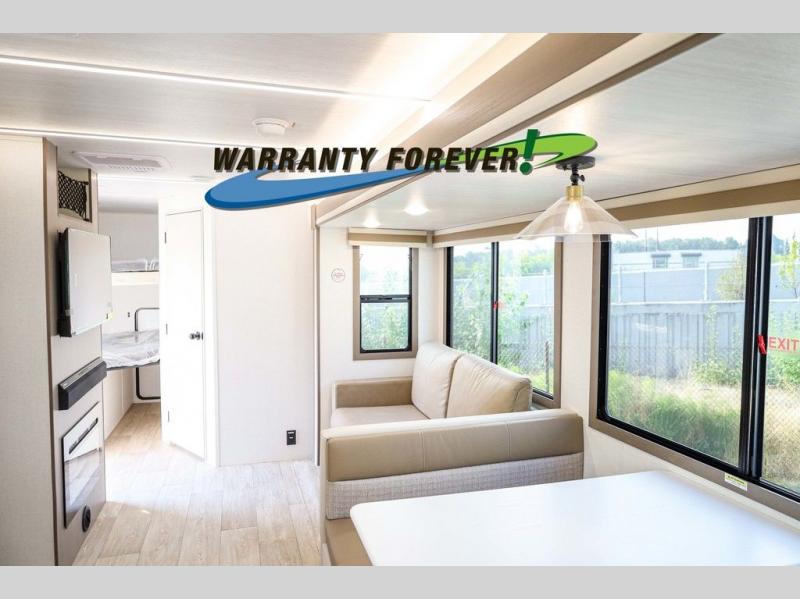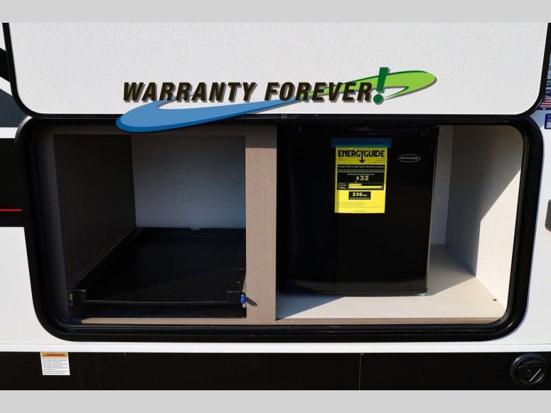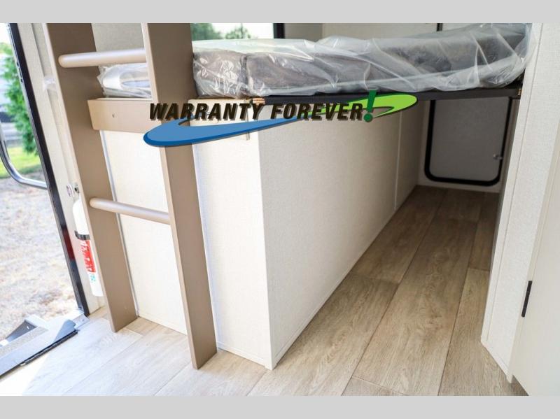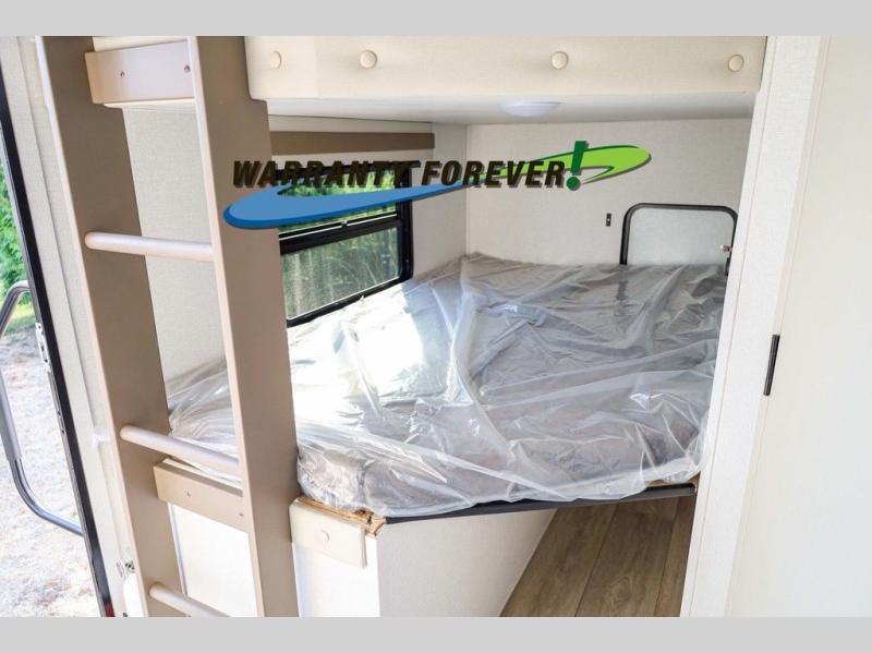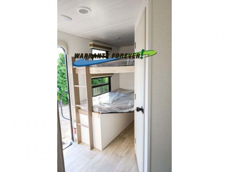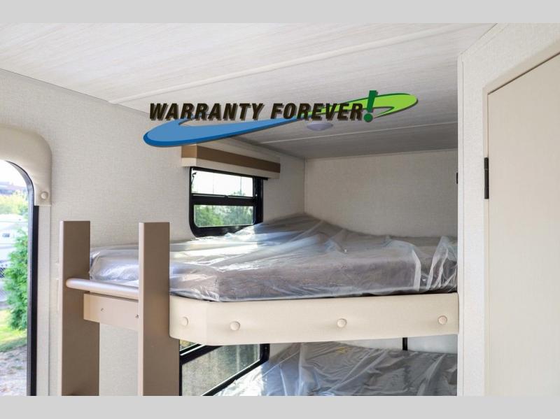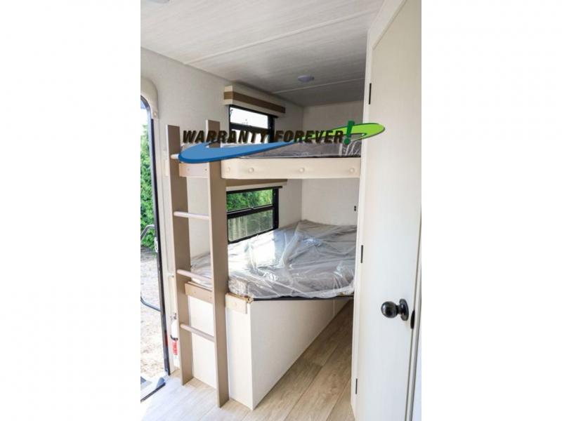 This is the ultimate family-friendly travel trailer thanks to the double-size bunks with bike storage in the back. A king bed in the front bedroom will make you feel right at home, plus there are dual wardrobes and dual nightstands for your things. The large slide out in the main living area won't leave you feeling confined, and the tri-fold sofa and booth dinette will provide comfortable seating space. The chef of your group can start lunch on the outside kitchen while the kids grab their scooters from the pass-through storage. And don't forget there is a universal docking station to quickly access your utilities when needed.