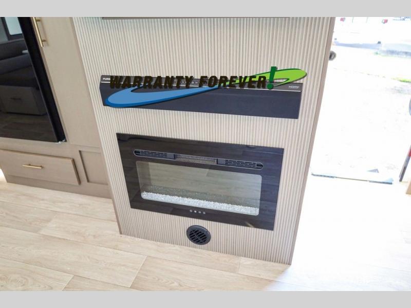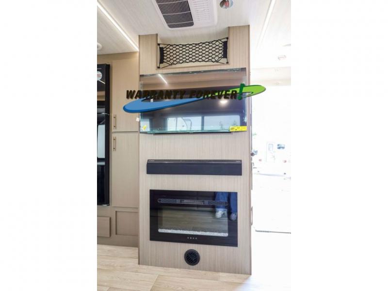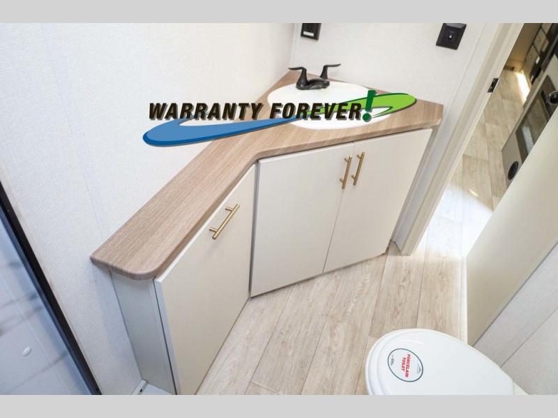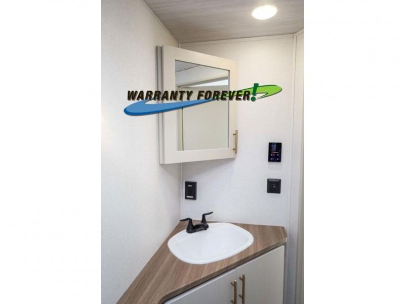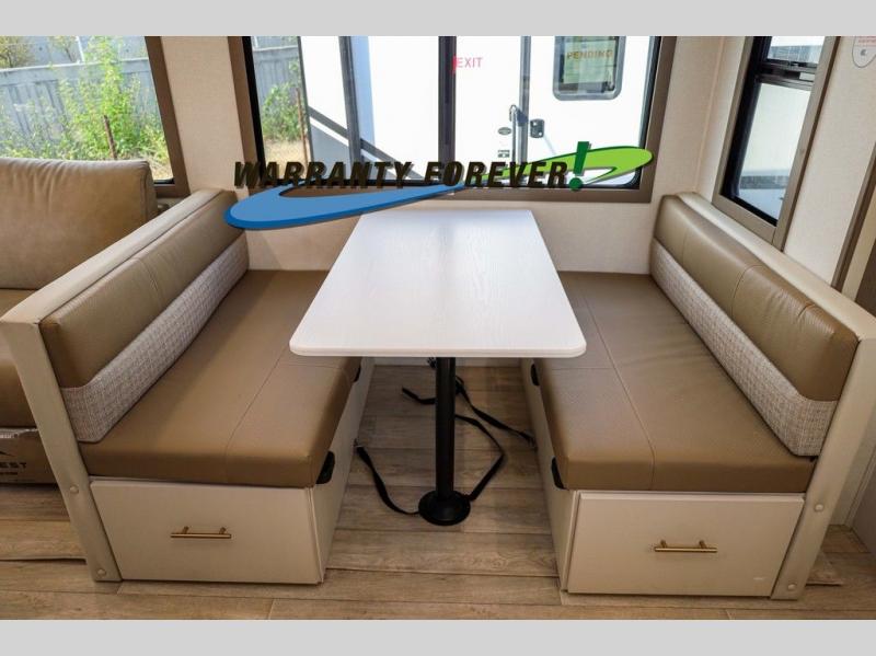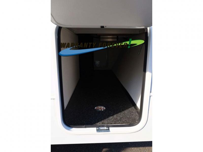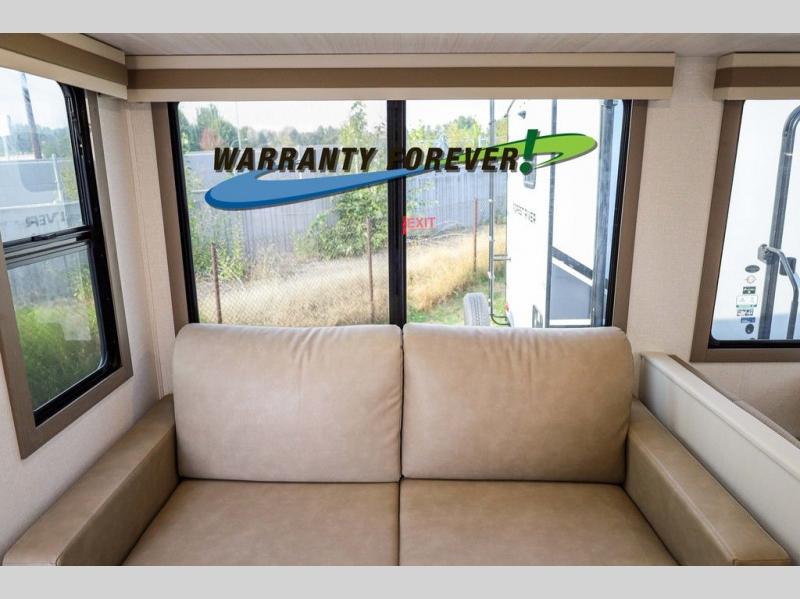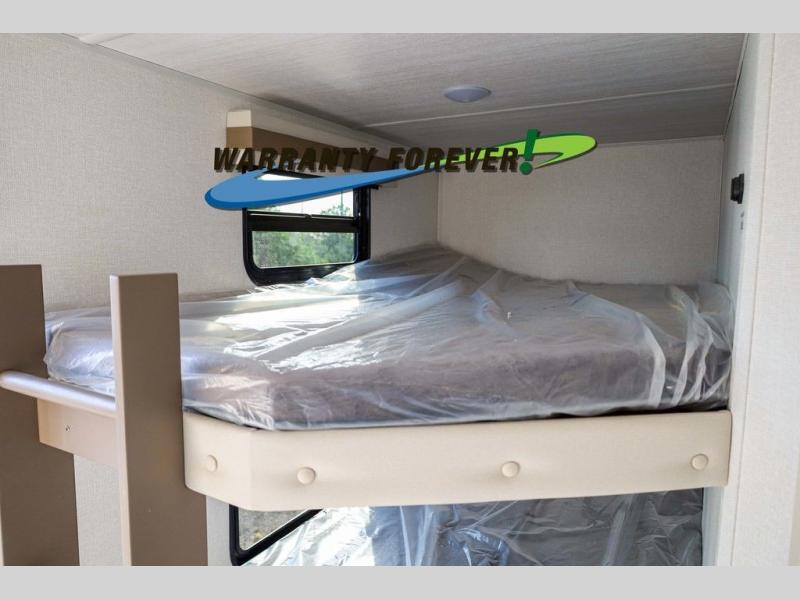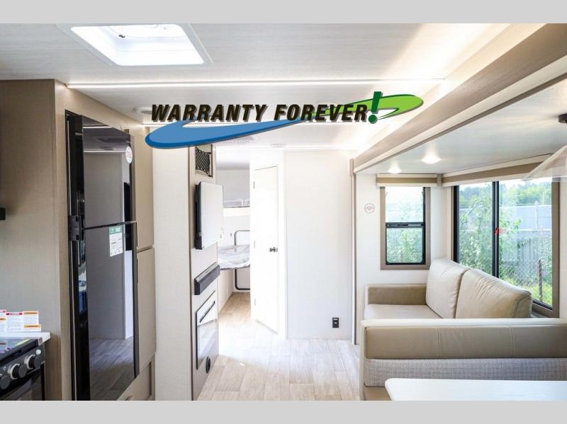 This is the ultimate family-friendly travel trailer thanks to the double-size bunks with bike storage in the back. A king bed in the front bedroom will make you feel right at home, plus there are dual wardrobes and dual nightstands for your things. The large slide out in the main living area won't leave you feeling confined, and the tri-fold sofa and booth dinette will provide comfortable seating space. The chef of your group can start lunch on the outside kitchen while the kids grab their scooters from the pass-through storage. And don't forget there is a universal docking station to quickly access your utilities when needed.