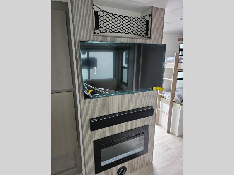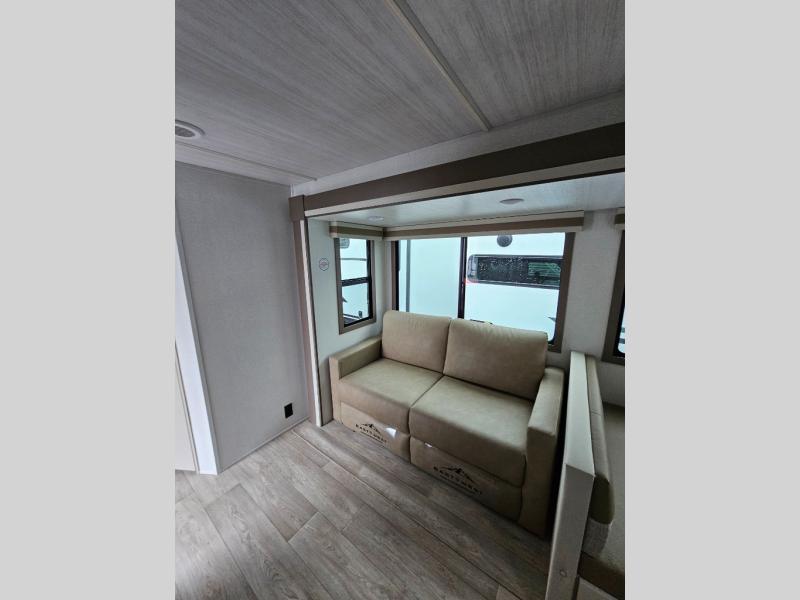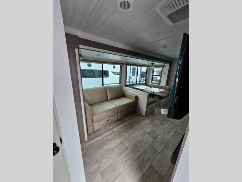 This is the ultimate family-friendly travel trailer thanks to the double-size bunks with bike storage in the back. A king bed in the front bedroom will make you feel right at home, plus there are dual wardrobes and dual nightstands for your things. The large slide out in the main living area won't leave you feeling confined, and the tri-fold sofa and booth dinette will provide comfortable seating space. The chef of your group can start lunch on the outside kitchen while the kids grab their scooters from the pass-through storage. And don't forget there is a universal docking station to quickly access your utilities when needed.
