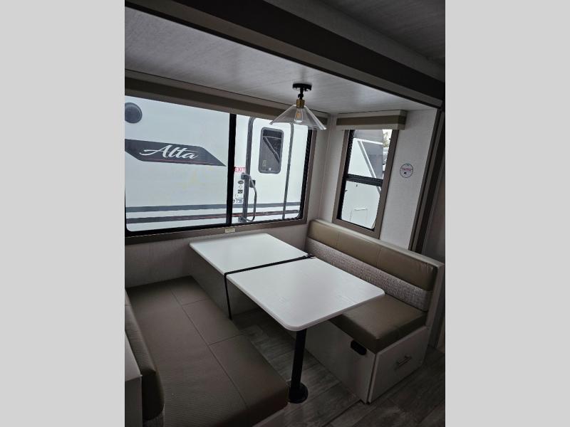 Each Alta travel trailer or toy hauler by EAST TO WEST is constructed with a 5" vacuum bonded roof, an enclosed and heated underbelly, and diamond plate front rock guard for added protection. Outside, you'll find marine-grade exterior speakers, a universal docking station, and back-up camera prep that can be added to make maneuvering in and out of campgrounds easier than ever. Inside, there are 4k interior LED lights, solid pressed membrane countertops, black roller shades, and many more interior comforts you are sure to love.