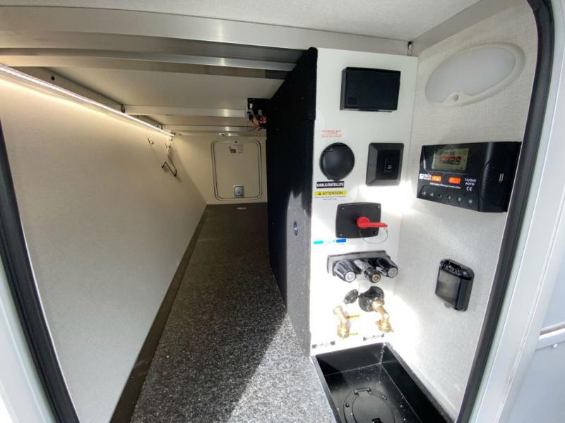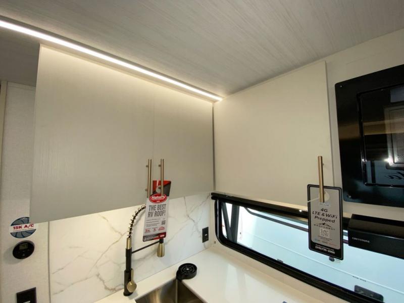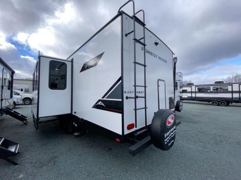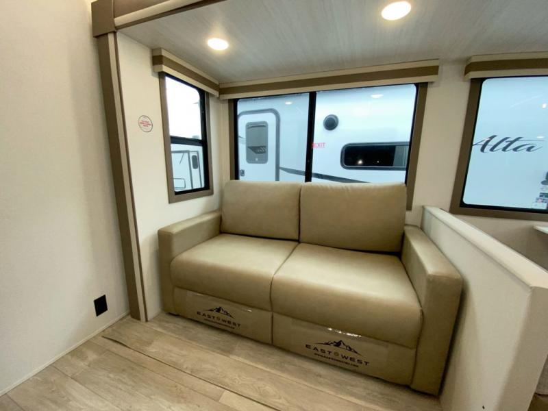 Each Alta travel trailer or toy hauler by EAST TO WEST is constructed with a 5" vacuum bonded roof, an enclosed and heated underbelly, and diamond plate front rock guard for added protection. Outside, you'll find marine-grade exterior speakers, a universal docking station, and back-up camera prep that can be added to make maneuvering in and out of campgrounds easier than ever. Inside, there are 4k interior LED lights, solid pressed membrane countertops, black roller shades, and many more interior comforts you are sure to love.