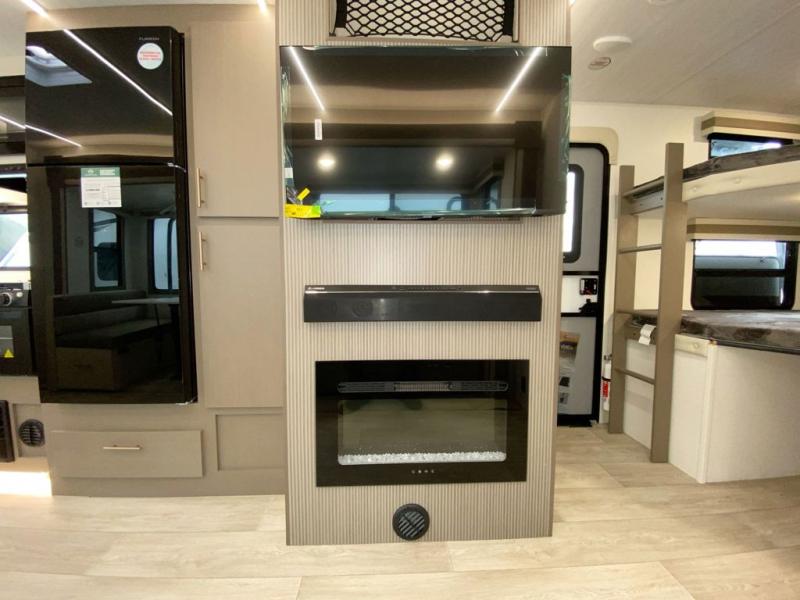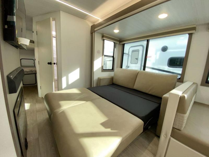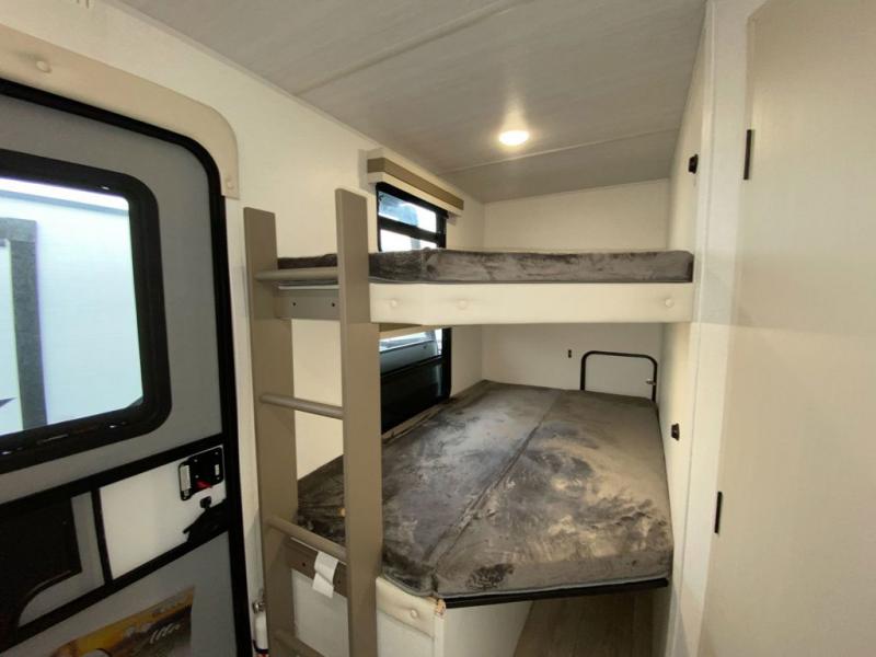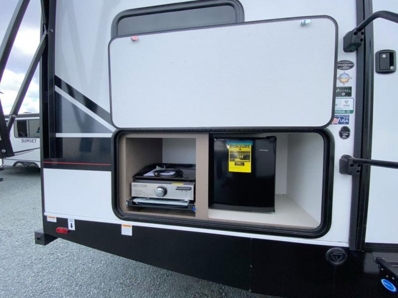 This is the ultimate family-friendly travel trailer thanks to the double-size bunks with bike storage in the back. A king bed in the front bedroom will make you feel right at home, plus there are dual wardrobes and dual nightstands for your things. The large slide out in the main living area won't leave you feeling confined, and the tri-fold sofa and booth dinette will provide comfortable seating space. The chef of your group can start lunch on the outside kitchen while the kids grab their scooters from the pass-through storage. And don't forget there is a universal docking station to quickly access your utilities when needed.