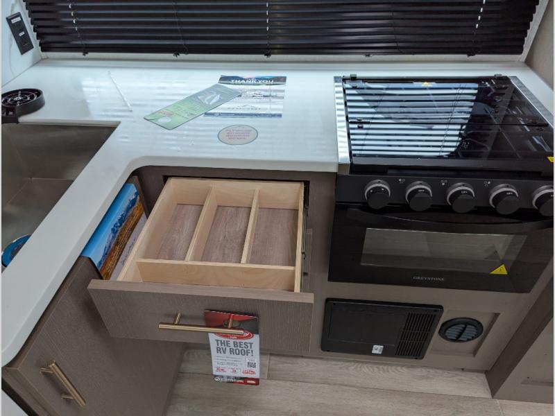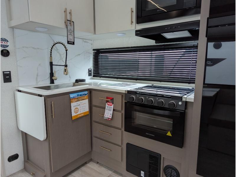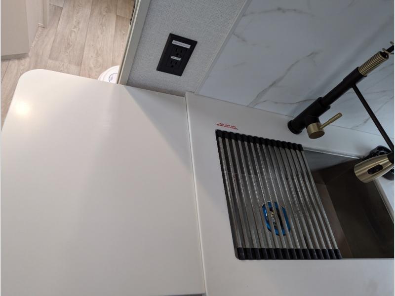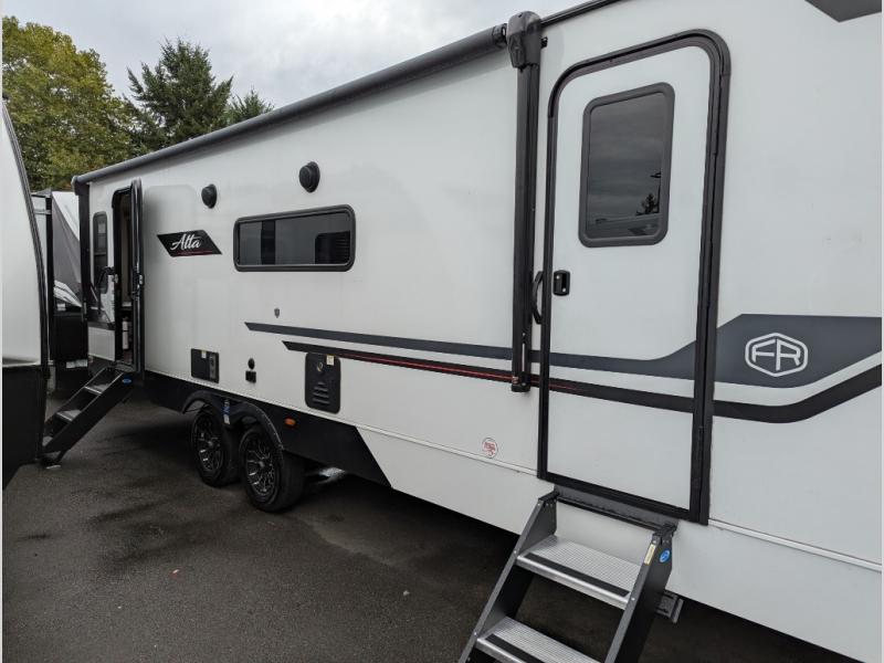 Each Alta travel trailer or toy hauler by EAST TO WEST is constructed with a 5" vacuum bonded roof, an enclosed and heated underbelly, and diamond plate front rock guard for added protection. Outside, you'll find marine-grade exterior speakers, a universal docking station, and back-up camera prep that can be added to make maneuvering in and out of campgrounds easier than ever. Inside, there are 4k interior LED lights, solid pressed membrane countertops, black roller shades, and many more interior comforts you are sure to love.