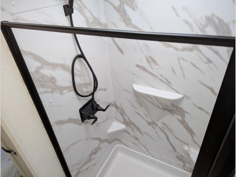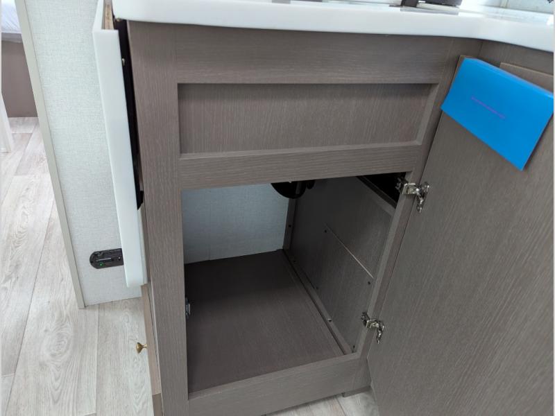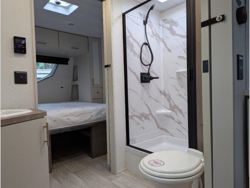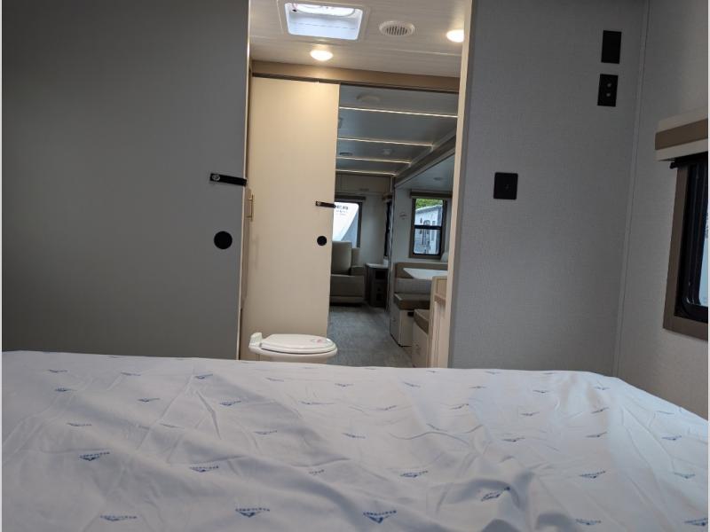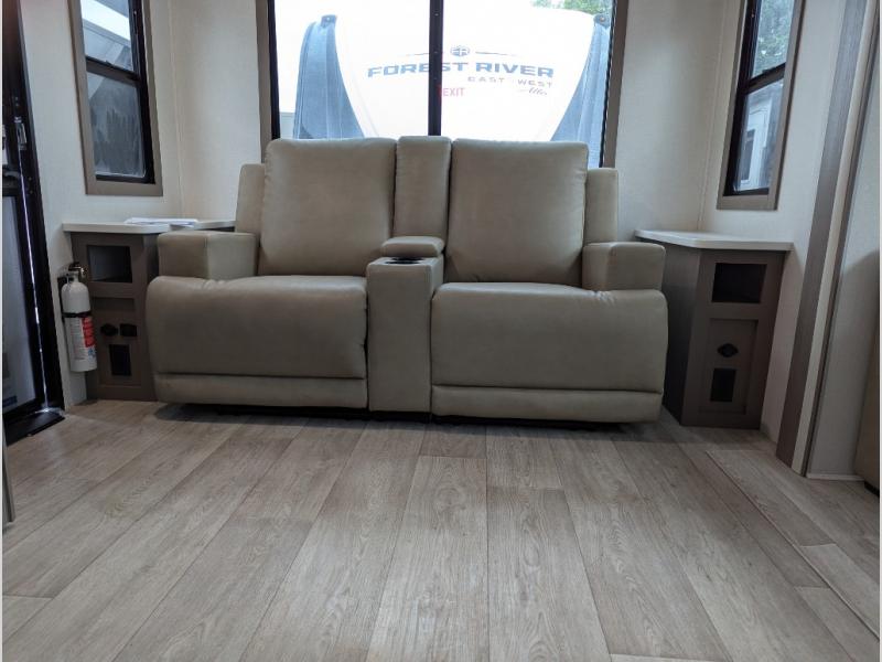 You'll feel right at home in this rear living travel trailer that includes theater seats and a front master bedroom with a king bed. The walk-through bath includes a medicine cabinet and a shower skylight to let natural light in, and the bedroom includes its own exterior entry door for convenience. When you're not relaxing outdoors under the 21' power awning with LED lights, you can play a game at the booth dinette or relax on the tri-fold sofa. This model also includes a pass-through storage for your larger camp gear and a universal docking station for easy access to your hookups.