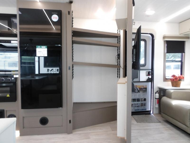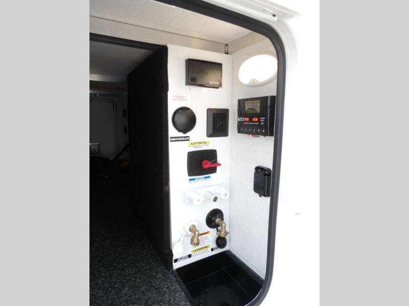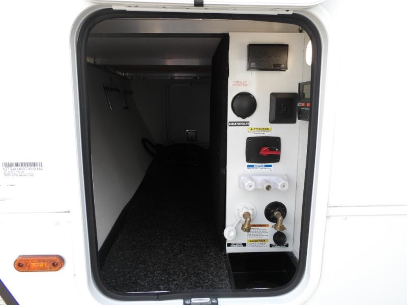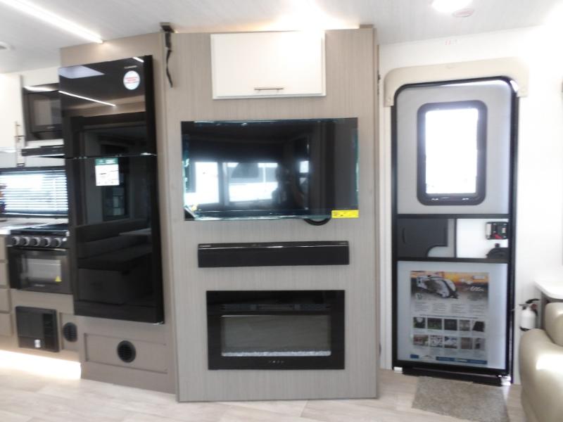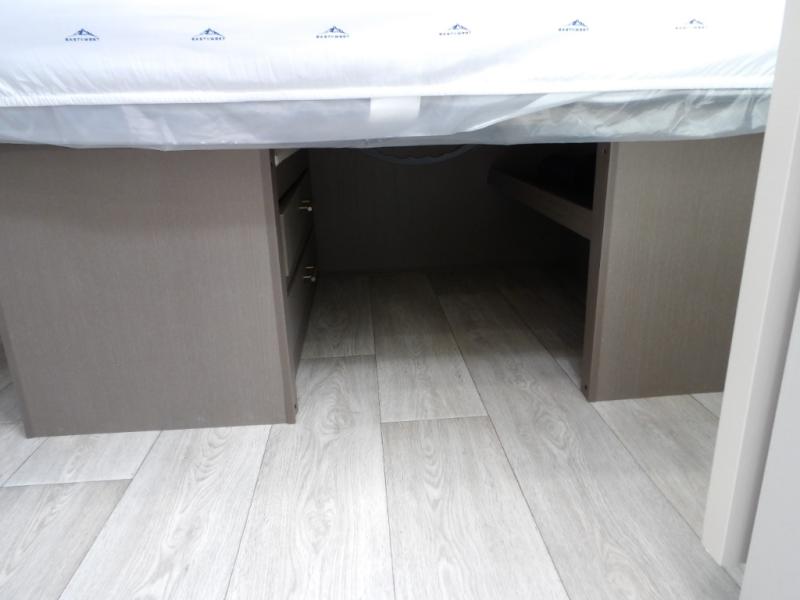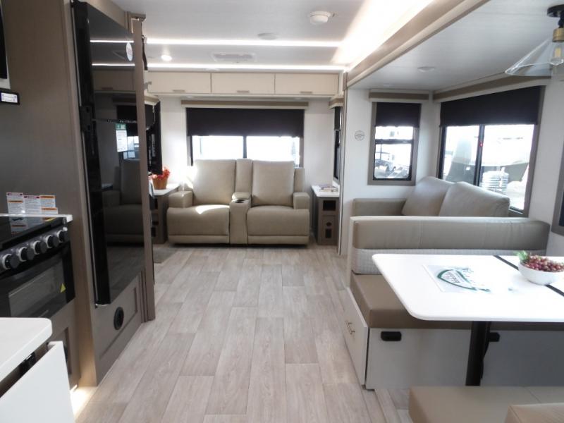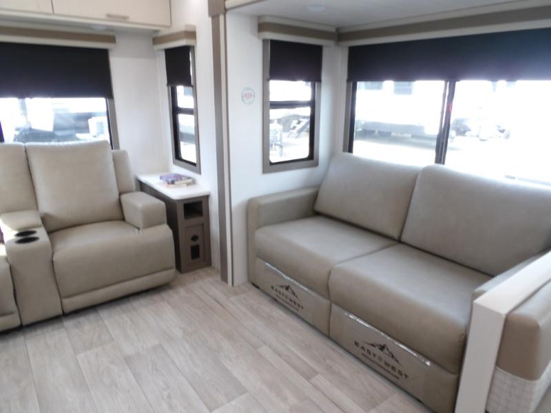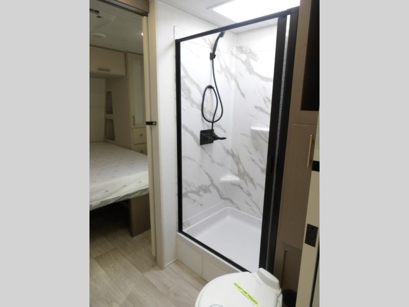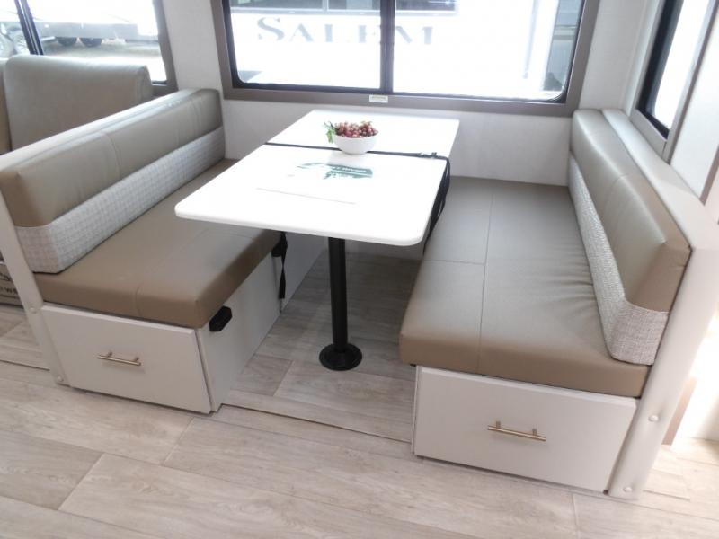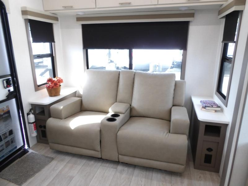 You'll feel right at home in this rear living travel trailer that includes theater seats and a front master bedroom with a king bed. The walk-through bath includes a medicine cabinet and a shower skylight to let natural light in, and the bedroom includes its own exterior entry door for convenience. When you're not relaxing outdoors under the 21' power awning with LED lights, you can play a game at the booth dinette or relax on the tri-fold sofa. This model also includes a pass-through storage for your larger camp gear and a universal docking station for easy access to your hookups.