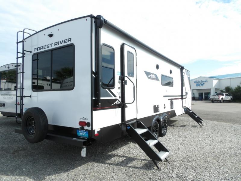 Each Alta travel trailer or toy hauler by EAST TO WEST is constructed with a 5" vacuum bonded roof, an enclosed and heated underbelly, and diamond plate front rock guard for added protection. Outside, you'll find marine-grade exterior speakers, a universal docking station, and back-up camera prep that can be added to make maneuvering in and out of campgrounds easier than ever. Inside, there are 4k interior LED lights, solid pressed membrane countertops, black roller shades, and many more interior comforts you are sure to love.