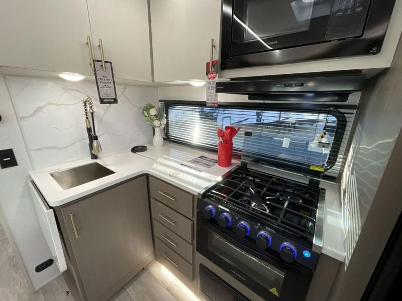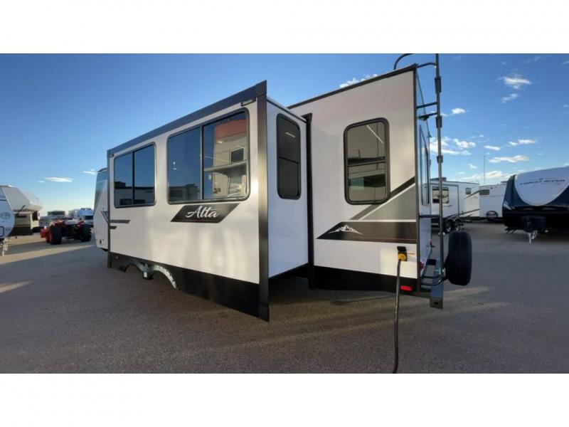 Each Alta travel trailer or toy hauler by EAST TO WEST is constructed with a 5" vacuum bonded roof, an enclosed and heated underbelly, and diamond plate front rock guard for added protection. Outside, you'll find marine-grade exterior speakers, a universal docking station, and back-up camera prep that can be added to make maneuvering in and out of campgrounds easier than ever. Inside, there are 4k interior LED lights, solid pressed membrane countertops, black roller shades, and many more interior comforts you are sure to love.
