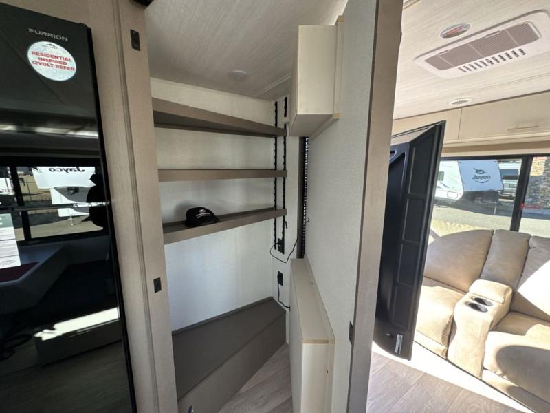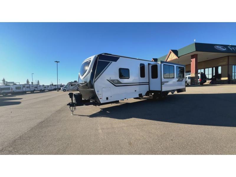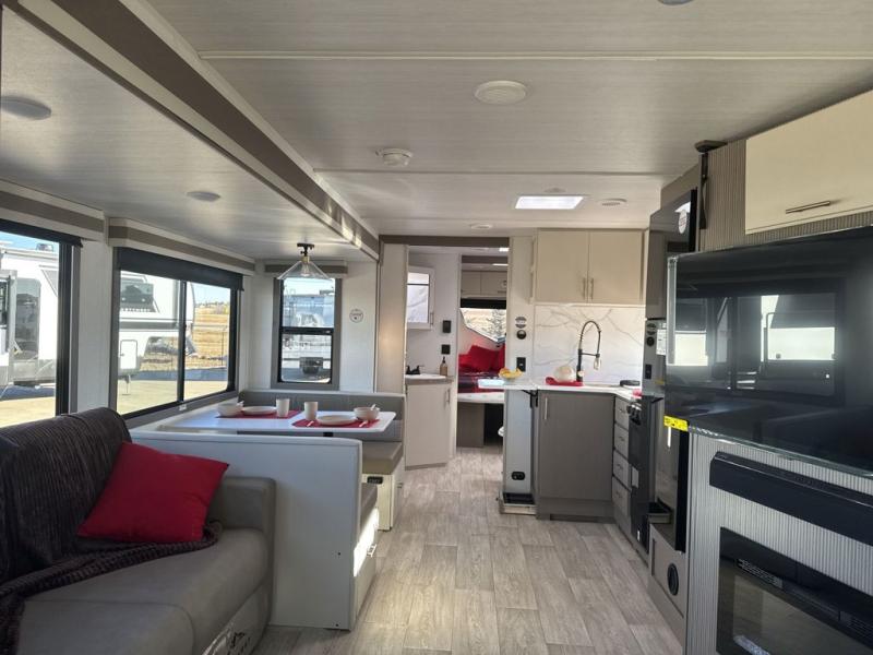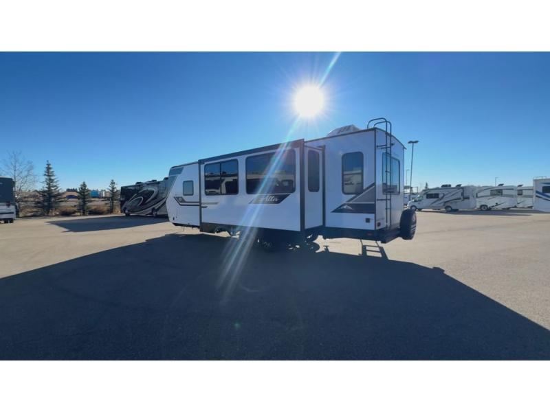You'll feel right at home in this rear living travel trailer that includes theater seats and a front master bedroom with a king bed. The walk-through bath includes a medicine cabinet and a shower skylight to let natural light in, and the bedroom includes its own exterior entry door for convenience. When you're not relaxing outdoors under the 21' power awning with LED lights, you can play a game at the booth dinette or relax on the tri-fold sofa. This model also includes a pass-through storage for your larger camp gear and a universal docking station for easy access to your hookups.