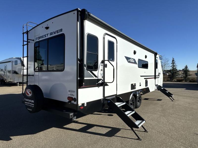 Each Alta travel trailer or toy hauler by EAST TO WEST is constructed with a 5" vacuum bonded roof, an enclosed and heated underbelly, and diamond plate front rock guard for added protection. Outside, you'll find marine-grade exterior speakers, a universal docking station, and back-up camera prep that can be added to make maneuvering in and out of campgrounds easier than ever. Inside, there are 4k interior LED lights, solid pressed membrane countertops, black roller shades, and many more interior comforts you are sure to love.