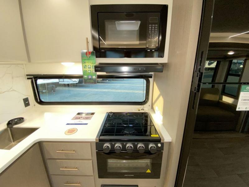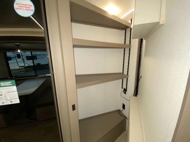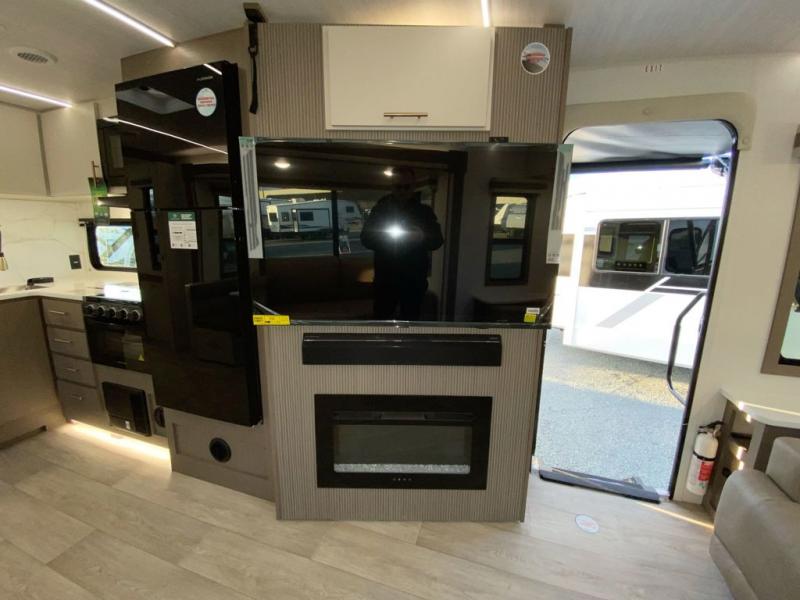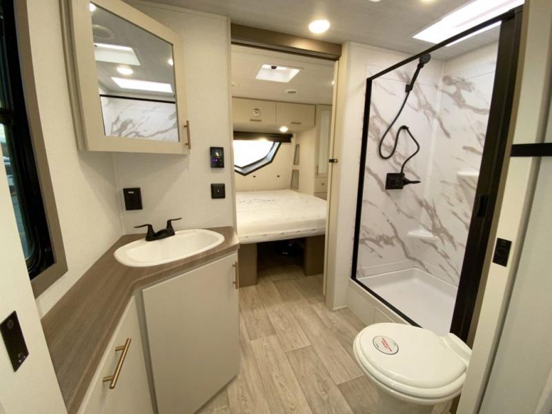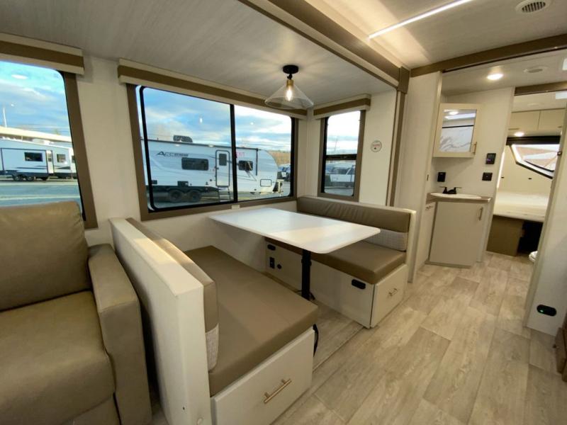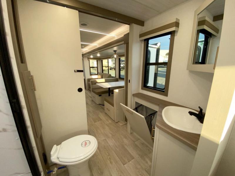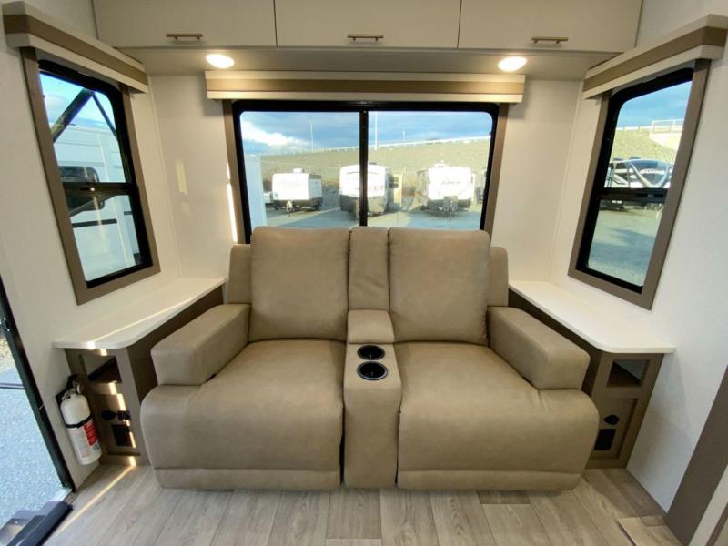 You'll feel right at home in this rear living travel trailer that includes theater seats and a front master bedroom with a king bed. The walk-through bath includes a medicine cabinet and a shower skylight to let natural light in, and the bedroom includes its own exterior entry door for convenience. When you're not relaxing outdoors under the 21' power awning with LED lights, you can play a game at the booth dinette or relax on the tri-fold sofa. This model also includes a pass-through storage for your larger camp gear and a universal docking station for easy access to your hookups.