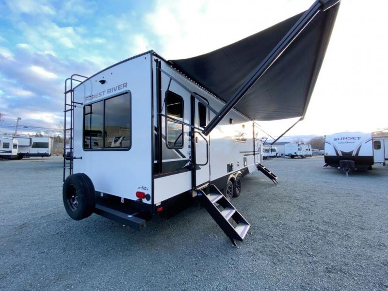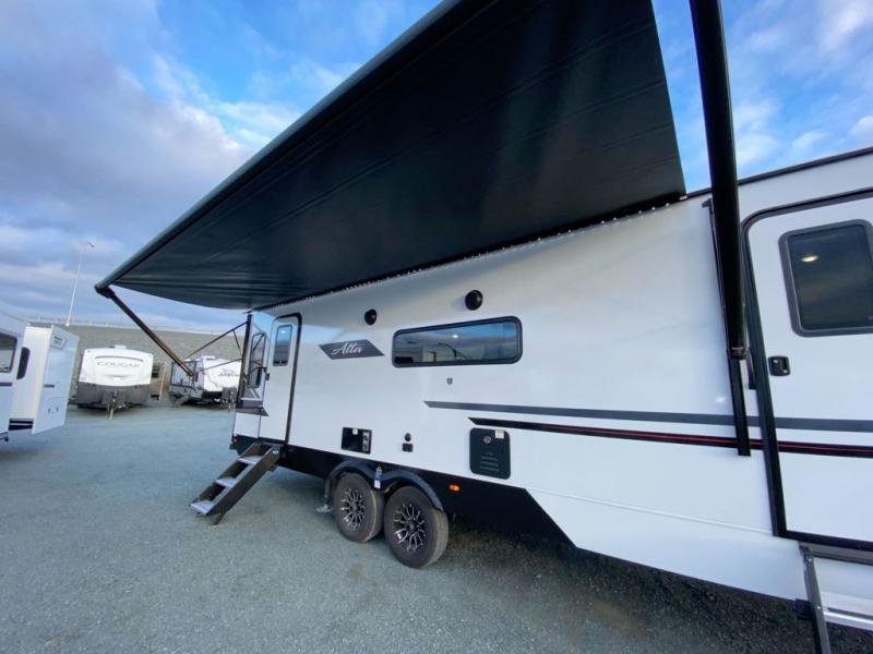 Each Alta travel trailer or toy hauler by EAST TO WEST is constructed with a 5" vacuum bonded roof, an enclosed and heated underbelly, and diamond plate front rock guard for added protection. Outside, you'll find marine-grade exterior speakers, a universal docking station, and back-up camera prep that can be added to make maneuvering in and out of campgrounds easier than ever. Inside, there are 4k interior LED lights, solid pressed membrane countertops, black roller shades, and many more interior comforts you are sure to love.