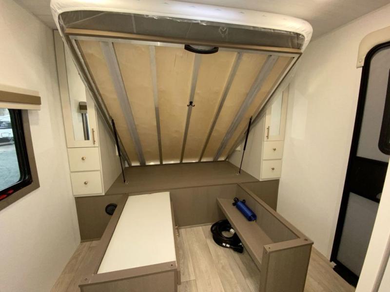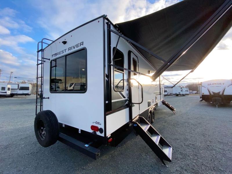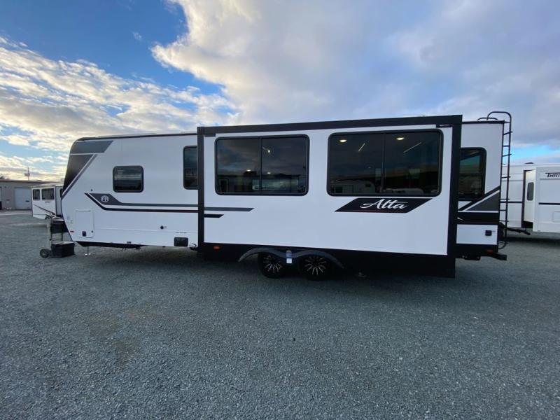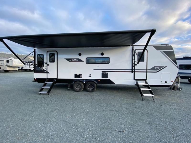 Each Alta travel trailer or toy hauler by EAST TO WEST is constructed with a 5" vacuum bonded roof, an enclosed and heated underbelly, and diamond plate front rock guard for added protection. Outside, you'll find marine-grade exterior speakers, a universal docking station, and back-up camera prep that can be added to make maneuvering in and out of campgrounds easier than ever. Inside, there are 4k interior LED lights, solid pressed membrane countertops, black roller shades, and many more interior comforts you are sure to love.